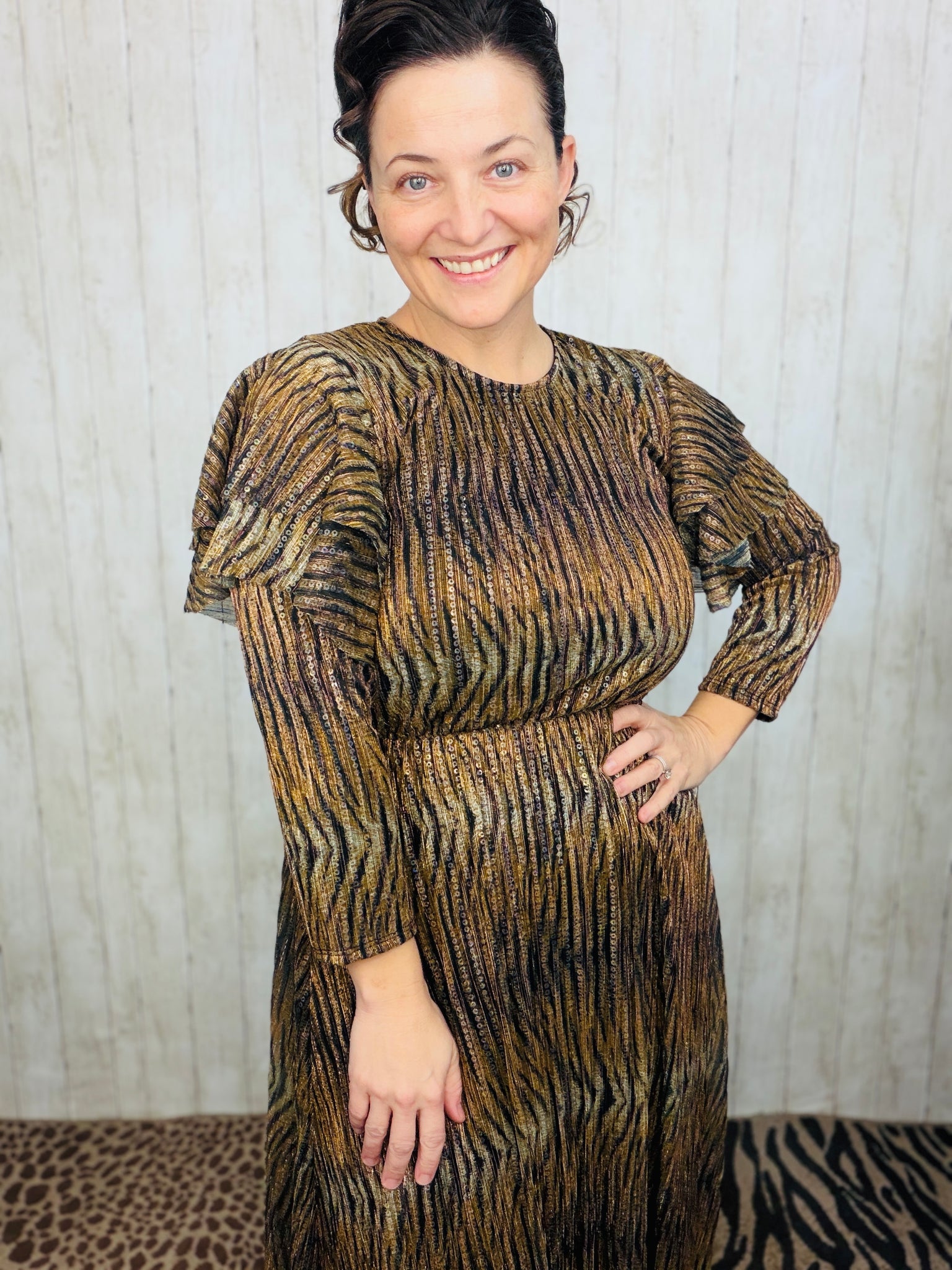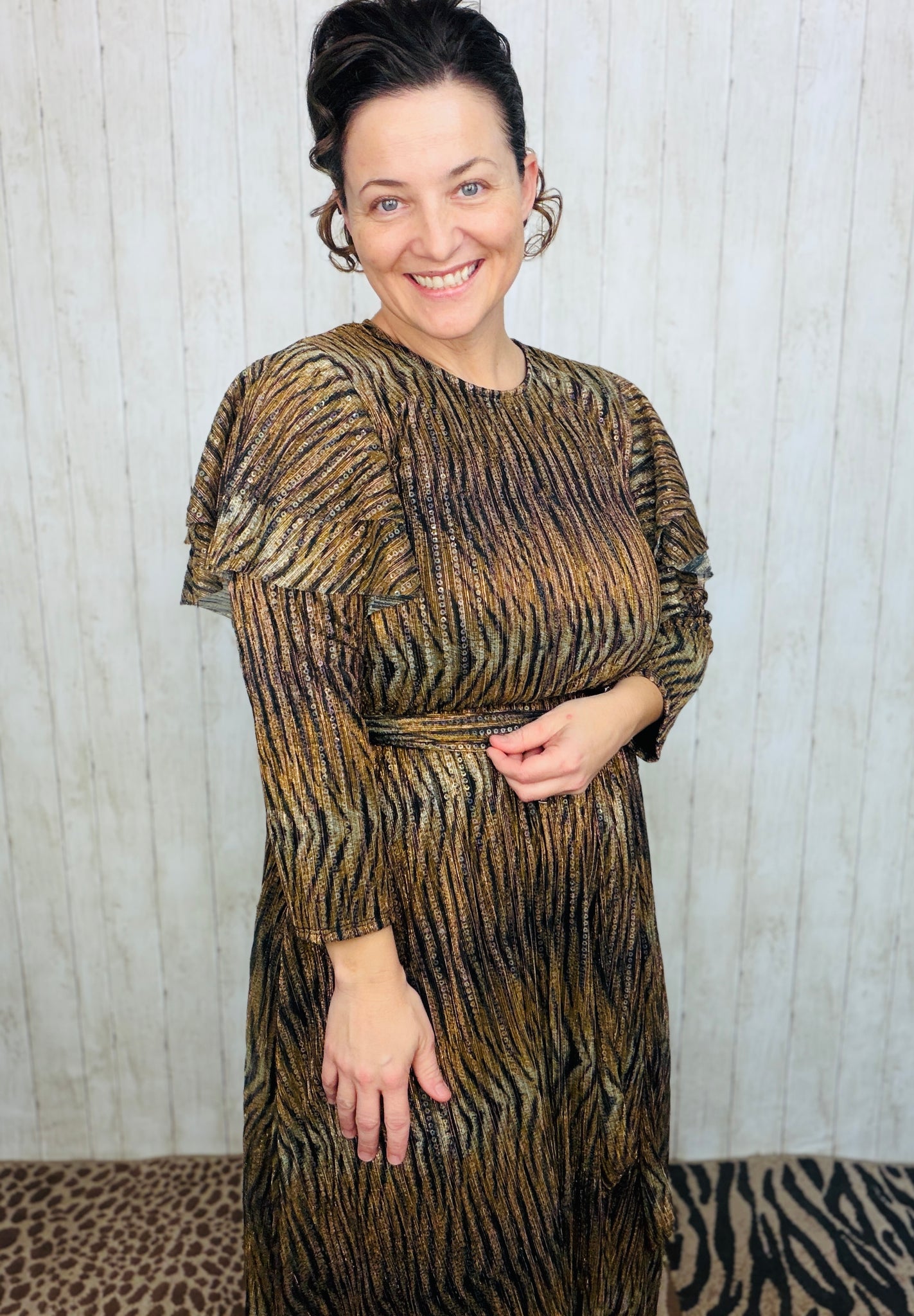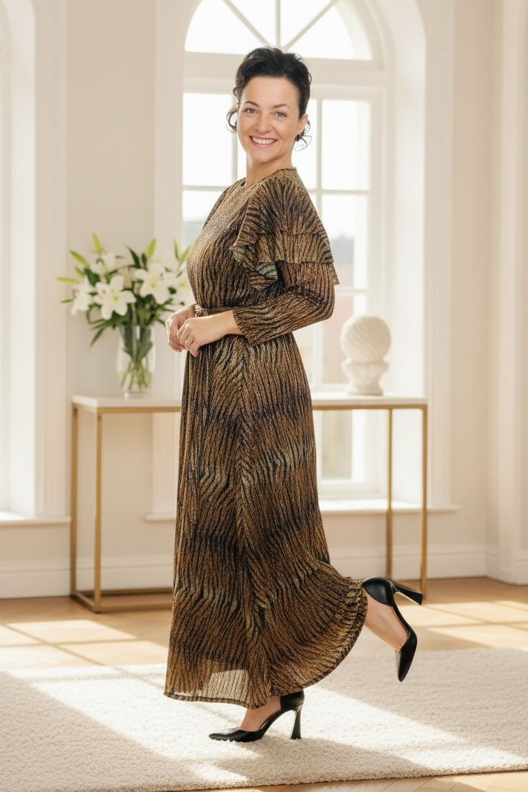 Animal Print & Sequins Belted Maxi Dress This striking maxi dress combines bold animal print with eye-catching sequin detailing for a statement-making look. Crafted from polyester and metallic fabric, it offers durability and a luxurious sheen. The dress features a fitted waist belt that defines your silhouette, while the three-quarter length sleeves provide elegant coverage. A full lining ensures comfort and opacity, making this piece both stylish and practical for evening events or special occasions.