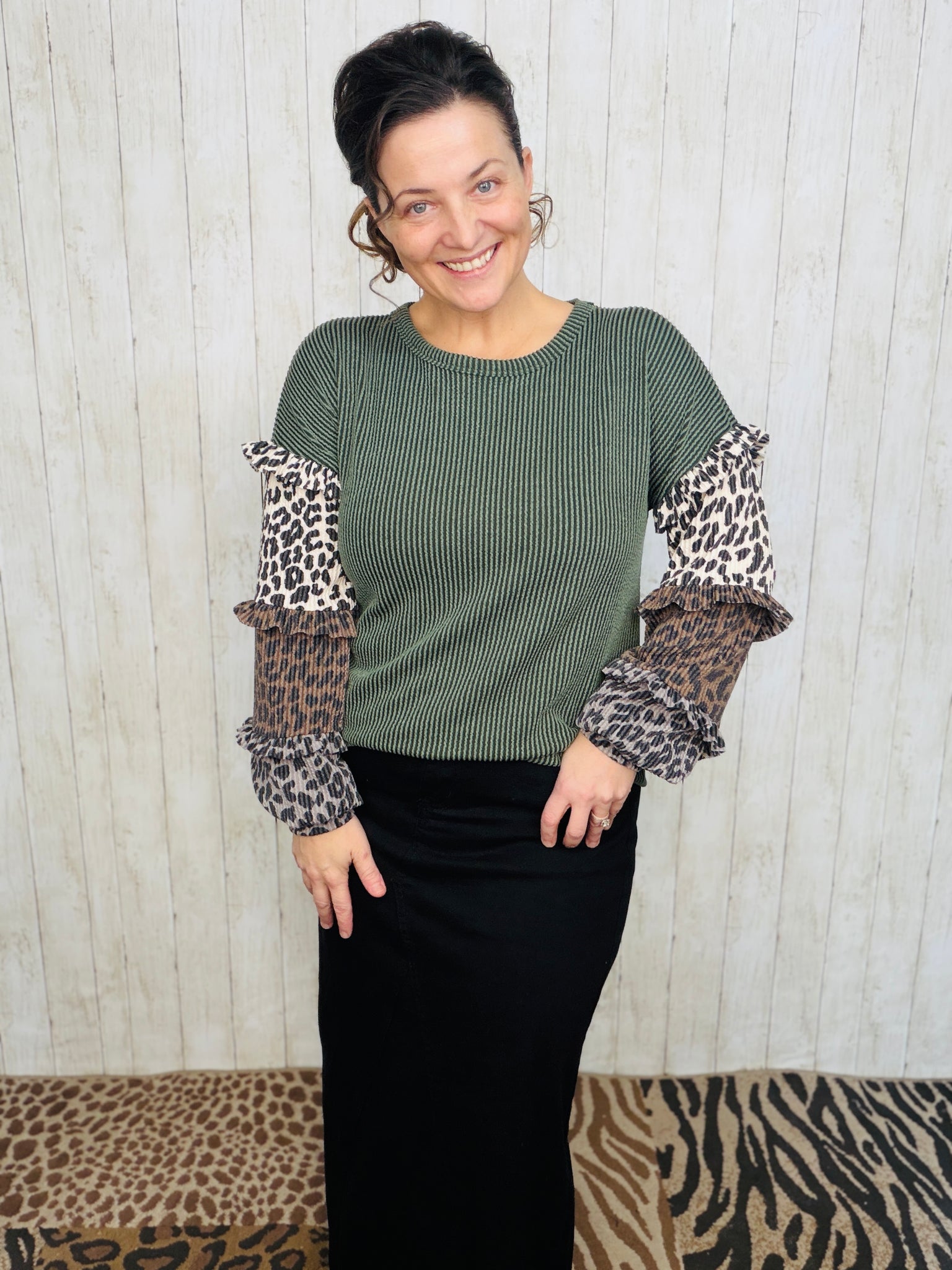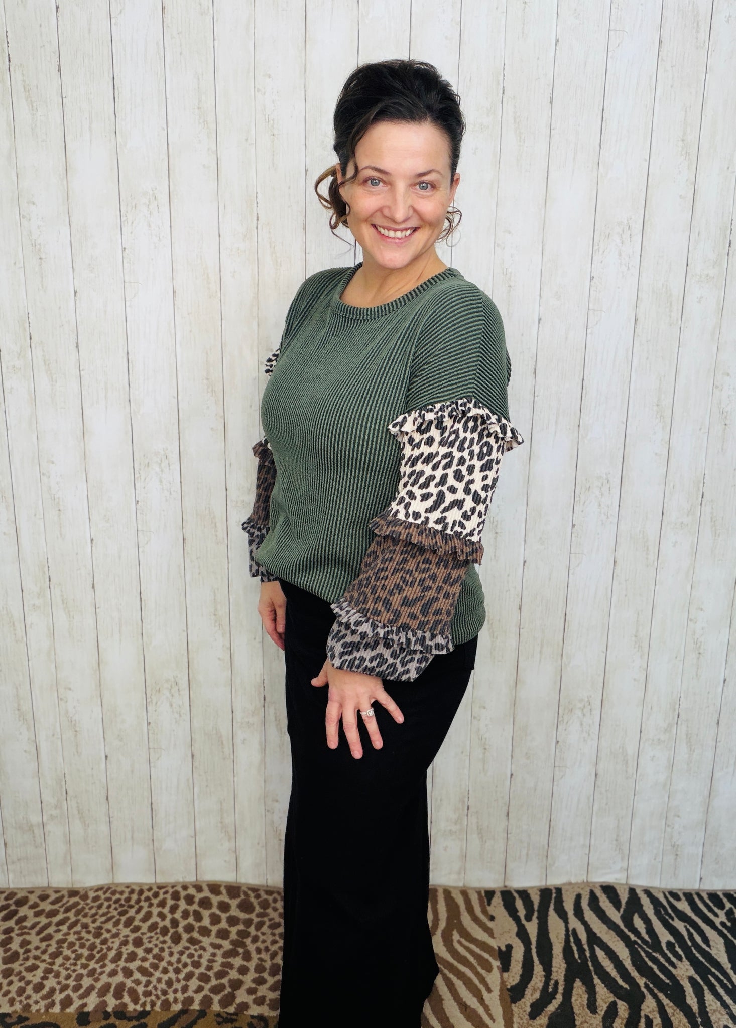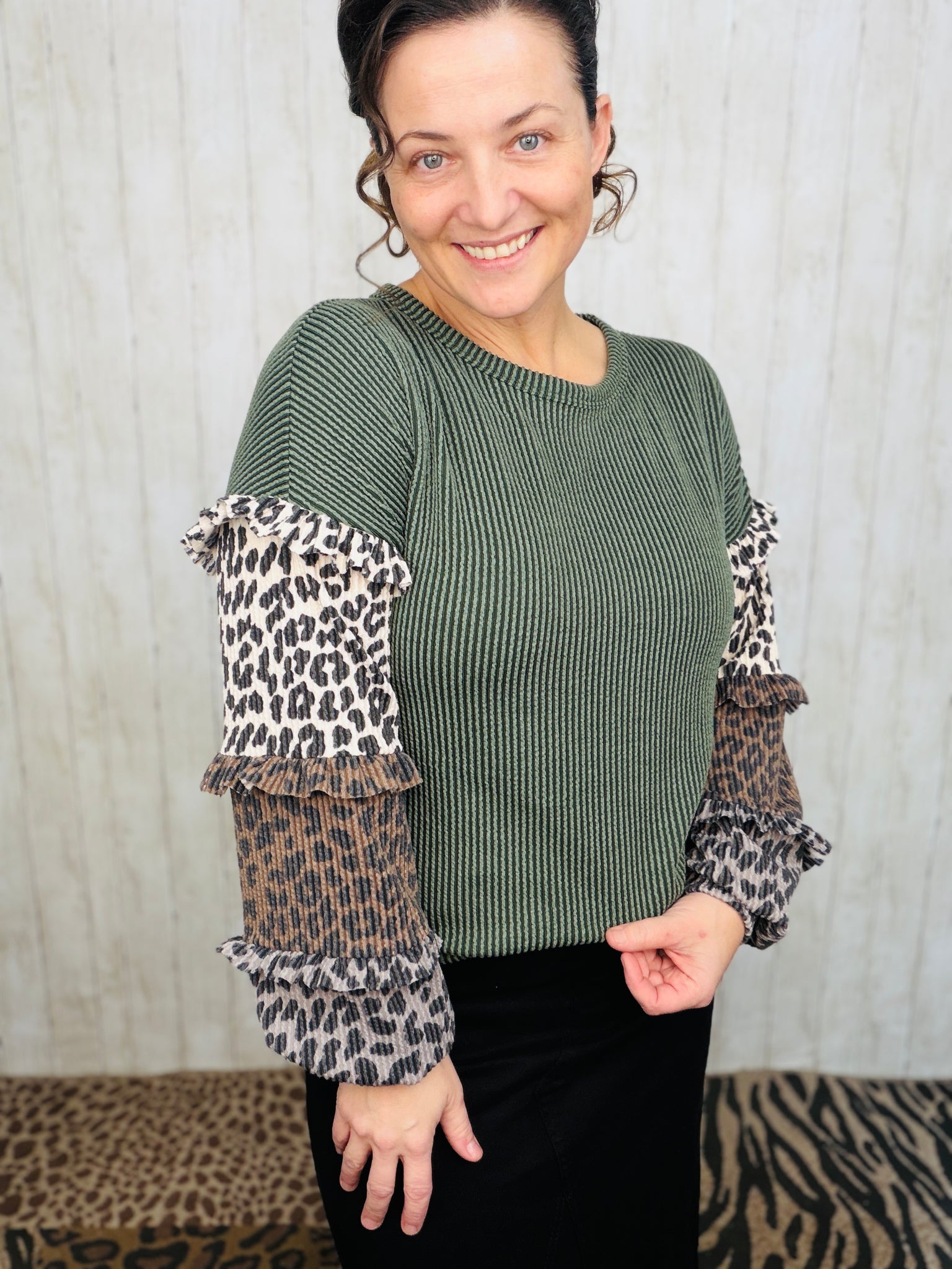 Isabella Ribbed Leopard & Olive Top Crafted from a breathable polyester-spandex blend, this long-sleeve top combines comfort with contemporary style. The olive body features layered ruffle detailing at the round neckline, while leopard-print sleeves add an urban edge. Ribbed fabric throughout provides structure and a flattering fit. Perfect for layering or wearing solo, this piece transitions seamlessly from casual outings to weekend gatherings. The contrasting textures and prints create visual interest without overwhelming your wardrobe.