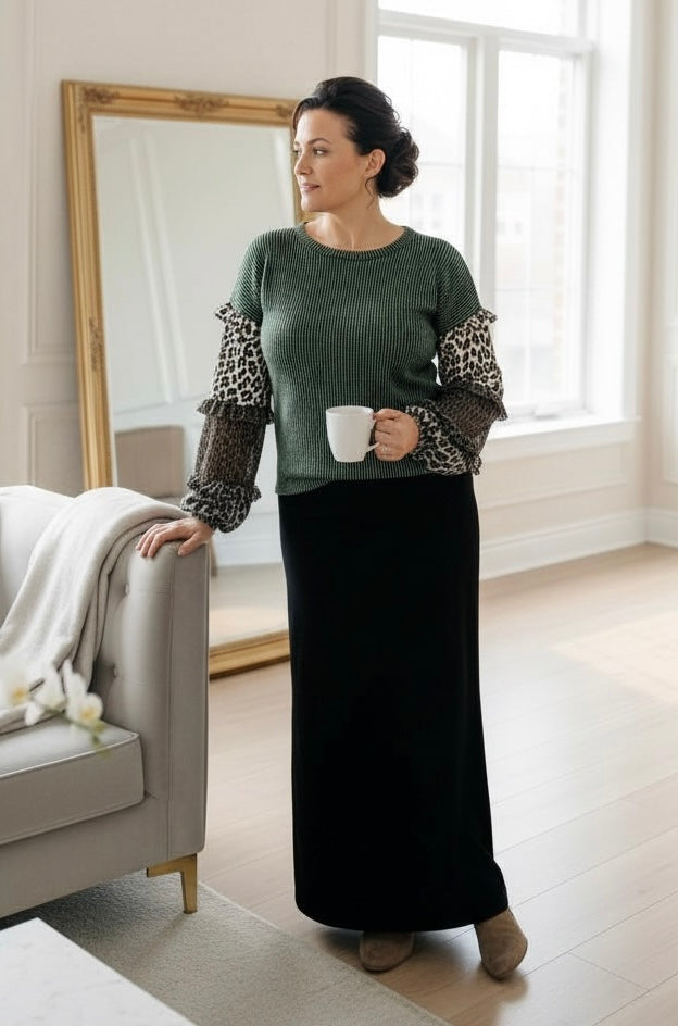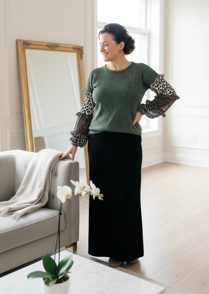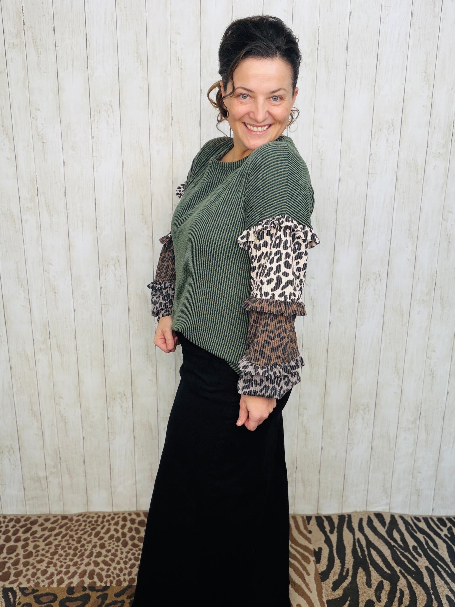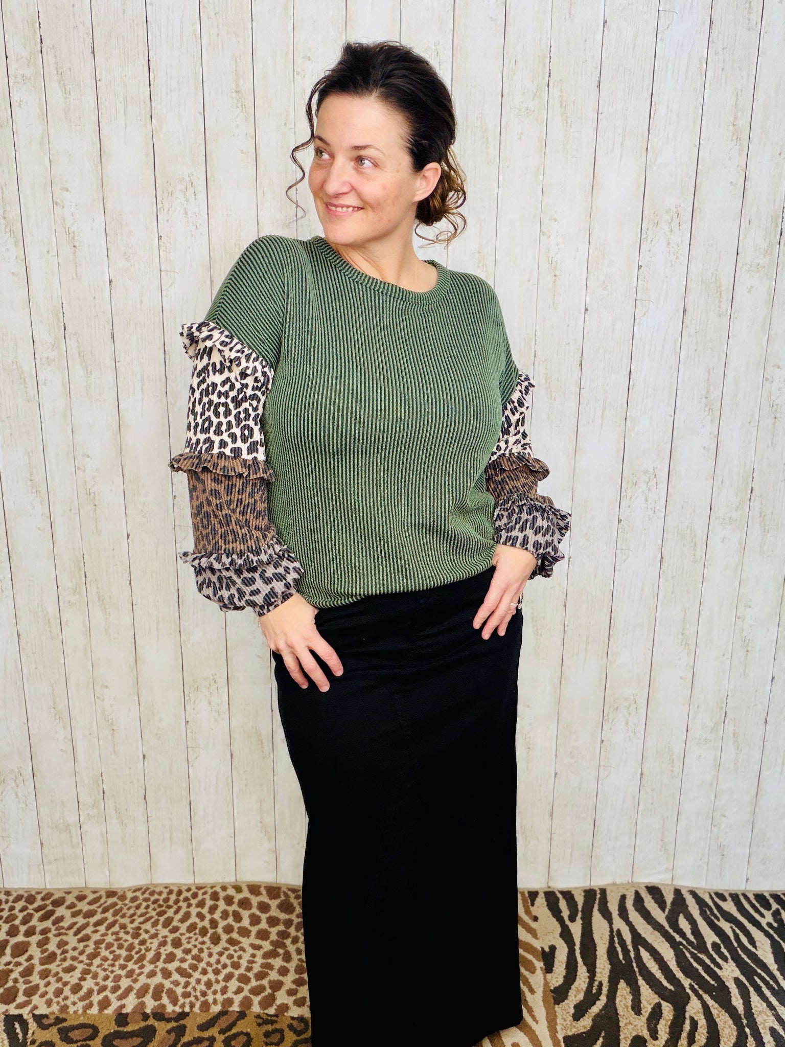 Isabella Ribbed Leopard & Olive Top Crafted from a breathable polyester-spandex blend, this long-sleeve top combines comfort with contemporary style. The olive body features layered ruffle detailing at the round neckline, while leopard-print sleeves add an urban edge. Ribbed fabric throughout provides structure and a flattering fit. Perfect for layering or wearing solo, this piece transitions seamlessly from casual outings to weekend gatherings. The contrasting textures and prints create visual interest without overwhelming your wardrobe.