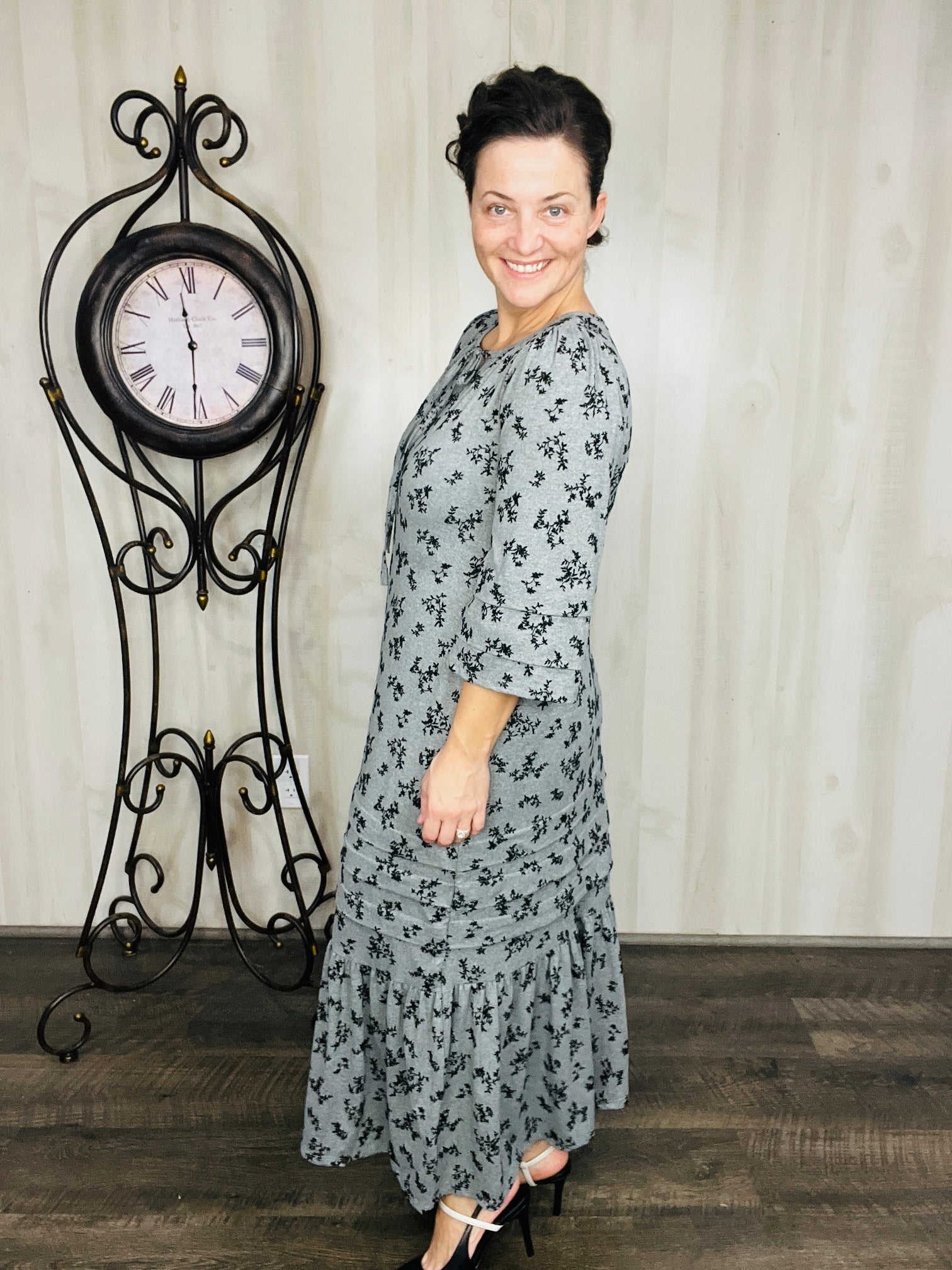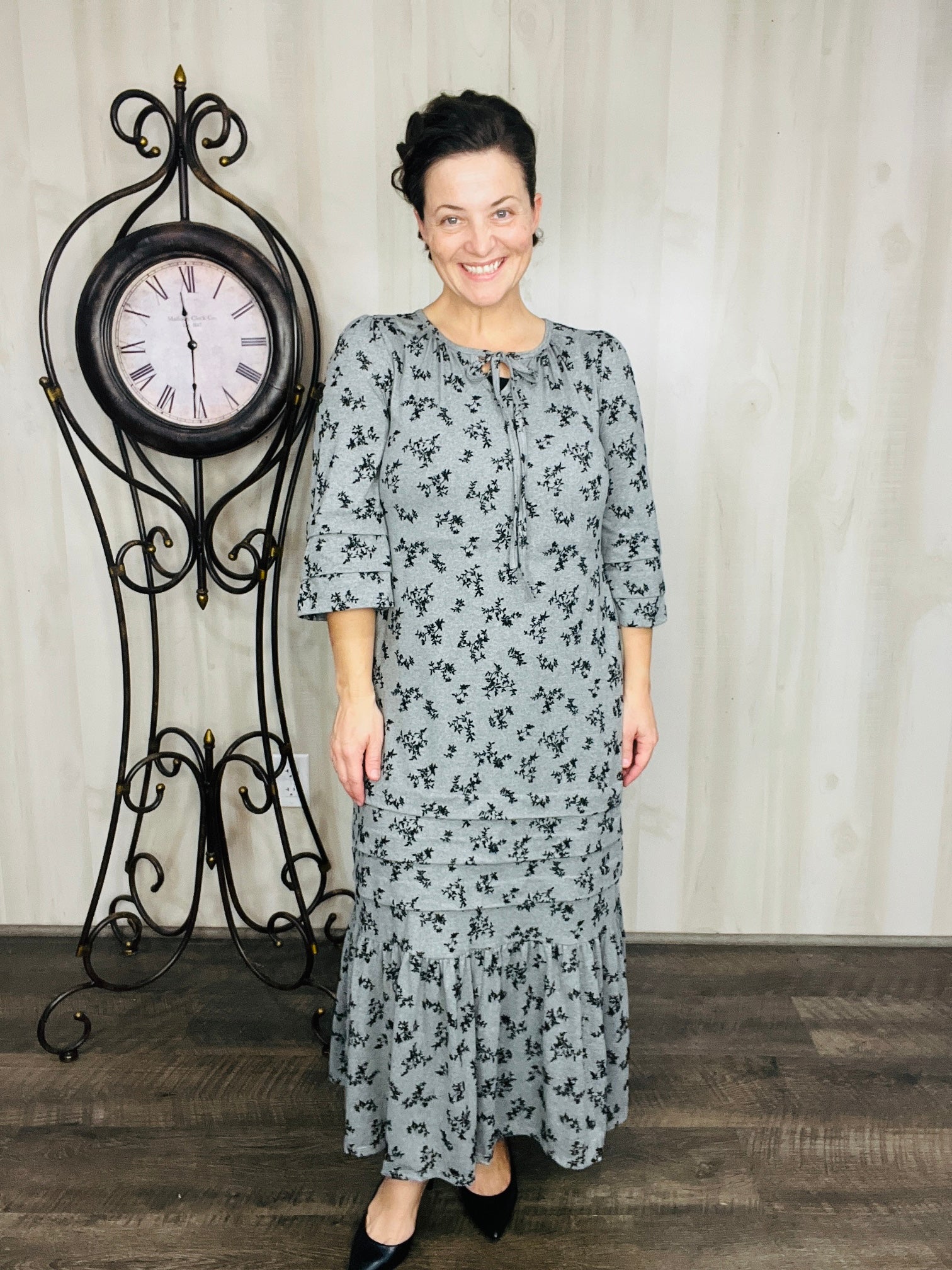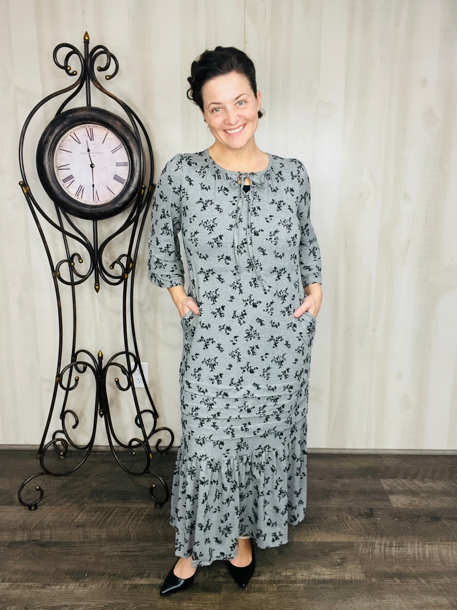 Elevate your wardrobe with the Rena Charcoal & Ditsy Floral Print Dress, featuring a tiered ruffle hem that creates a flowy, flattering silhouette. The 3/4 sleeves with delicate ruffle detail add an elegant touch, while the bow tie neckline enhances its feminine and modest appeal. Practical side pockets blend style with everyday functionality. Designed with a modest fit, this dress transitions effortlessly from casual outings to dressier events. Made of polyester and spandex blend material.