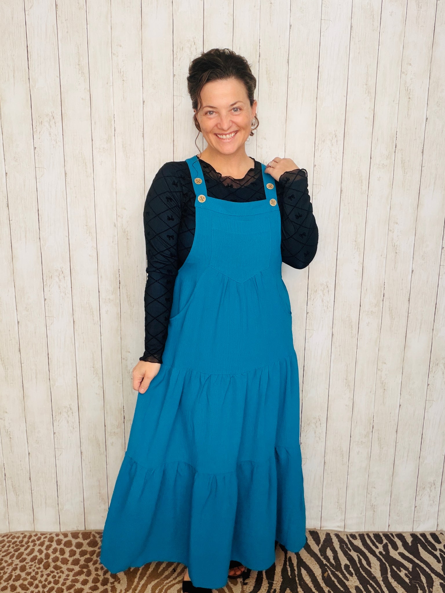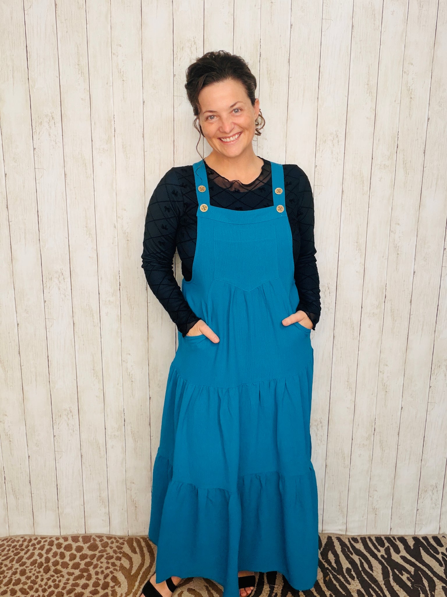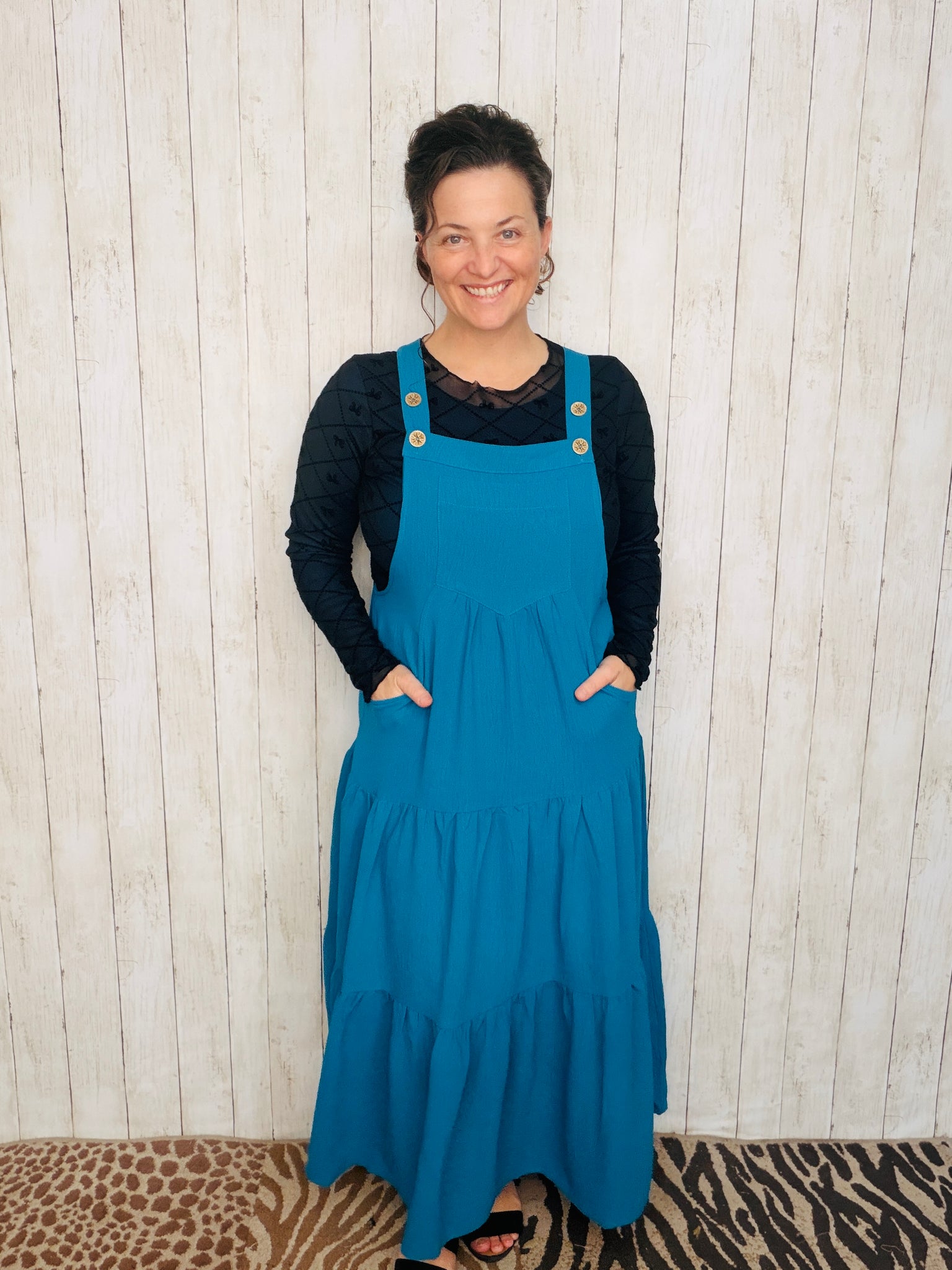 This Black tiered midi jumper combines effortless style with practical details. Featuring adjustable straps for a perfect fit and convenient pockets, it offers both comfort and sophistication. The flowing tiers enhance movement, making it ideal for day-to-night occasions. Material is rayon.