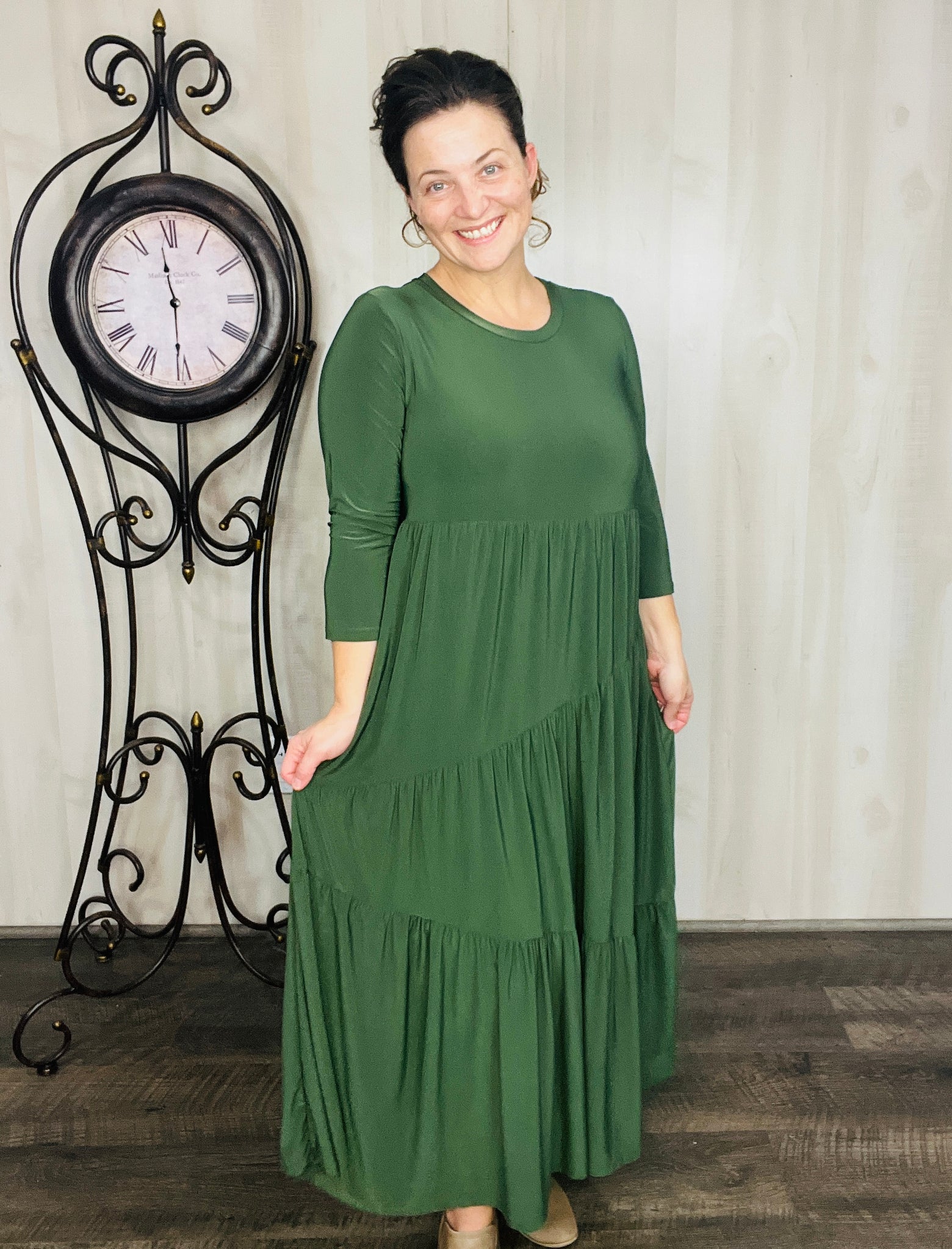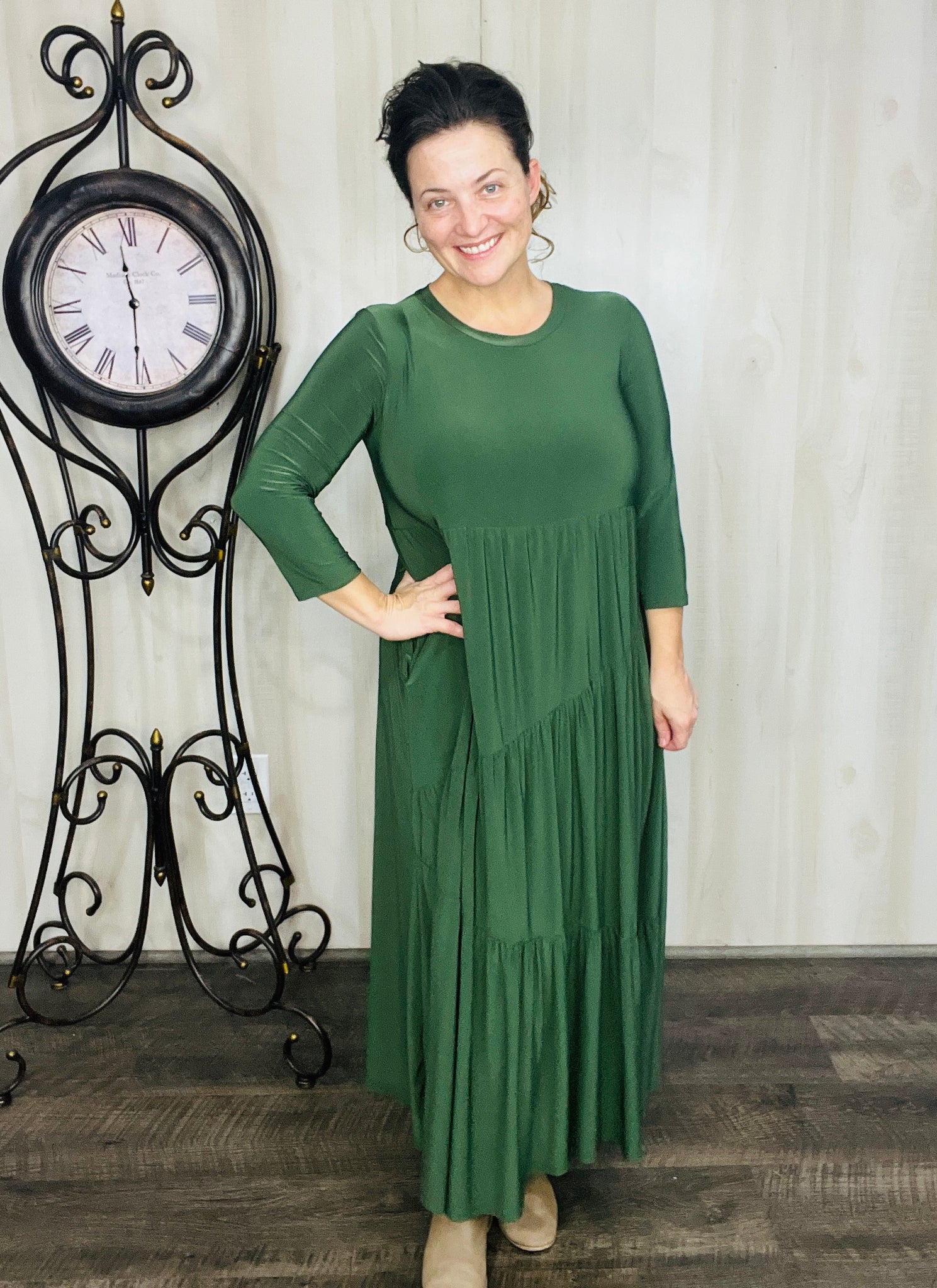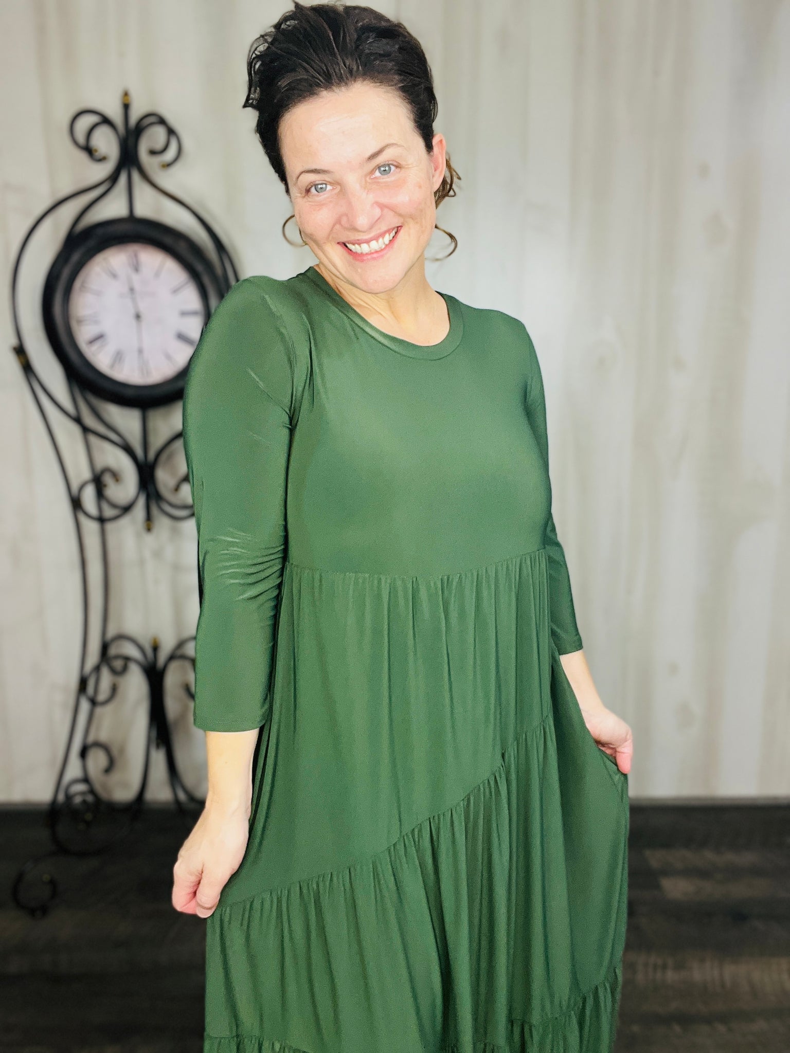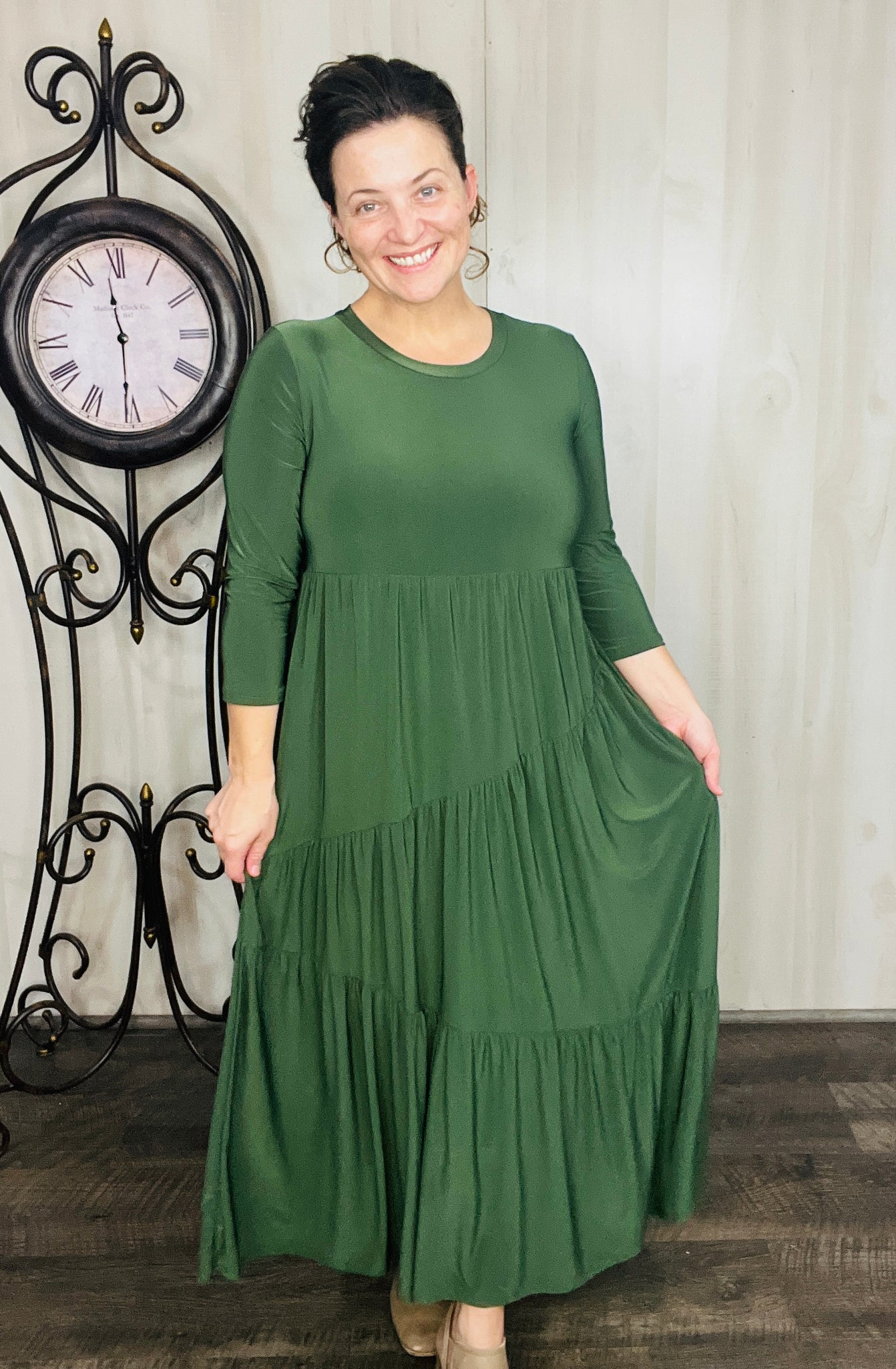 These dresses are truly perfection! They look beautiful on every body shape. Easy to wear. Flattering fit. 3/4 length sleeves. High-round neckline. Anti-wrinkle, high-quality material blend feels luxurious. Made of a stretchy polyester and spandex blend material.  This material is luxurious and has great coverage.