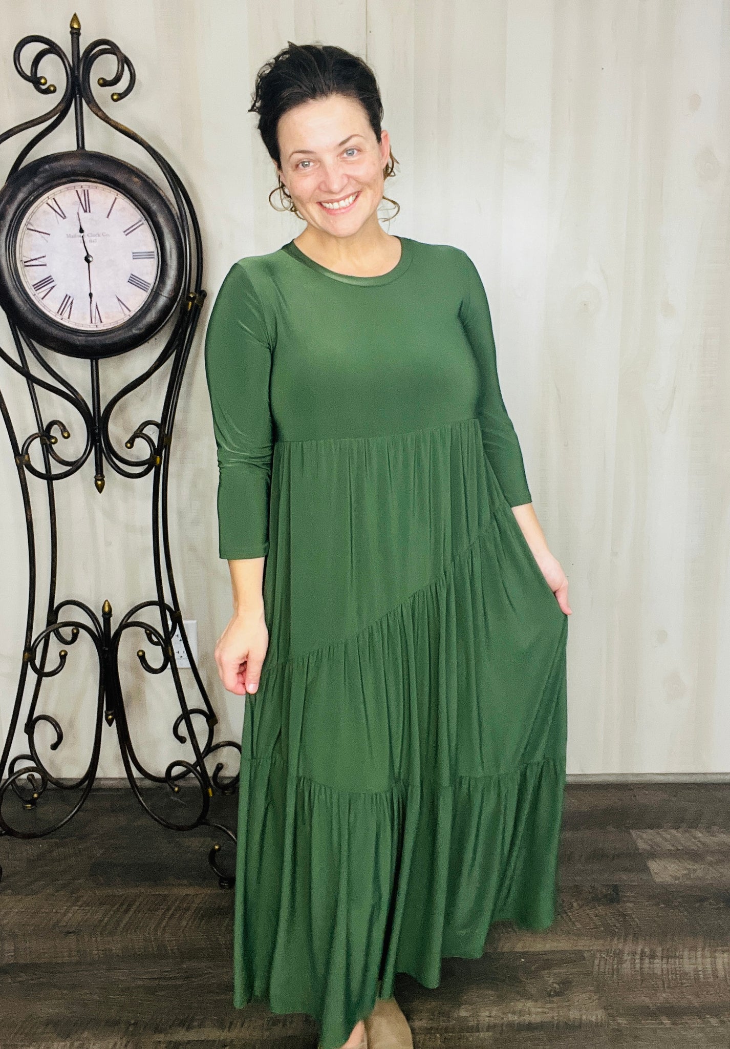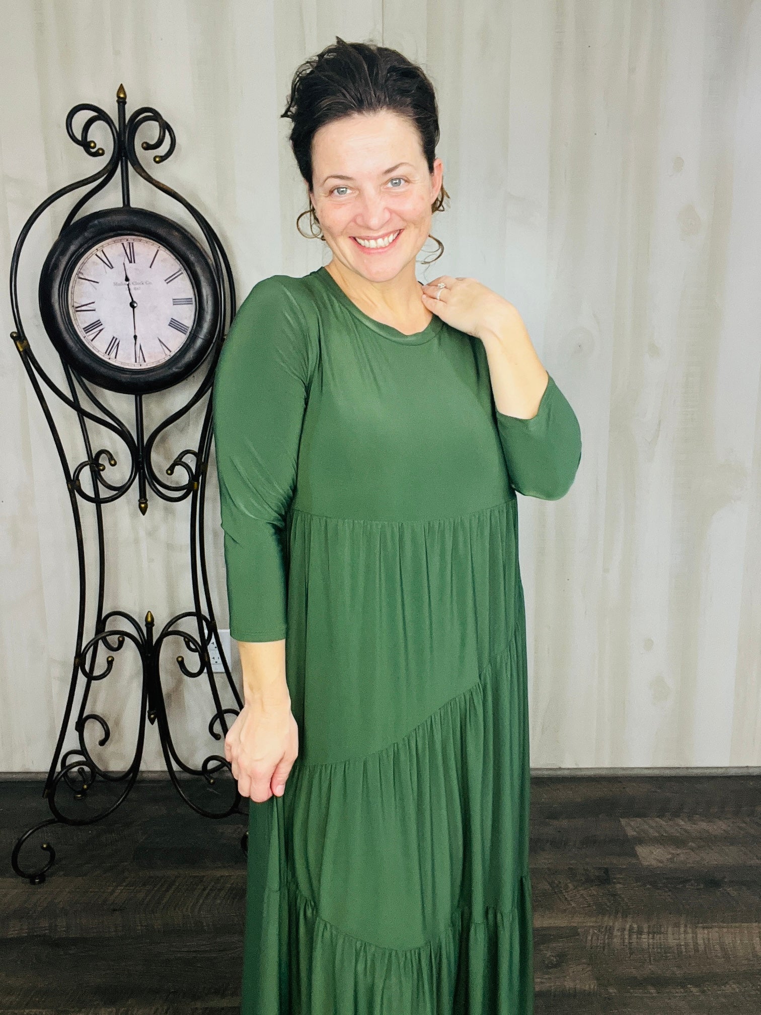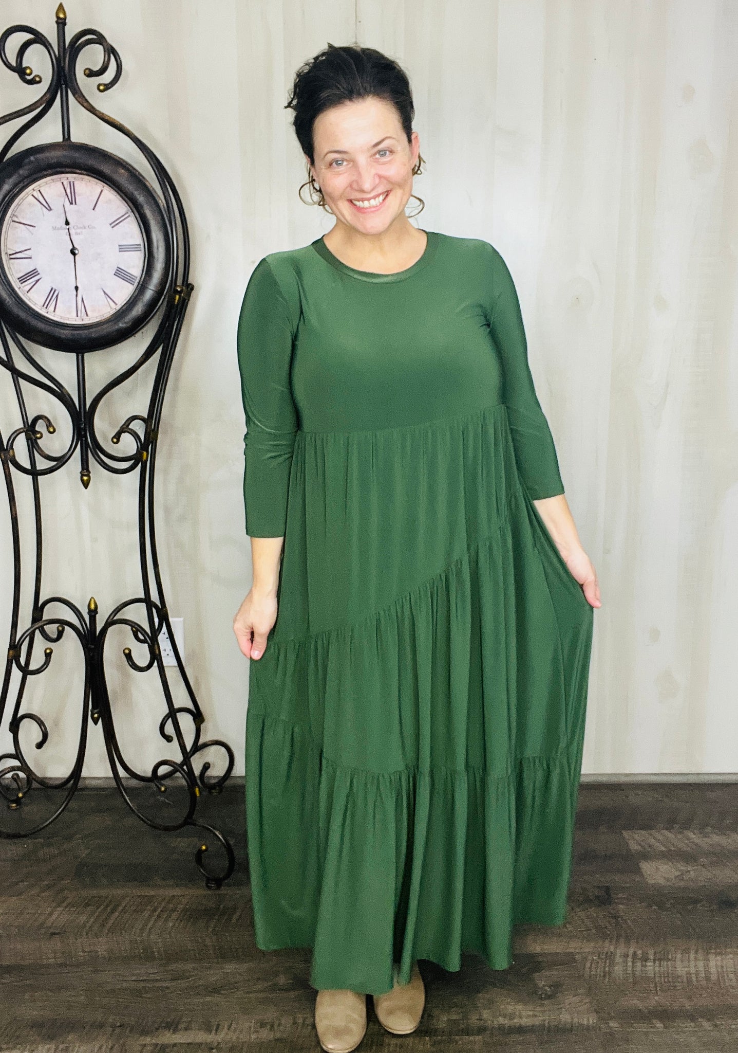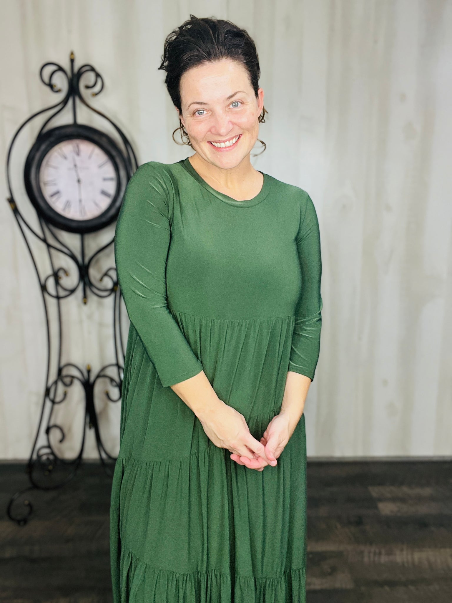 These dresses are truly perfection! They look beautiful on every body shape. Easy to wear. Flattering fit. 3/4 length sleeves. High-round neckline. Anti-wrinkle, high-quality material blend feels luxurious. Made of a stretchy polyester and spandex blend material.  This material is luxurious and has great coverage.