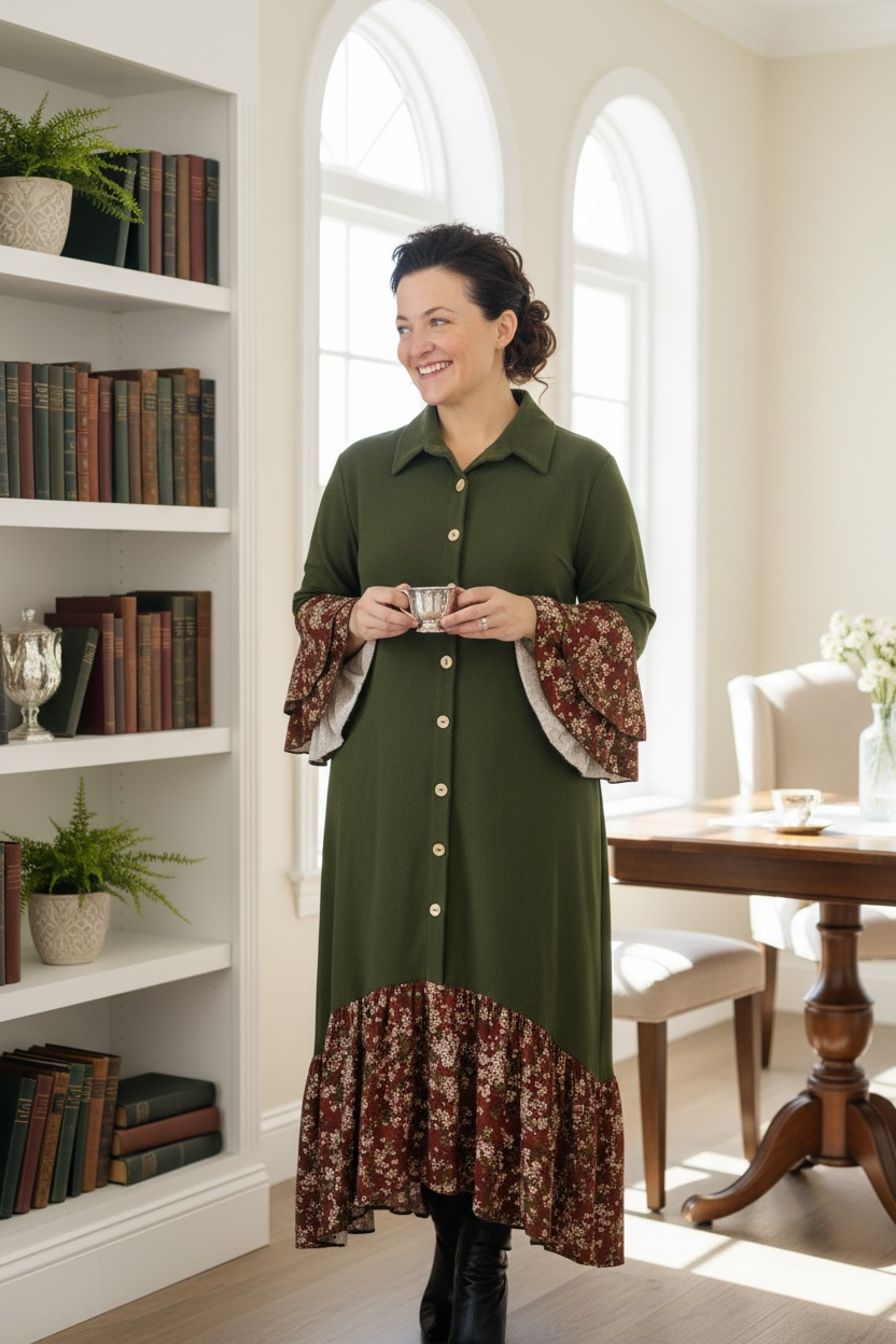 The Cammie Button Front Dress combines timeless elegance with modern comfort. Crafted from a stretchy polyester and spandex blend, this piece features a flattering silhouette that moves with you. The button front closure adds versatile styling options, while voluminous bell sleeves create an effortlessly chic aesthetic. Animal print contrast detailing elevates the design with visual interest, making it equally suited for refined occasions or elevated everyday wear.