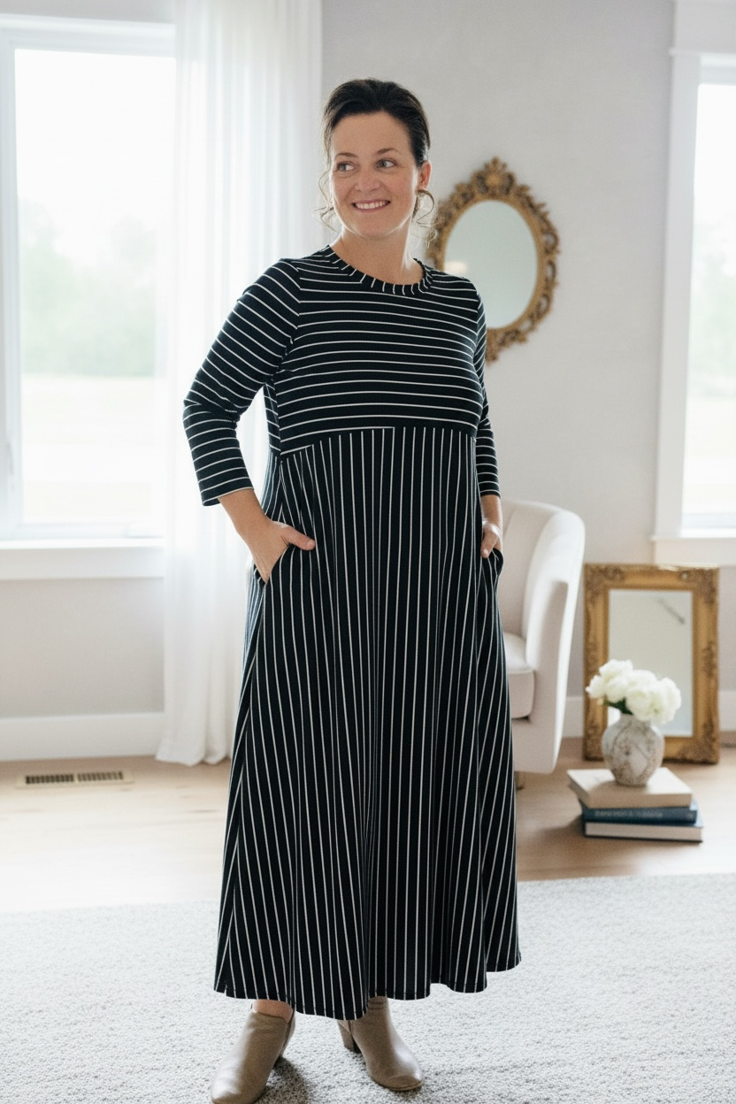 Gorgeous new dress style. They look beautiful on every body shape. Easy to wear. Flattering fit. 3/4 length sleeves. High-round neckline. Anti-wrinkle, high-quality material blend with slight texture that feels luxurious. Made of a stretchy polyester and spandex blend material.  Striped material.