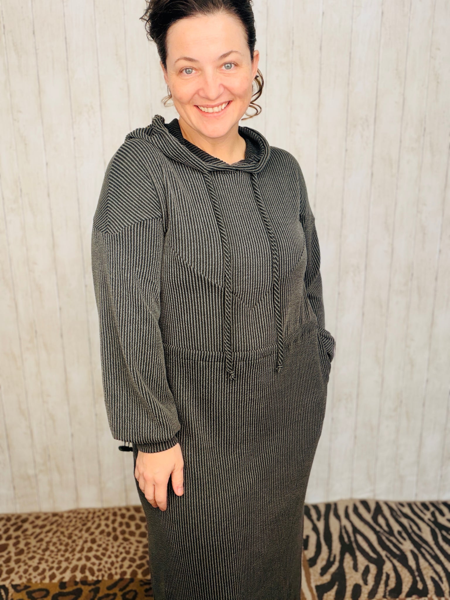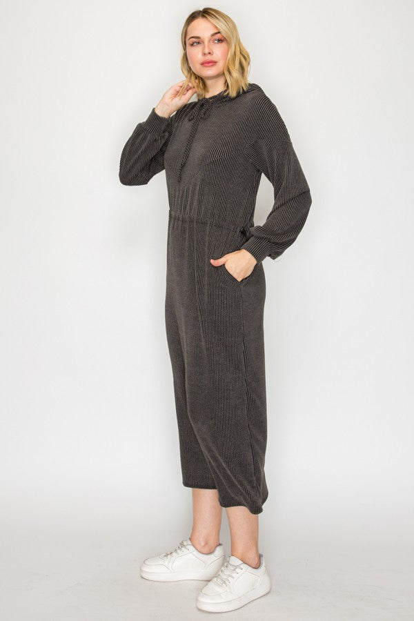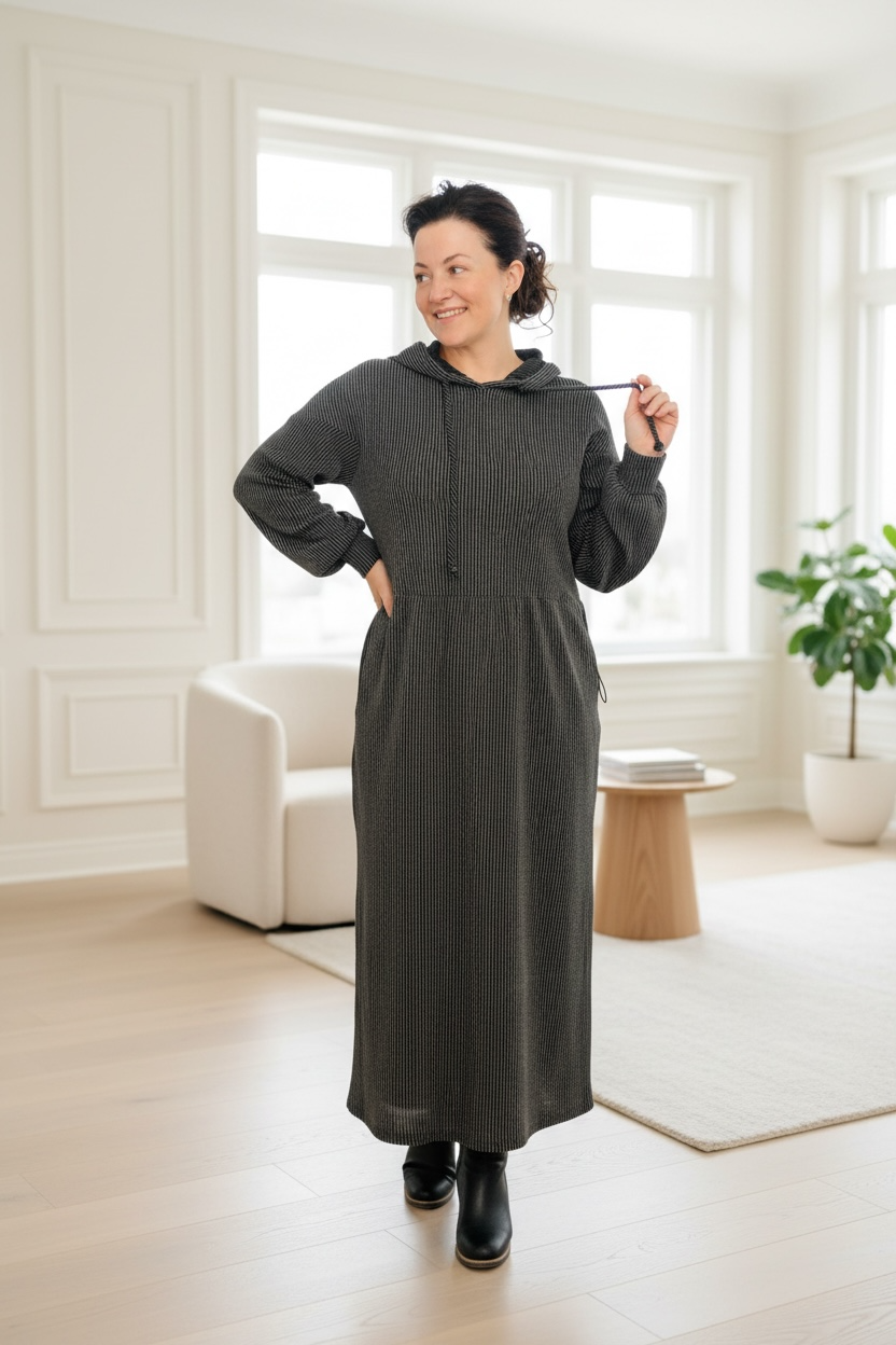 Sink into effortless comfort with this ribbed lounge dress, crafted from a luxurious blend of polyester, rayon, and spandex that feels as good as it looks. The adjustable drawstring waist lets you customize your fit, while the hood and long sleeves provide cozy coverage. Practical front pockets keep your essentials within reach. Perfect for lounging at home or running errands in style—this charocal-hued piece is the ultimate go-to for relaxed, all-day wear.