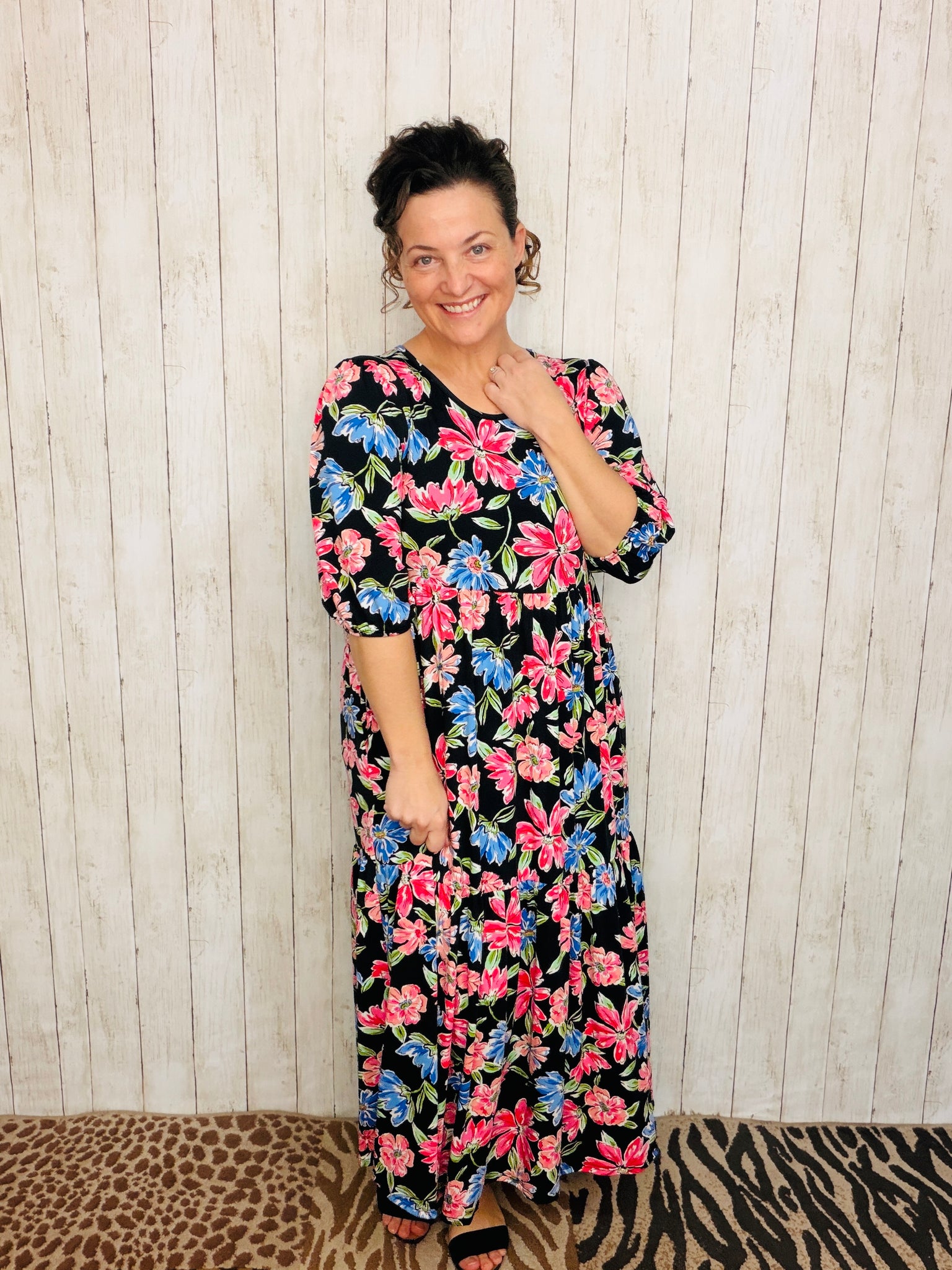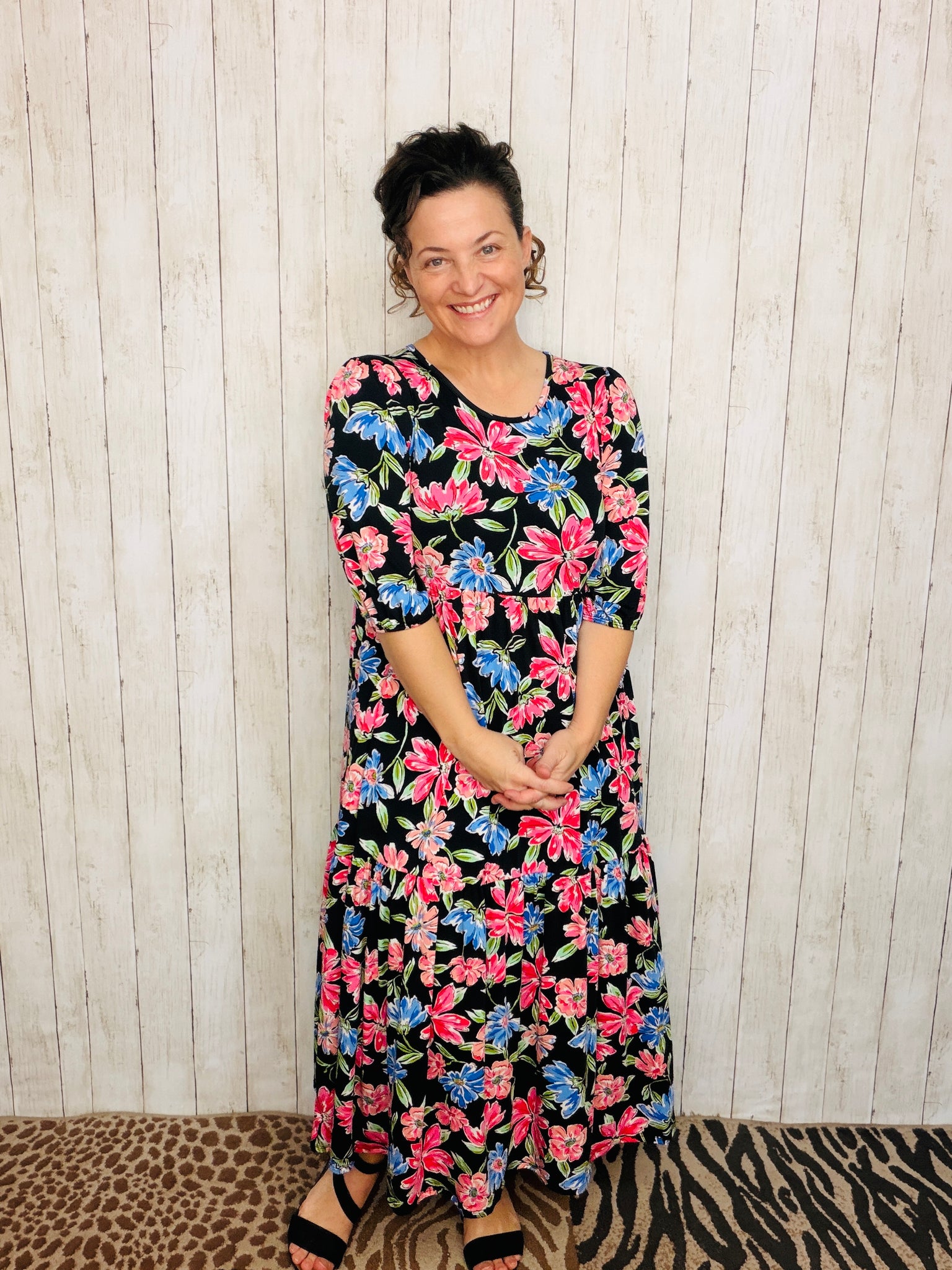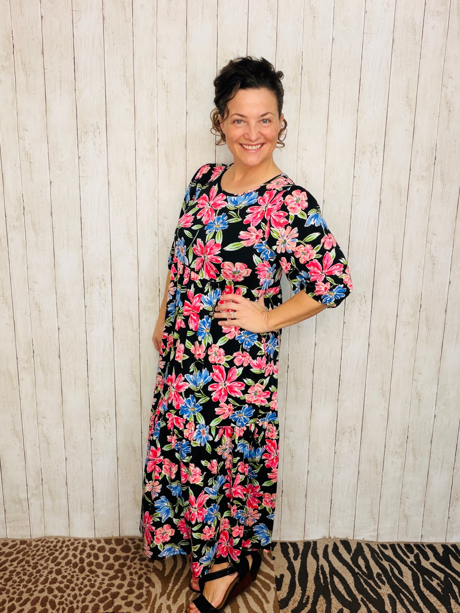 Simply Perfection! Made from a stretchy blend of polyester and spandex, this dress is both comfortable and easy to wear. With elbow length sleeves with elastic cuffs and anti-wrinkle fabric, you'll be ready to take on the day in style. Black background with a pink floral pattern and tiers of material. Great belly coverage.
