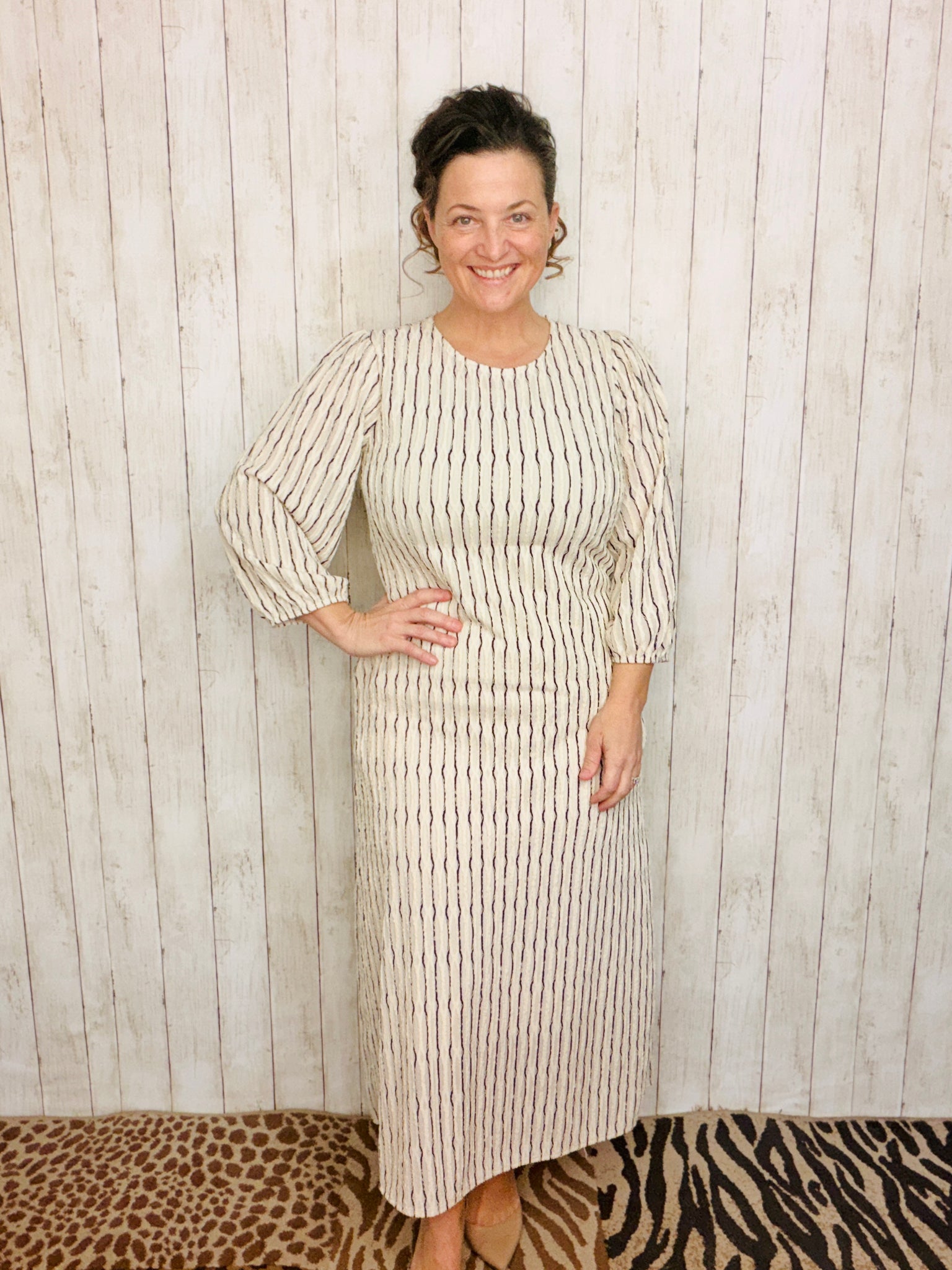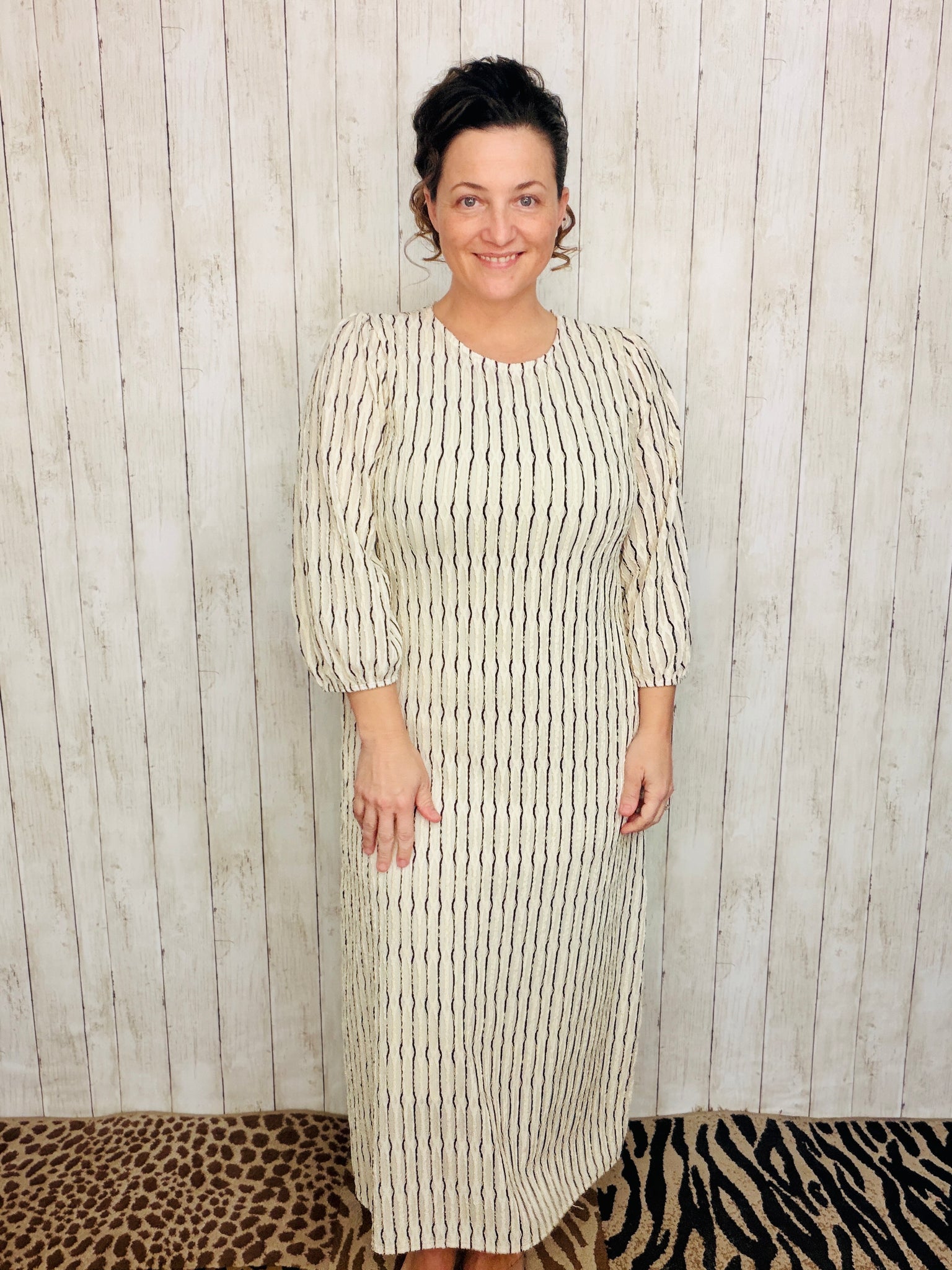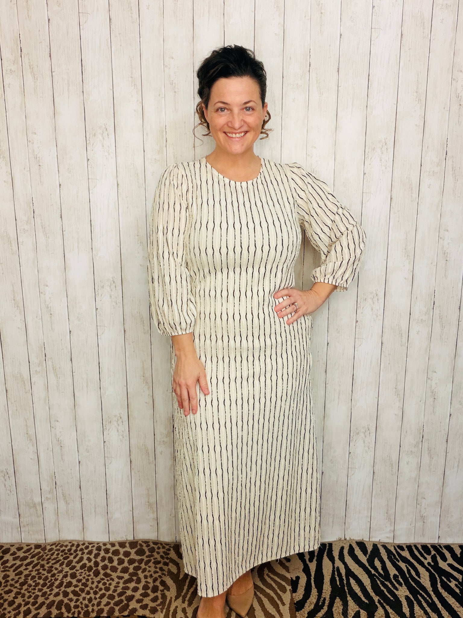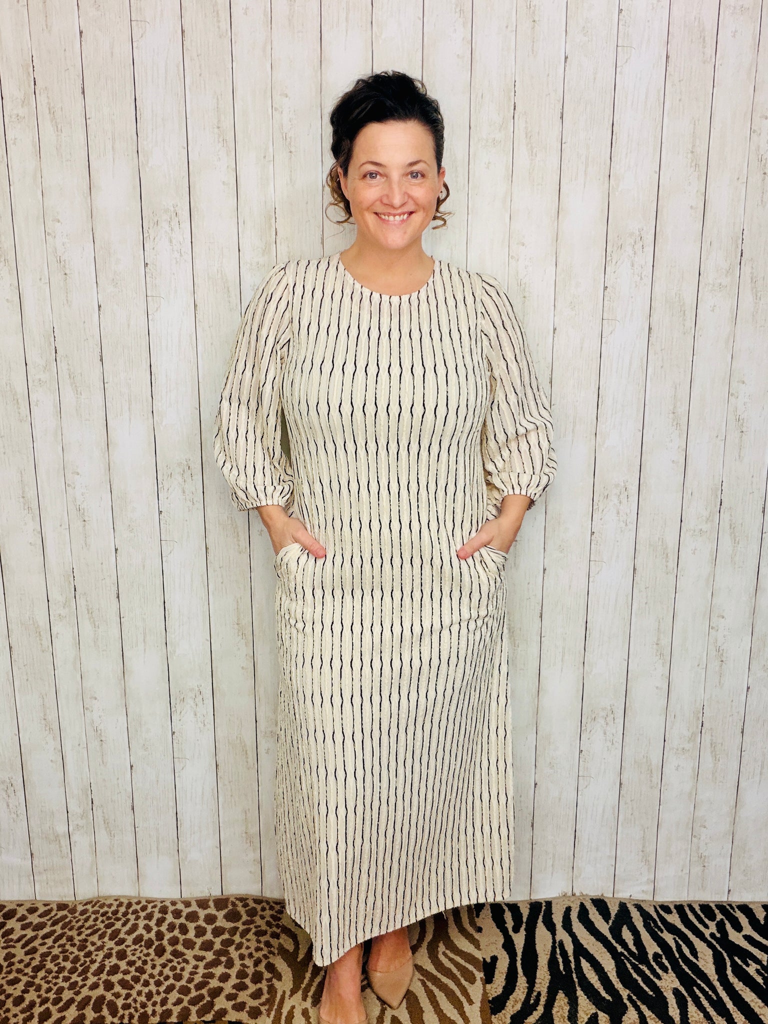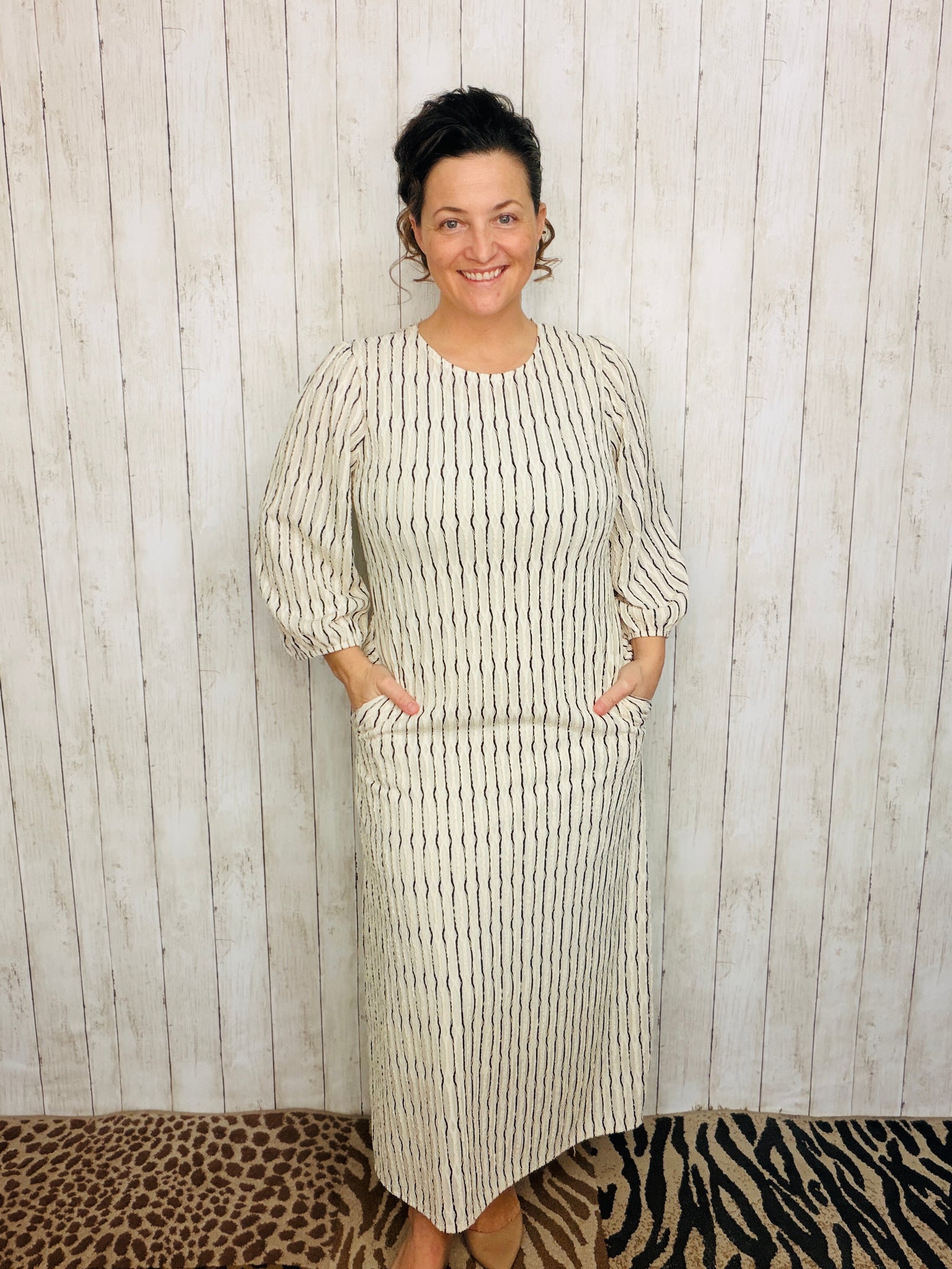 Perfect for Spring! Textured midi dress of polyester and spandex with horizontal textured stripes. Soft & stretchy and comfortable polyester and spandex material is anti-wrinkle and has excellent coverage. Has pockets. 3/4 length sleeves. Fully Lined.