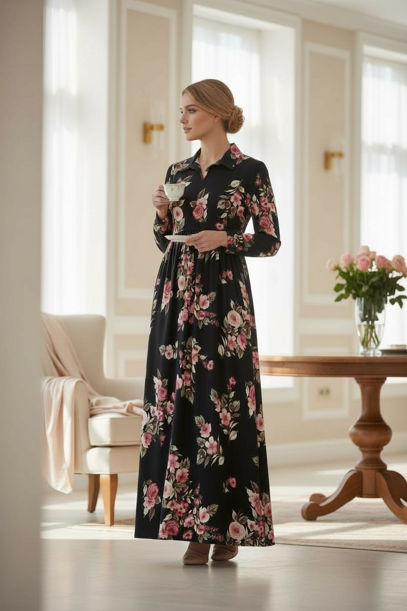 The Kaylee Collared Dress features a refined collar with a notched neckline that frames the face elegantly. Its babydoll fit and flare silhouette, complemented by voluminous bubble sleeves, creates a graceful and feminine look. Maxi length adds sophistication, while the stretchy, anti-wrinkle fabric blend ensures comfort and effortless style throughout the day. This dress perfectly combines polished design with practical wearability.