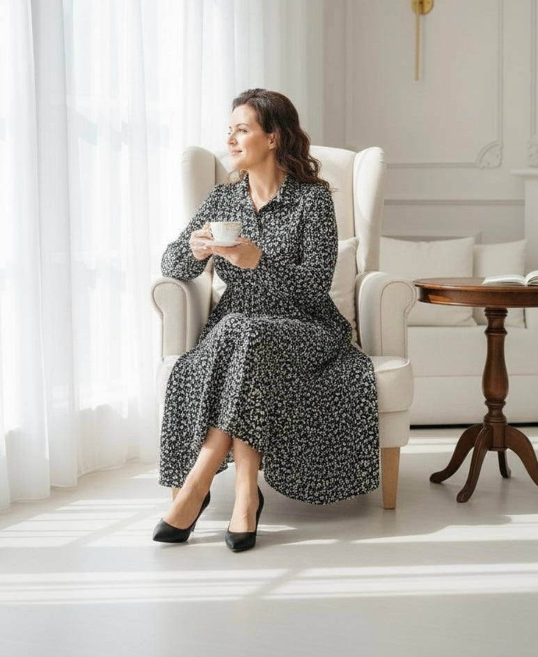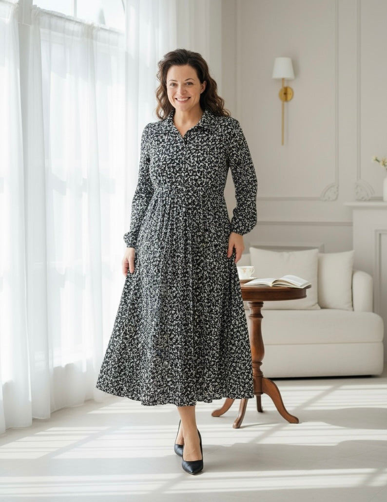 The Kaylee Collared Dress features a refined collar with a notched neckline that frames the face elegantly. Its babydoll fit and flare silhouette, complemented by voluminous bubble sleeves, creates a graceful and feminine look. Maxi length adds sophistication, while the stretchy, anti-wrinkle fabric blend ensures comfort and effortless style throughout the day. This dress perfectly combines polished design with practical wearability.