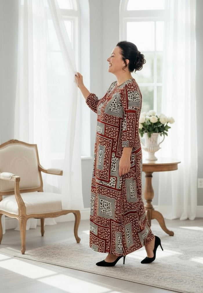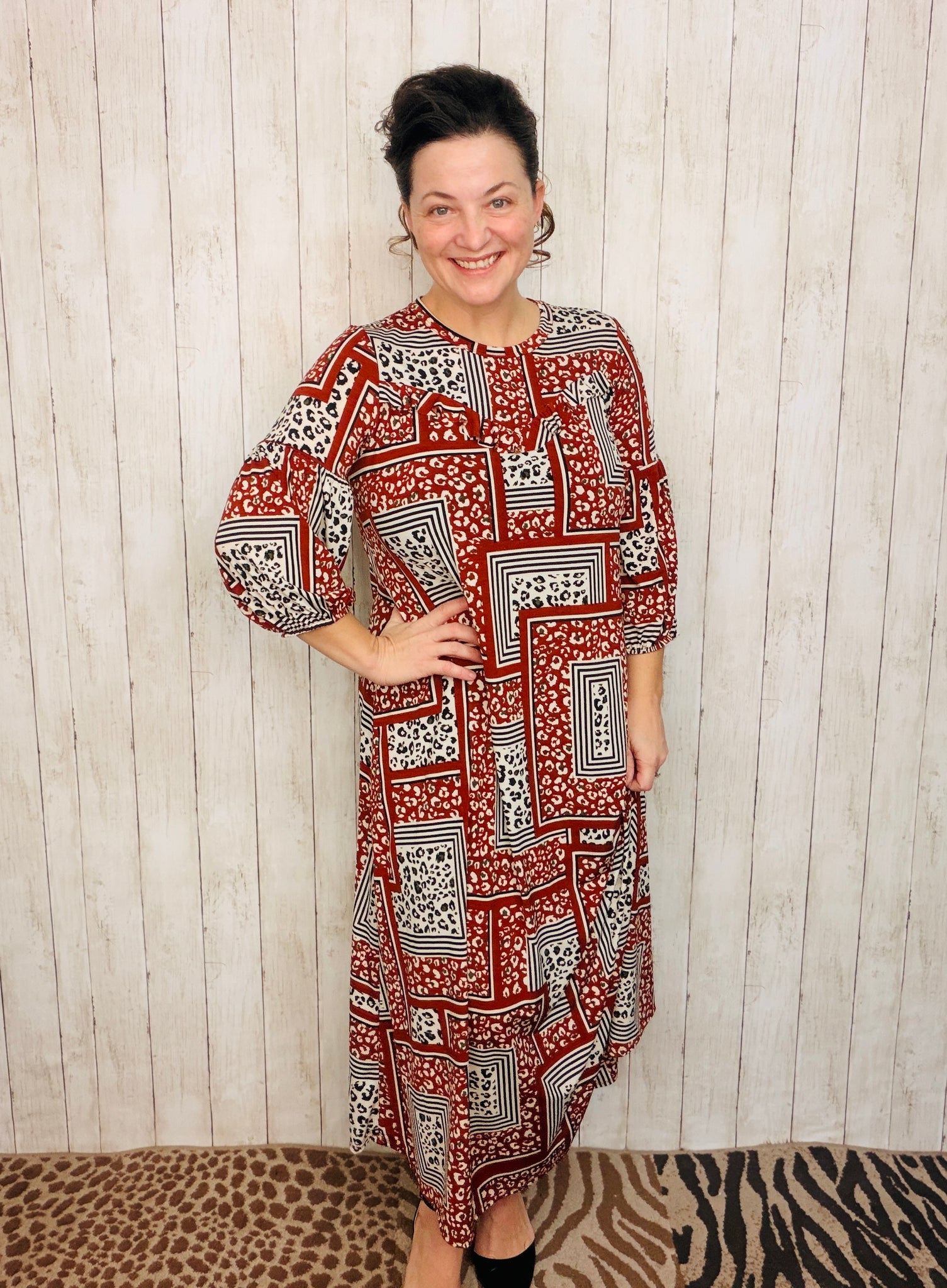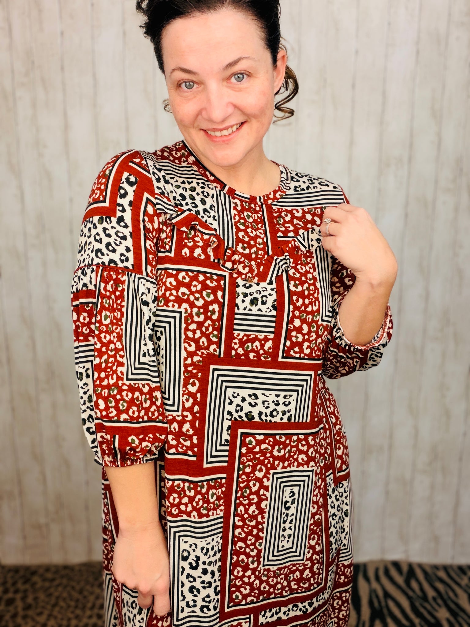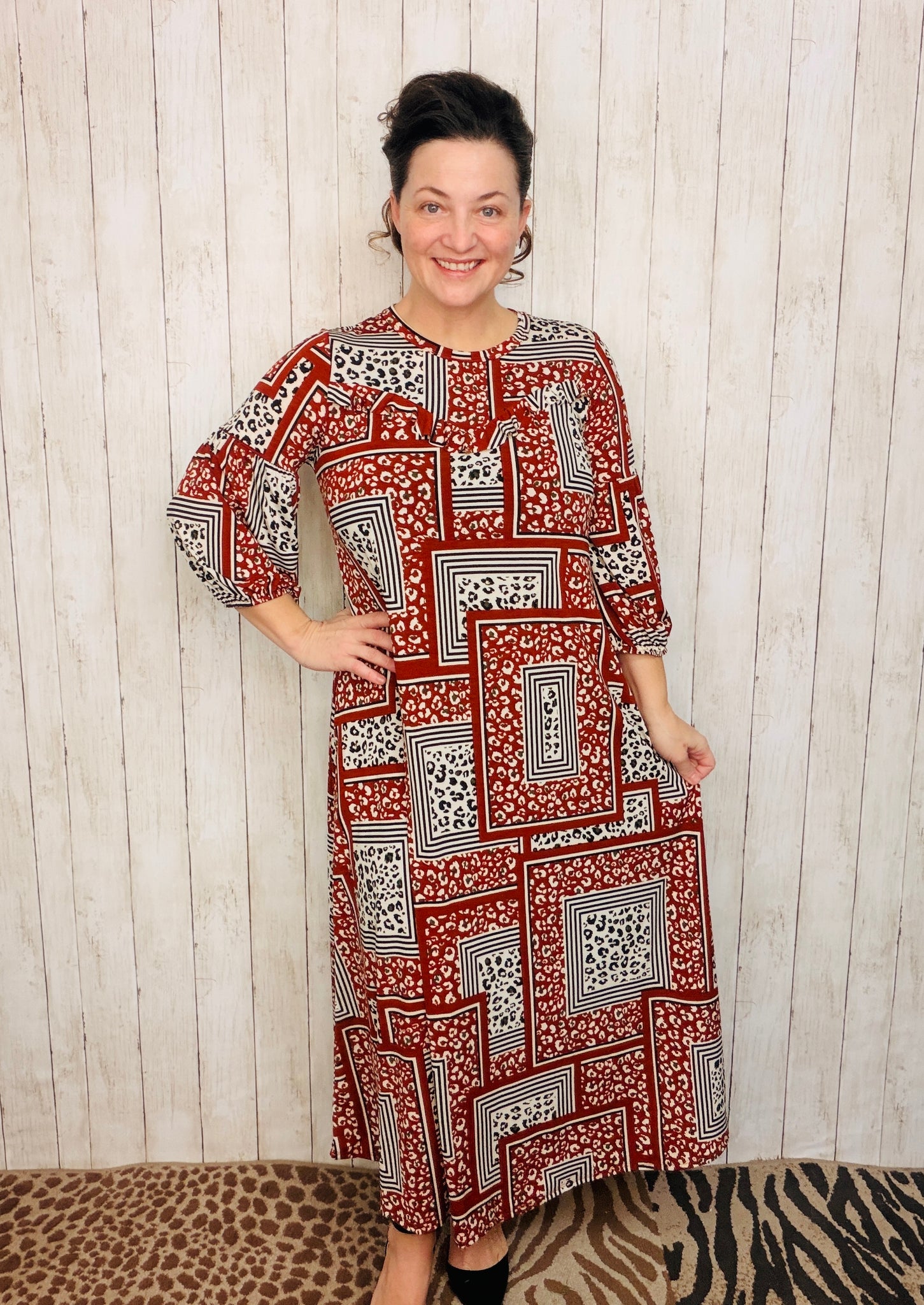 Rusty red patchwork and leopard print combine in this charming A-line dress, designed with both style and practicality in mind. The playful mix of patterns creates visual interest while the structured silhouette flatters various body types. A delicate ruffle adorns the neckline, adding feminine detail, while 3/4-length sleeves offer versatile layering options. Functional pockets provide everyday convenience—a feature many dresses overlook. Perfect for those seeking a statement piece that doesn't sacrifice comfort or wearability.