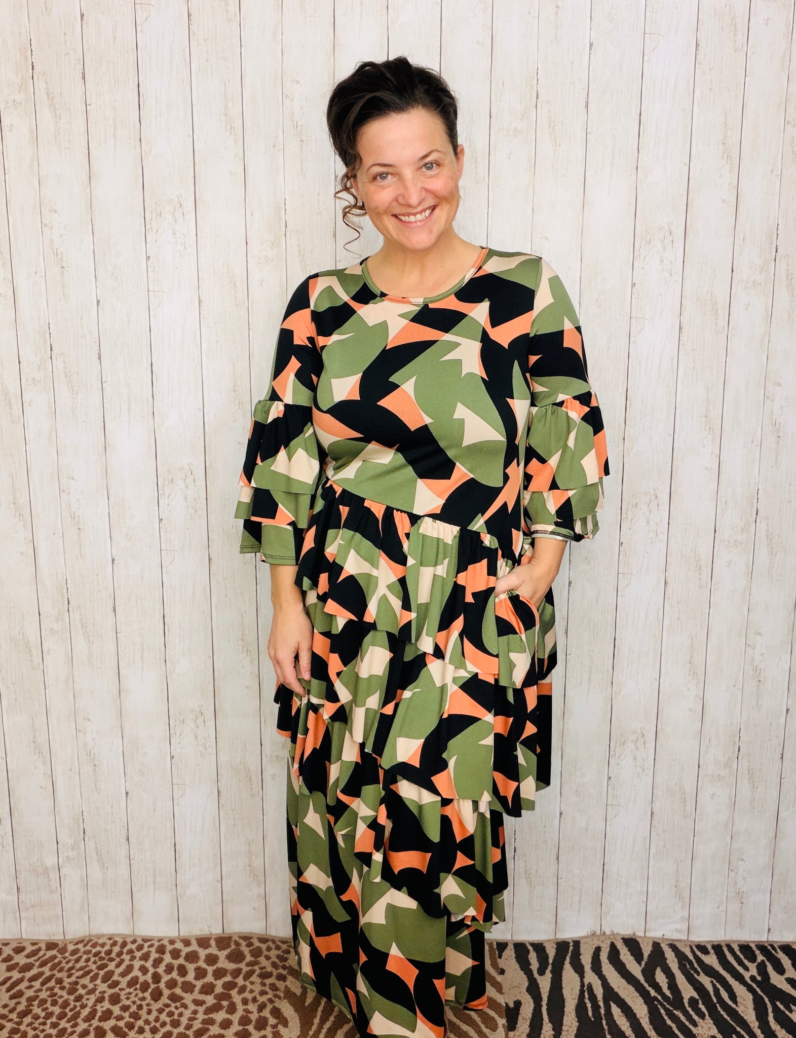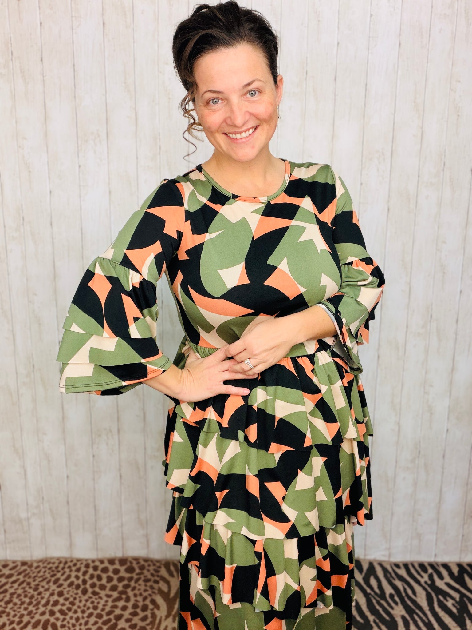 Candice Three Ruffle Dress- Olive Geometric Style