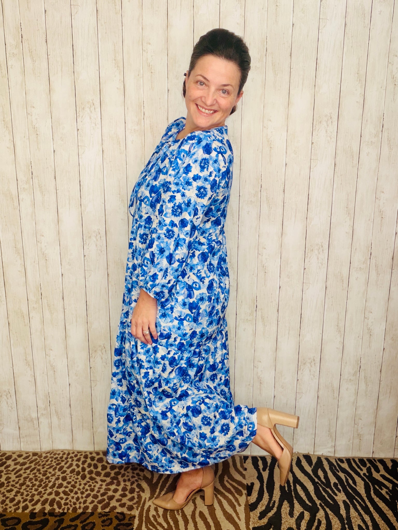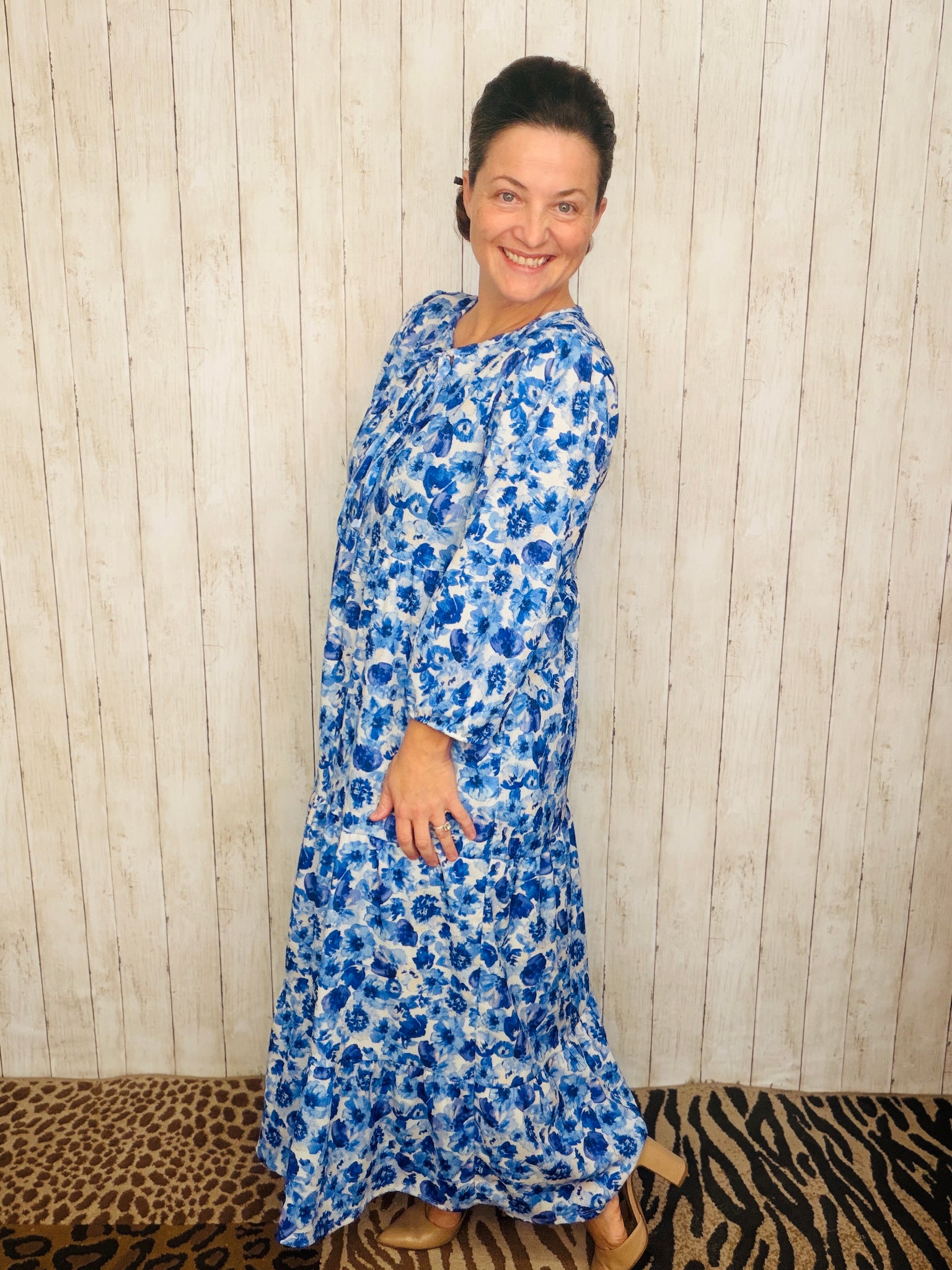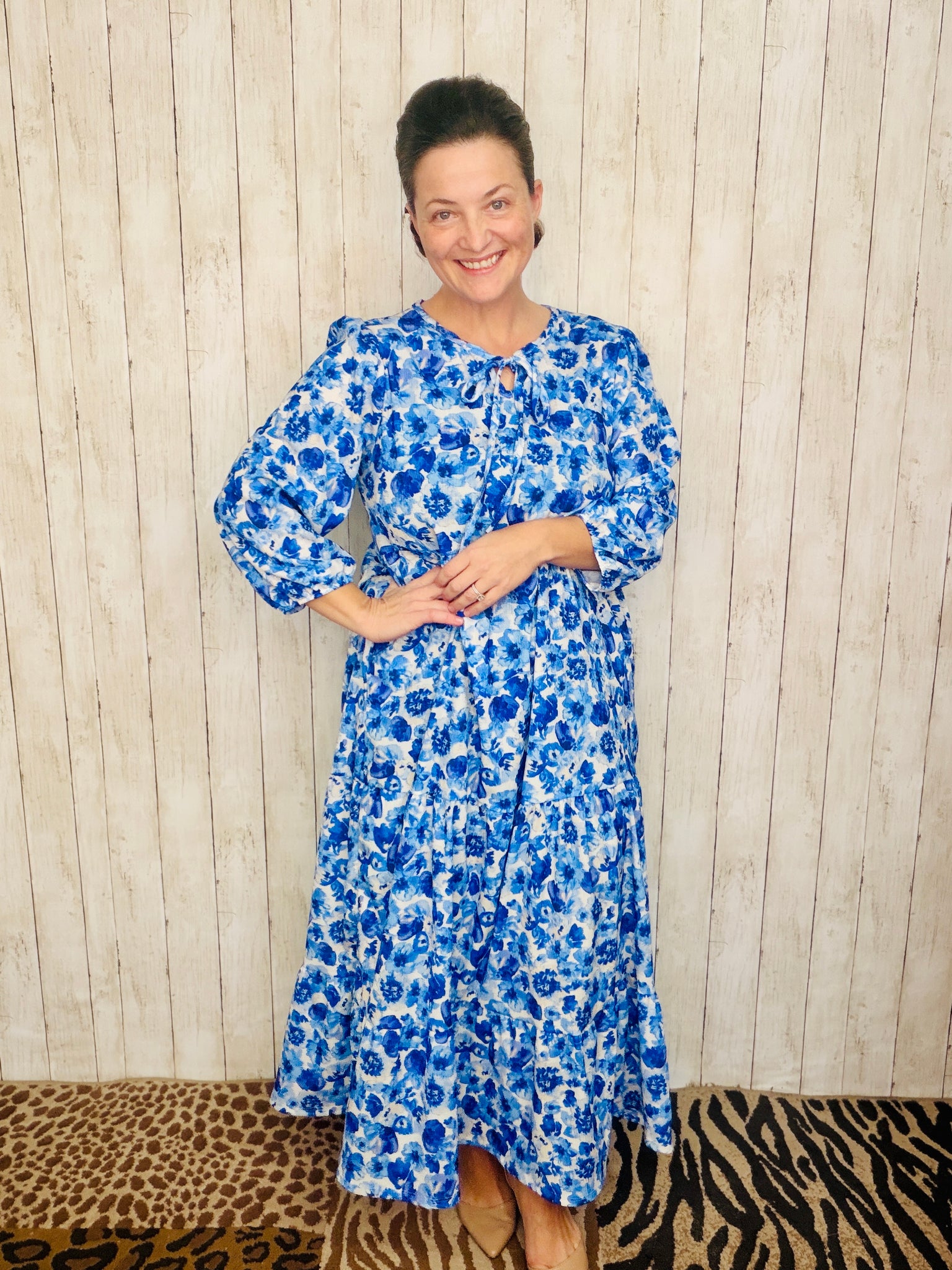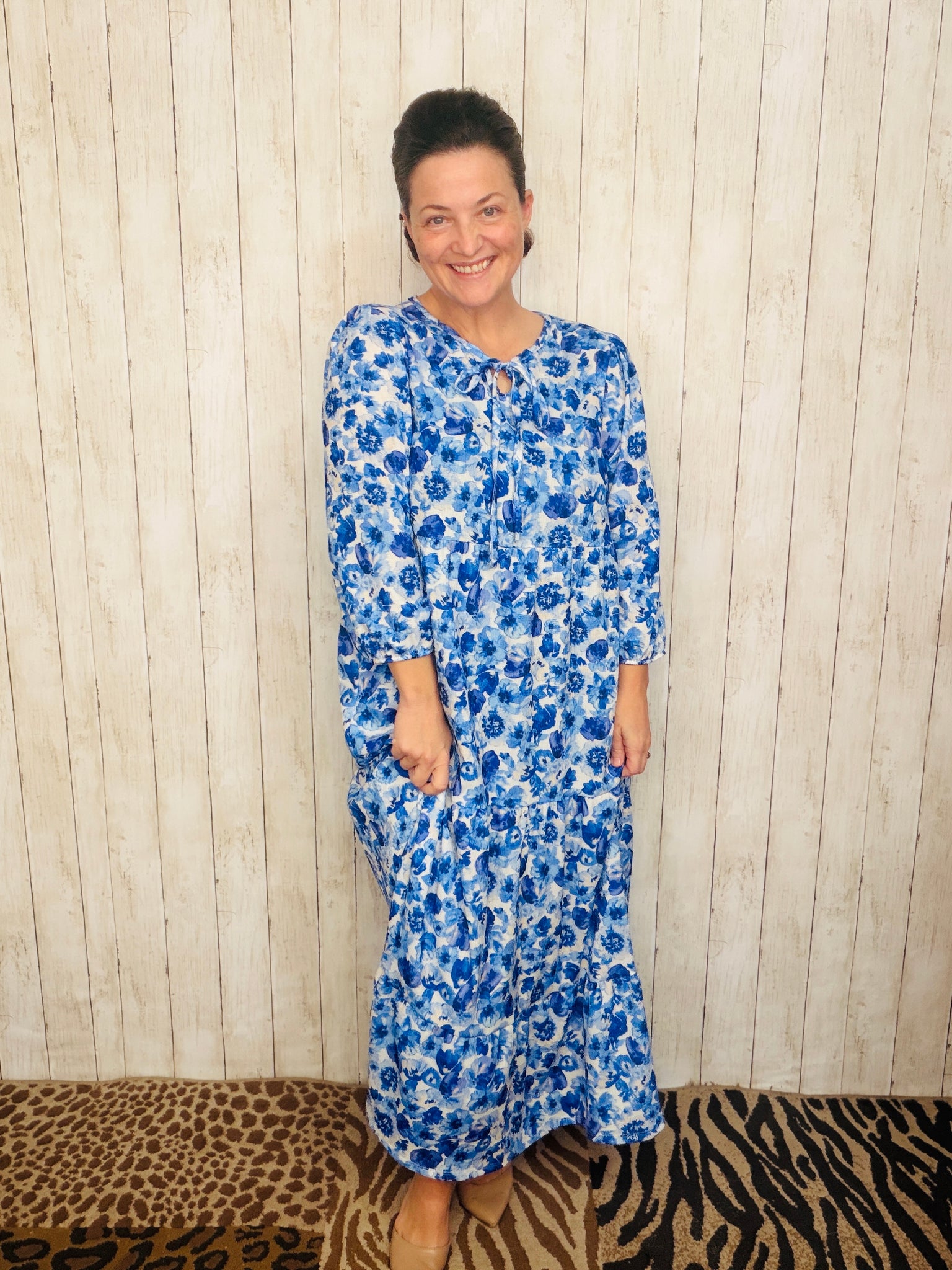 Cassie Tiered Boho Style Dress-Blue & Ivory Floral