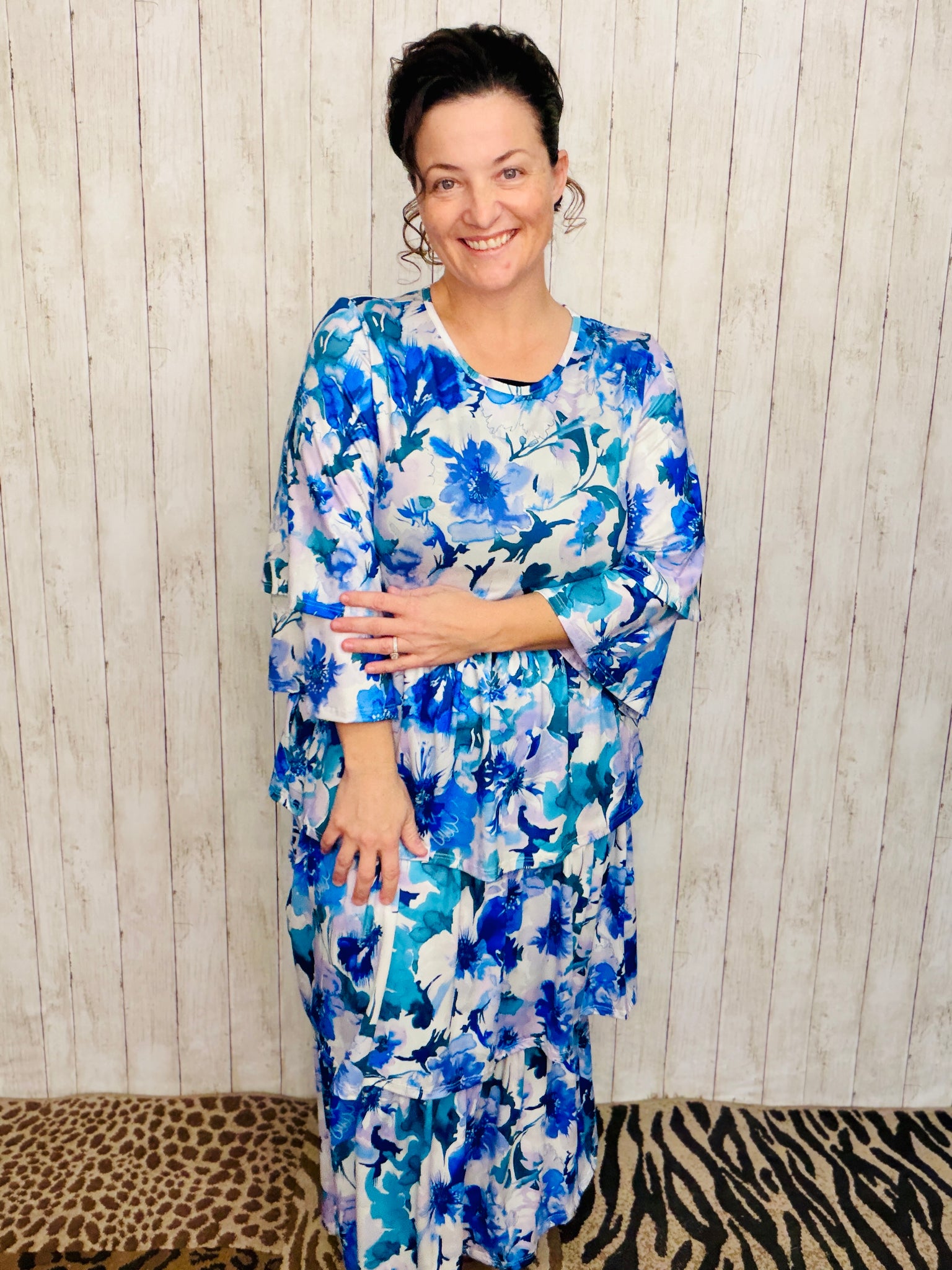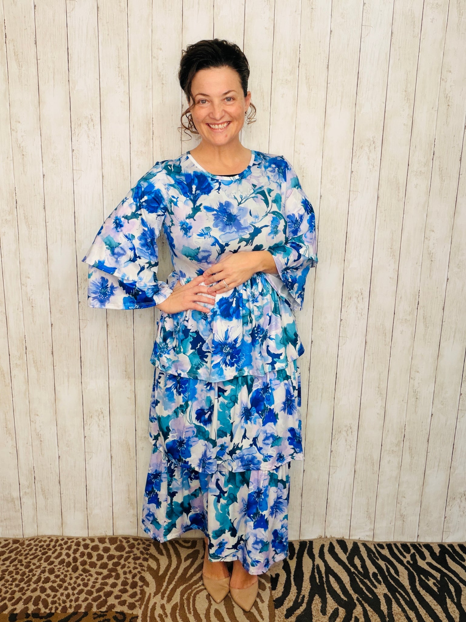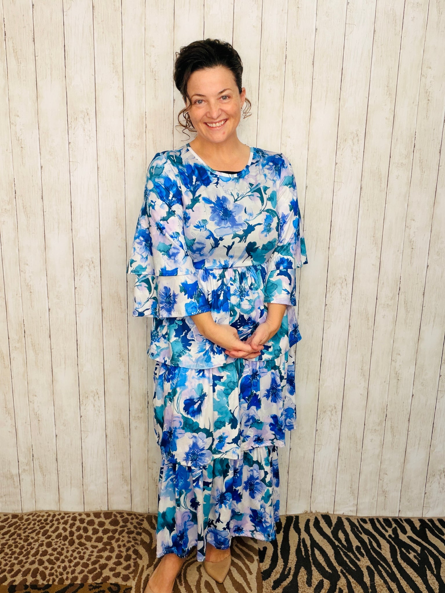 Introducing the Juliet Ruffle Dress. Featuring delicate double ruffle sleeves and three tiers of luxurious layers, this dress is made from a super soft, anti-wrinkle material. Crafted with a stretchy blend of polyester and spandex for a comfortable and flattering fit. Perfect for any occasion.