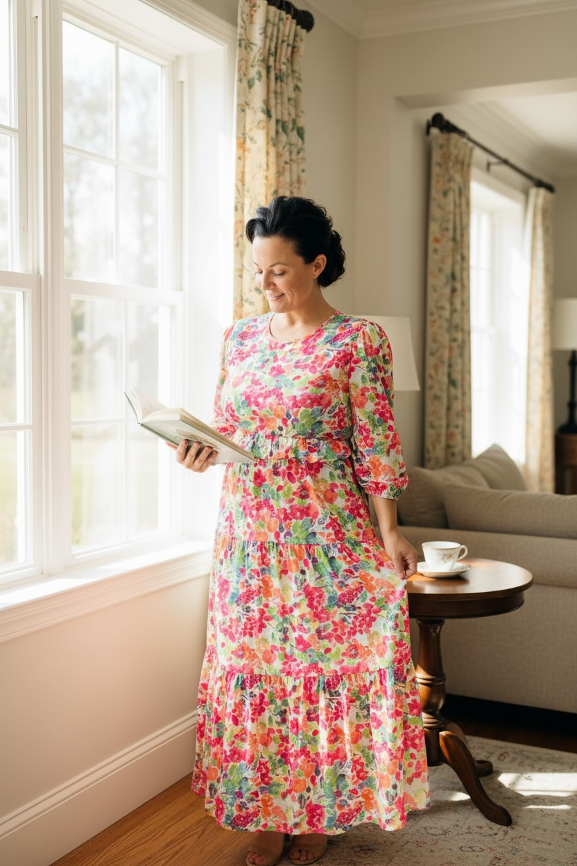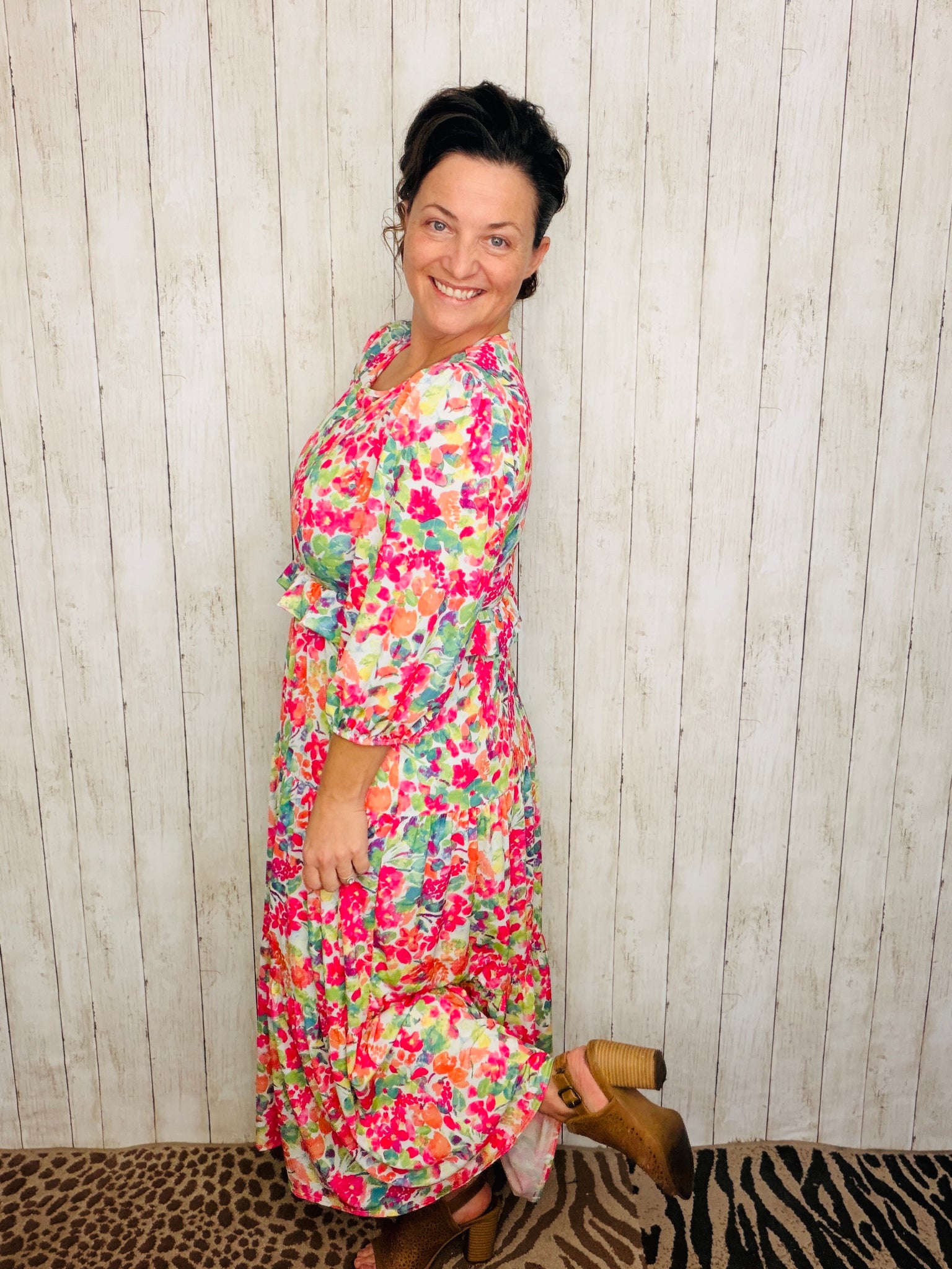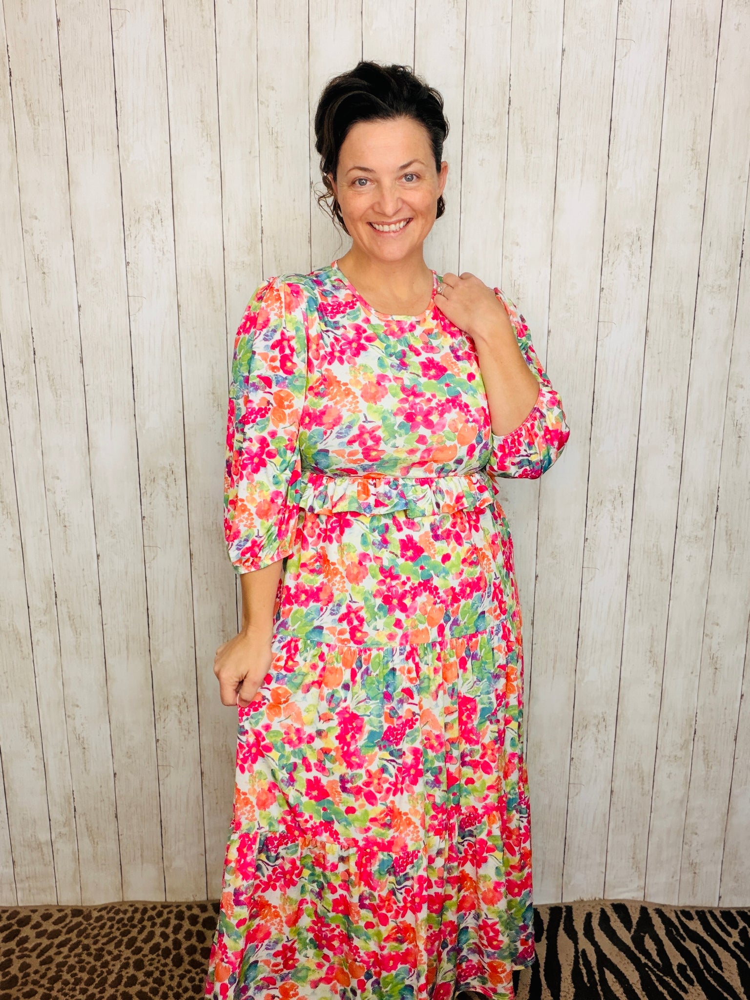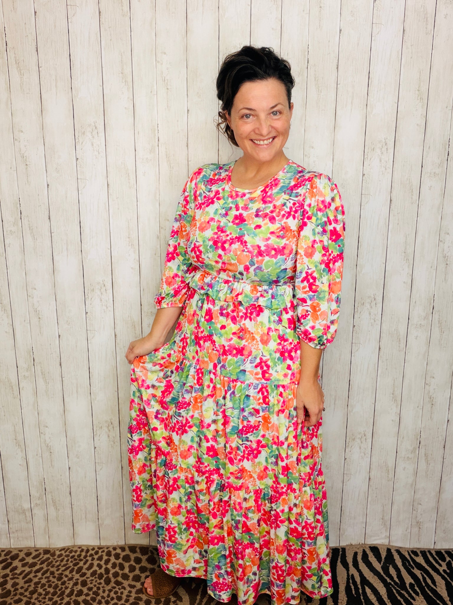 Gorgeous tiered dress with ruffle details. They look beautiful on every body shape. Easy to wear. Flattering fit. 3/4 length sleeves. High-round neckline. Anti-wrinkle, high-quality material blend with slight texture that feels luxurious. Fully lined!!! Made of a stretchy polyester and spandex blend material.