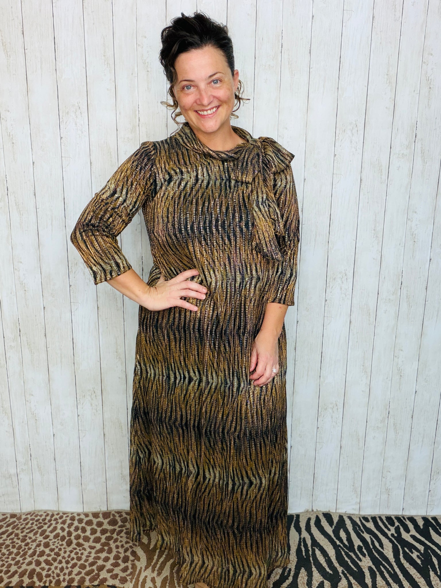 Be the center of attention in our Leopard & Sequin Overlay Dress! The stunning sequin mesh overlay adorns the solid black lining, while the entire dress, including the 3/4 length sleeves, is lined for your comfort. The stretchy material and handy pockets add extra convenience to this eye-catching dress.