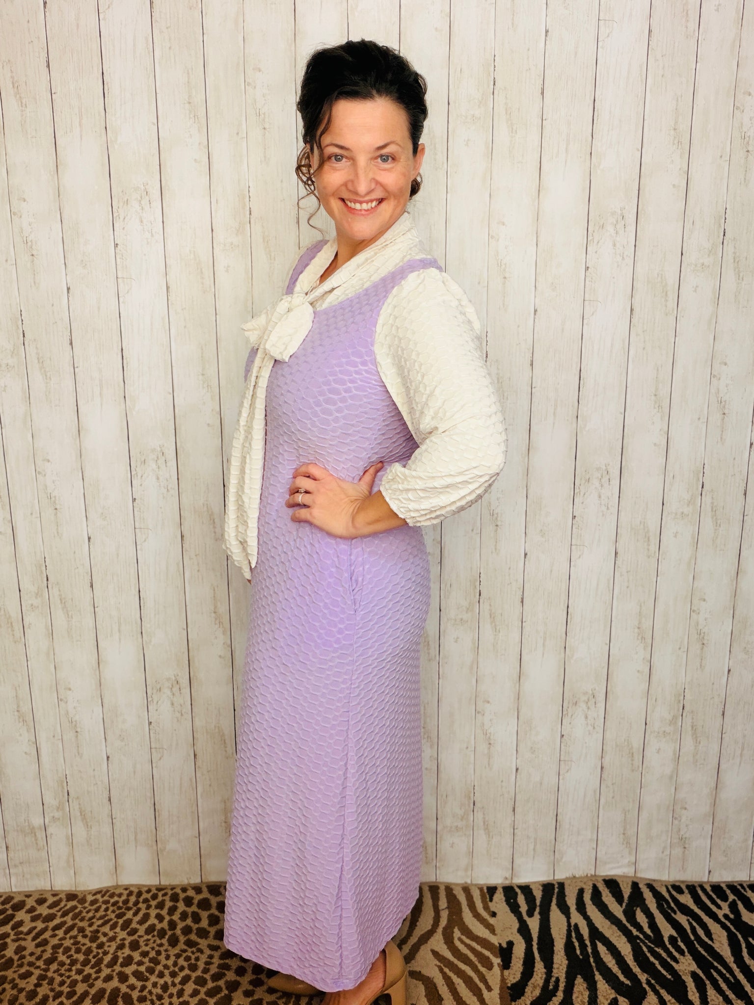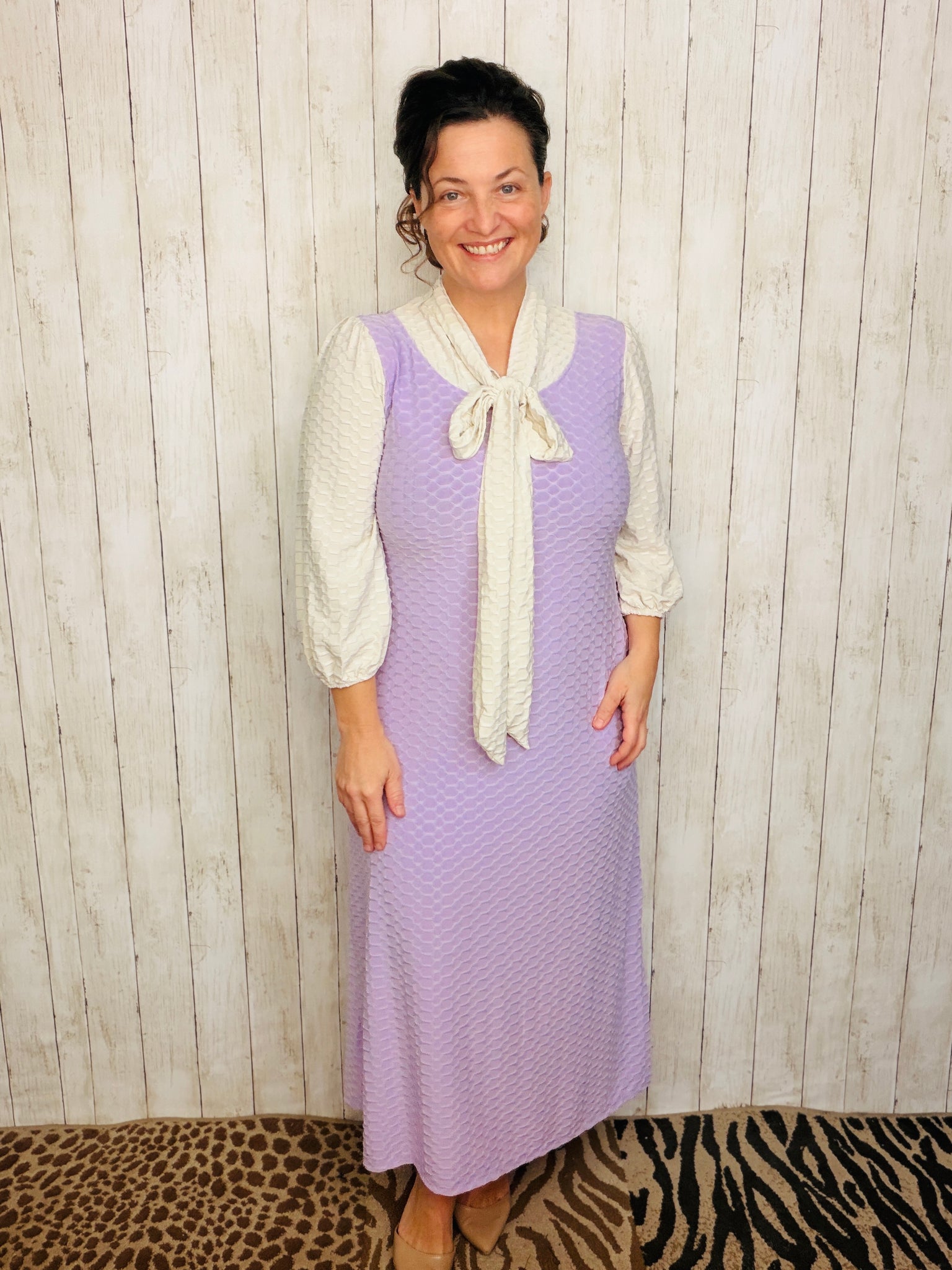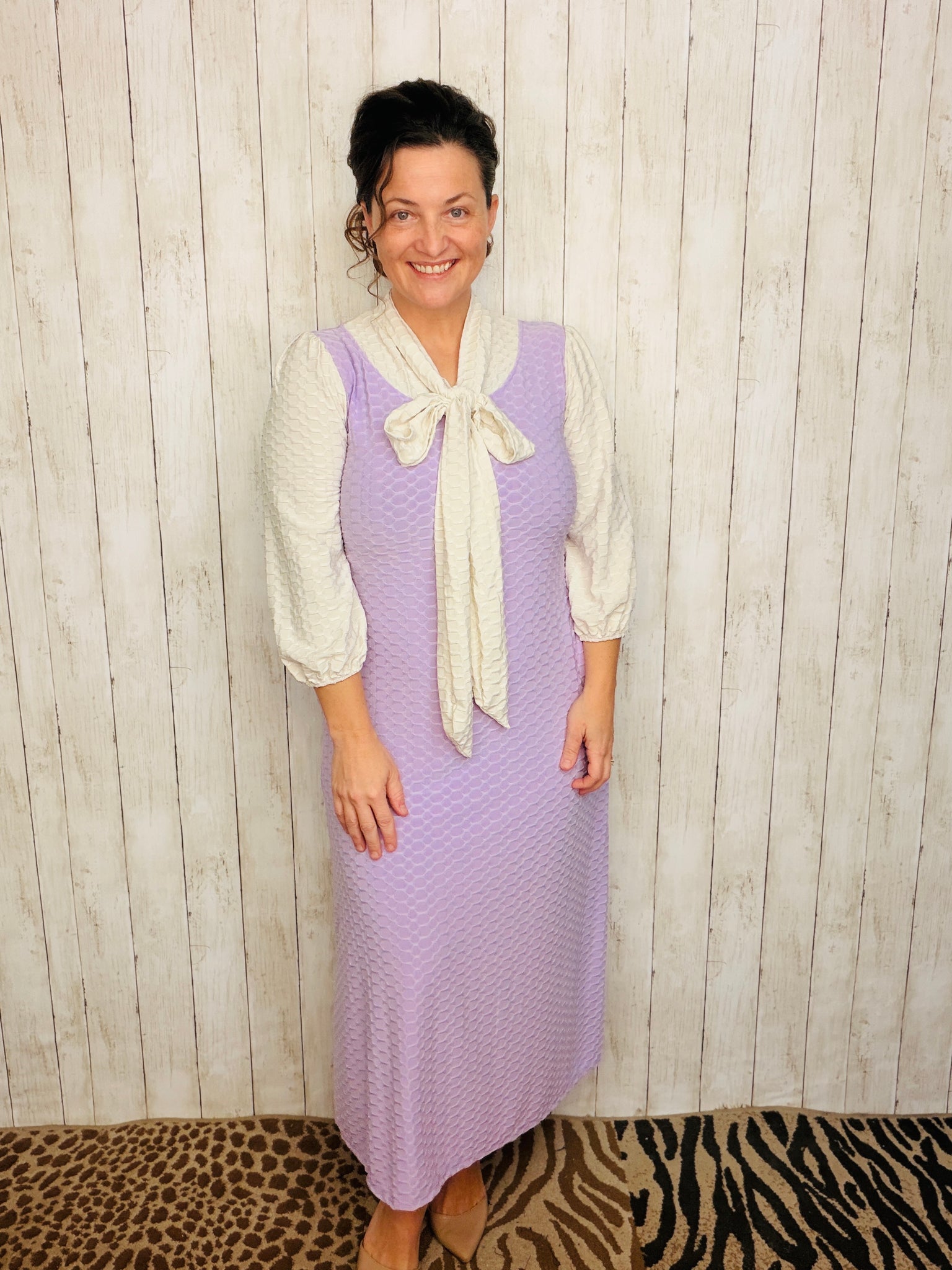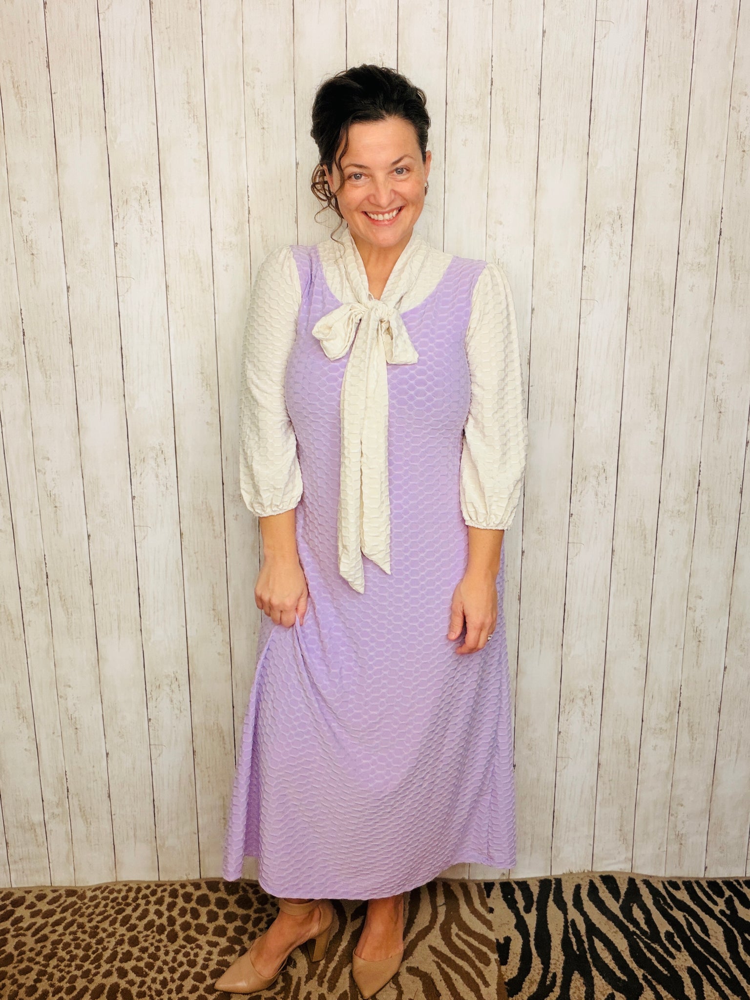 These dresses are stunning! A-line style that is flowy and easy to wear. Adorable & classy self tie bow at neck. Super stretchy and comfortable polyester and spandex (honeycomb textured) material is anti-wrinkle and has excellent coverage. Has pockets.