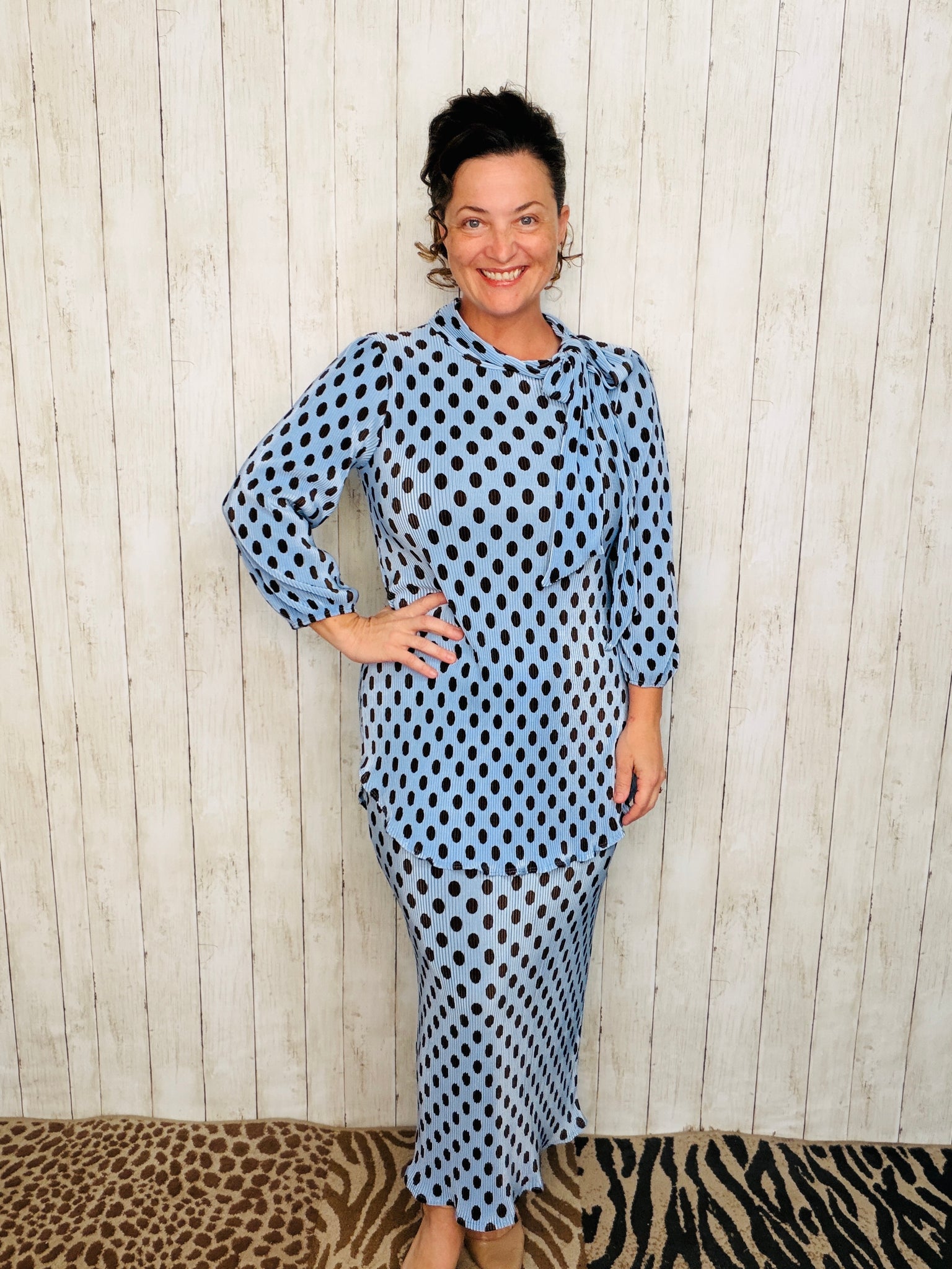 "Embrace effortless chic with our Bethany Bow Tie Top. Featuring a tie neck and 3/4 length sleeves with elastic, this modest tunic top boasts a roomy and rounded hemline for ultimate comfort. Made from a bodre material, slightly pleated for a unique texture. Made with polyester for easy care."
