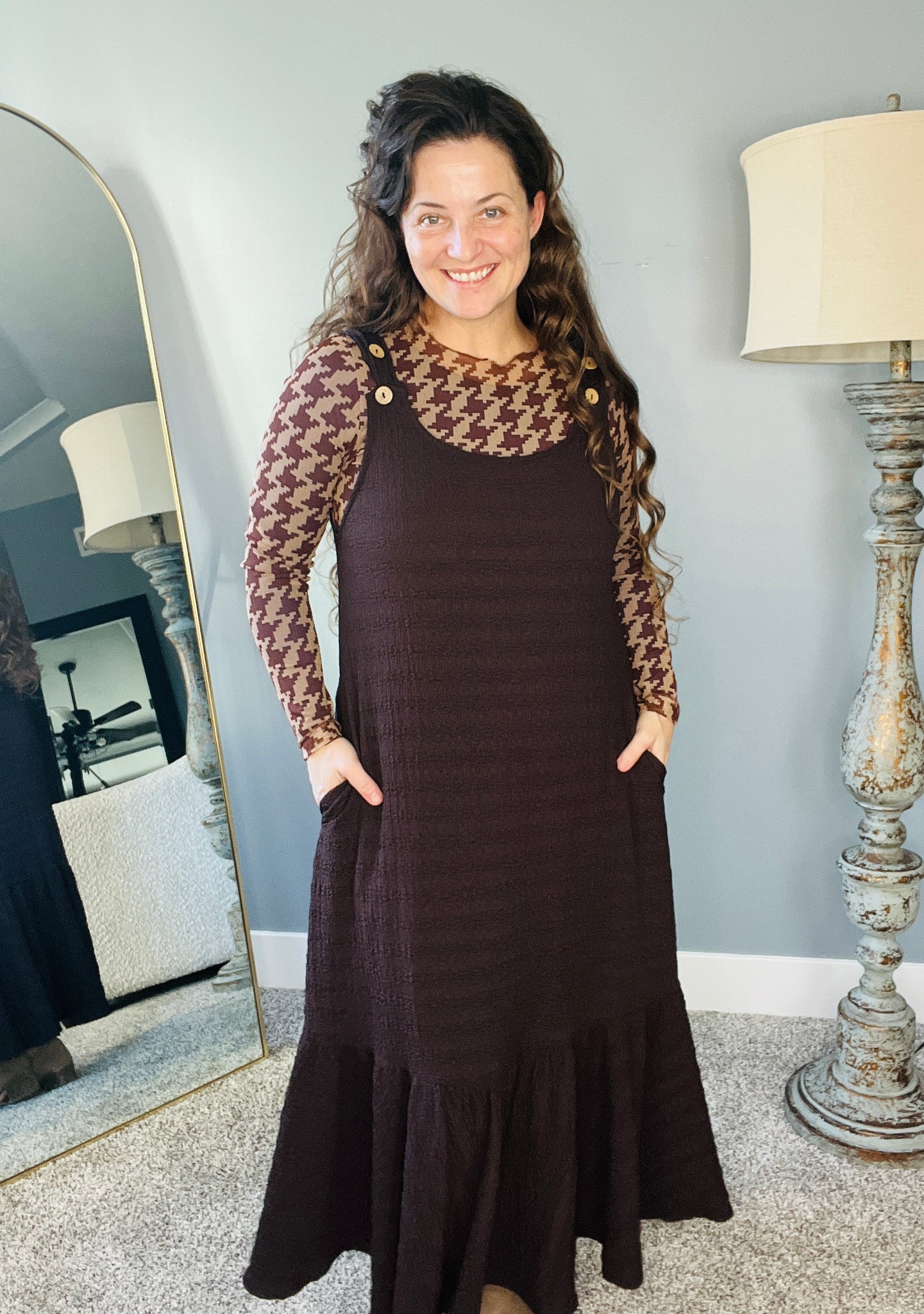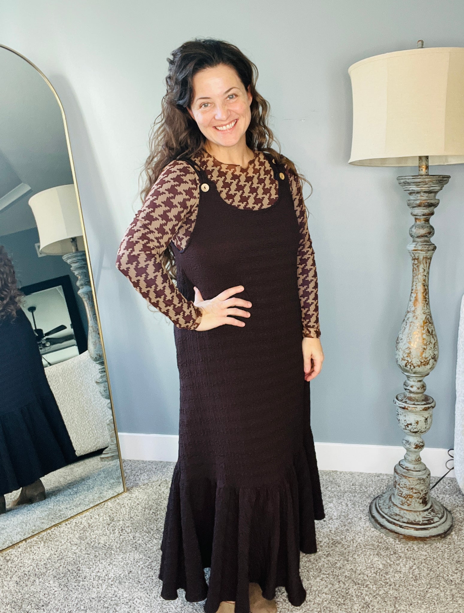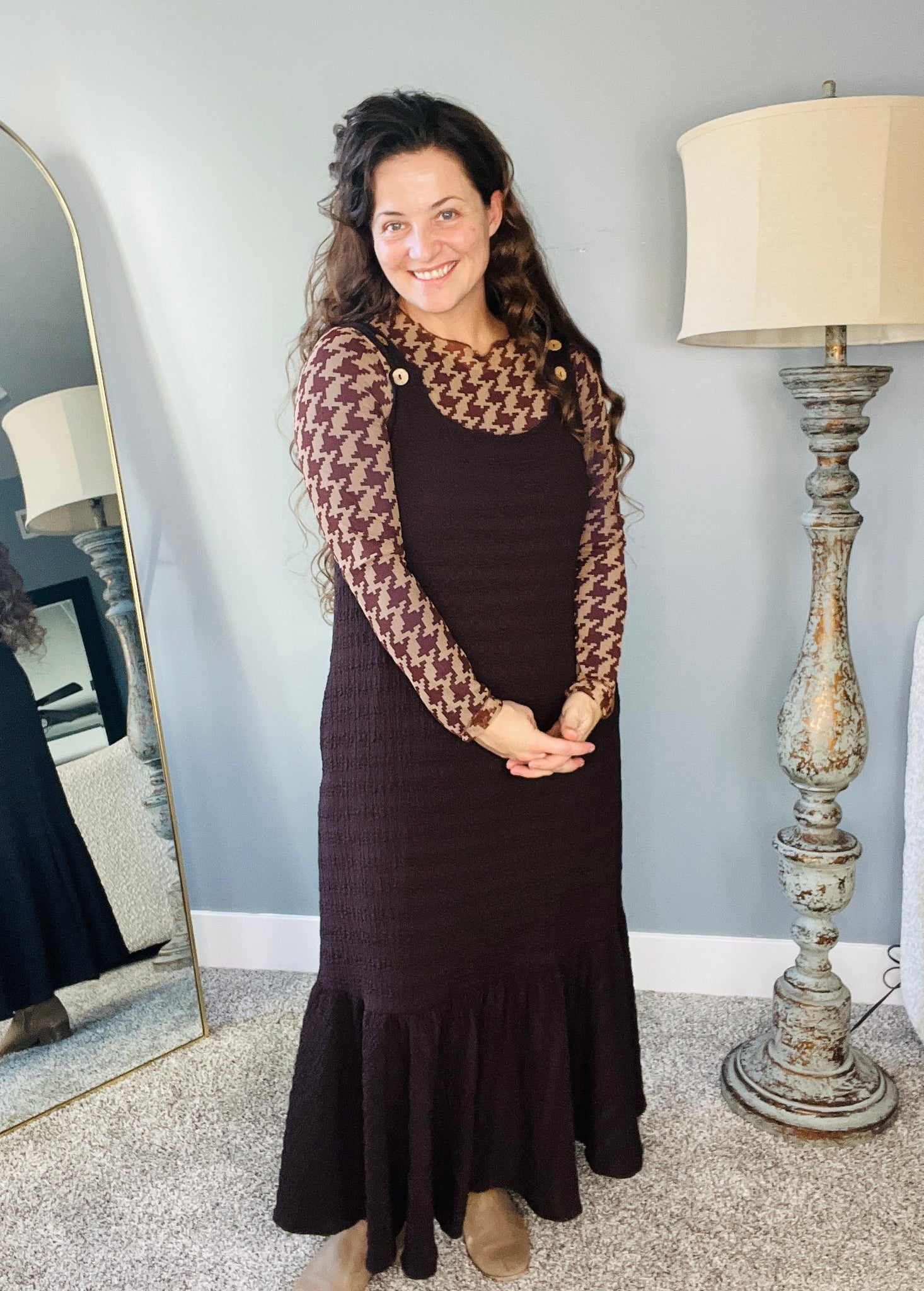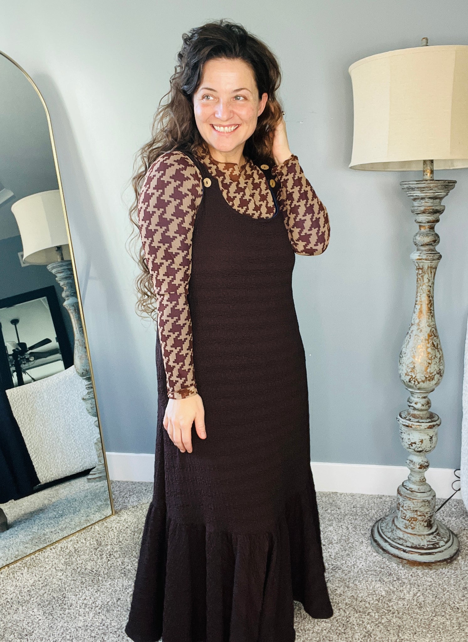 Brown Houndstooth Mesh Layering Style Top