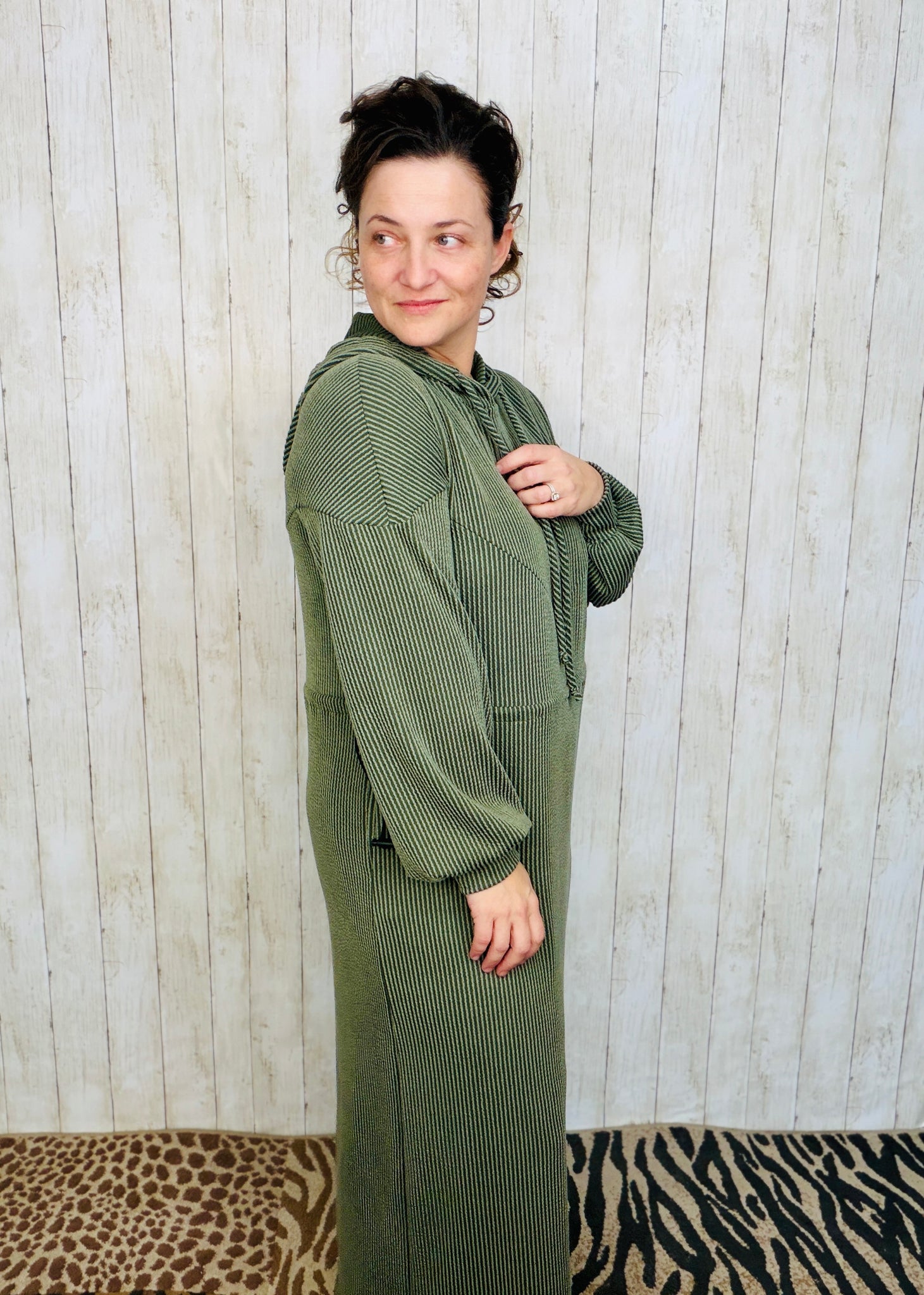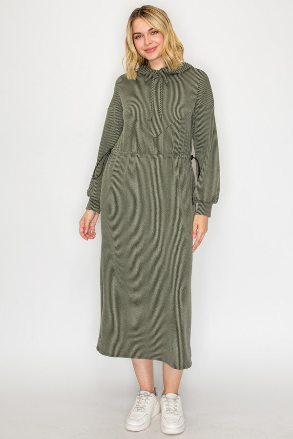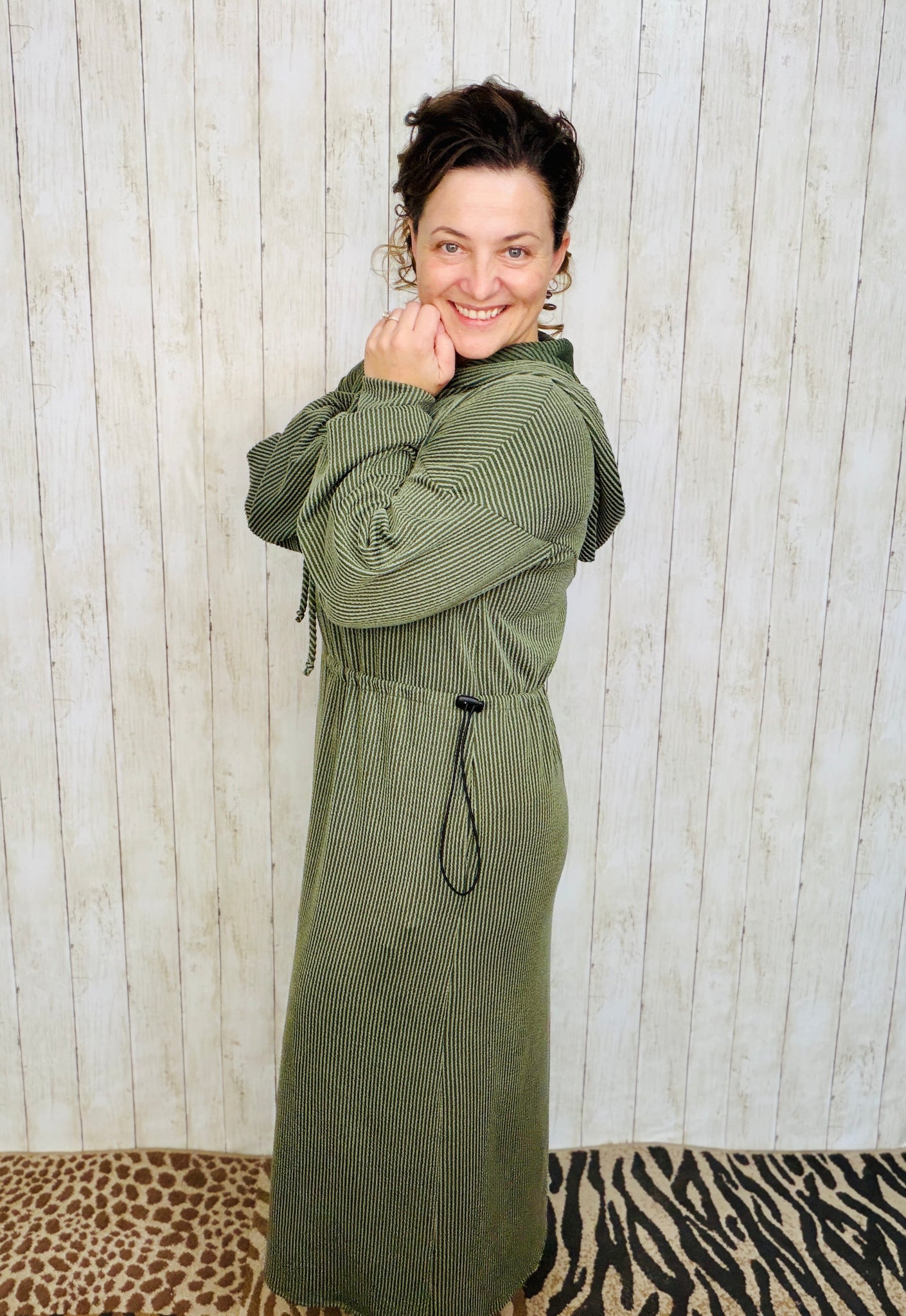 Sink into effortless comfort with this ribbed lounge dress, crafted from a luxurious blend of polyester, rayon, and spandex that feels as good as it looks. The adjustable drawstring waist lets you customize your fit, while the hood and long sleeves provide cozy coverage. Practical front pockets keep your essentials within reach. Perfect for lounging at home or running errands in style—this olive-hued piece is the ultimate go-to for relaxed, all-day wear.