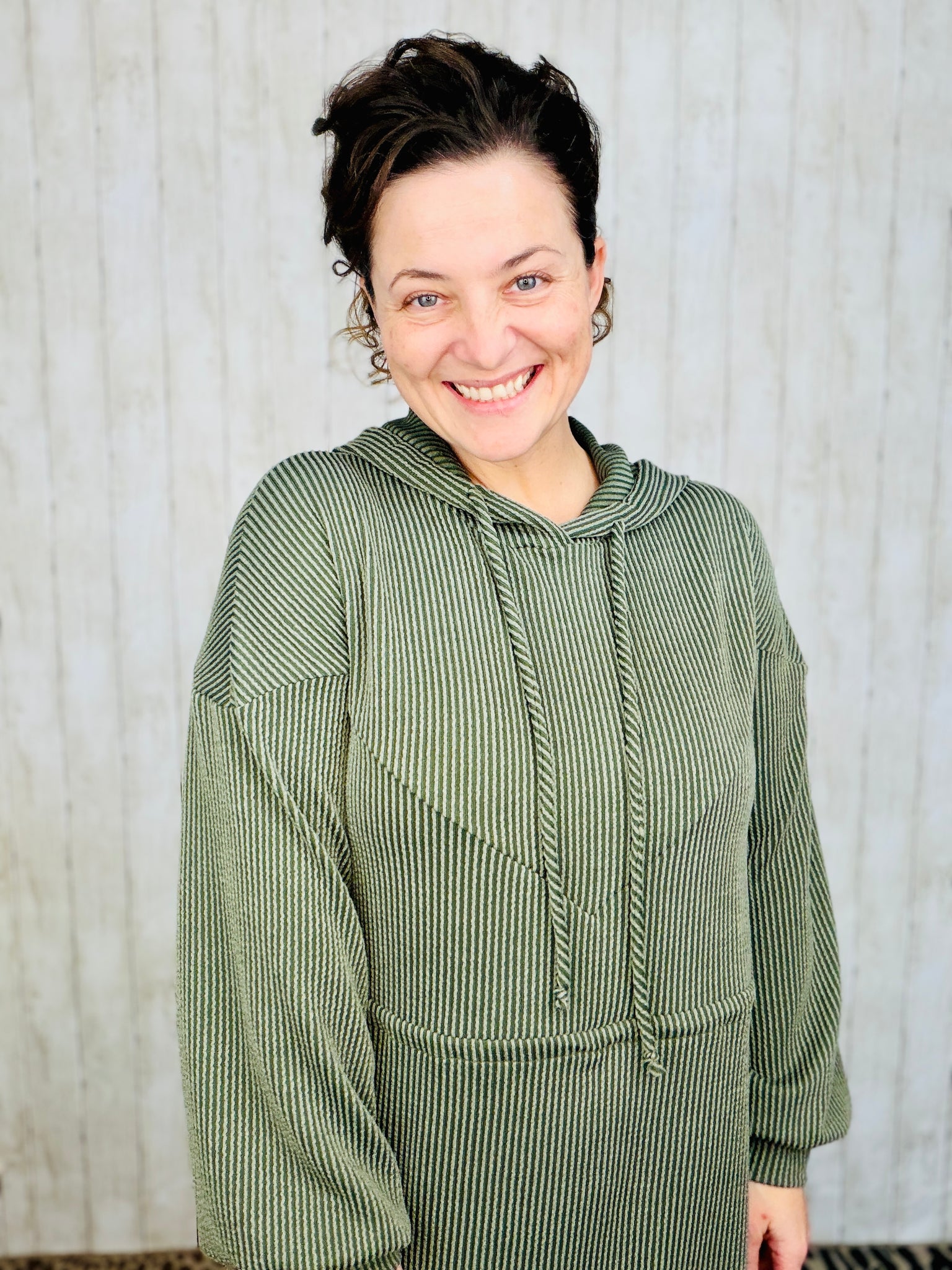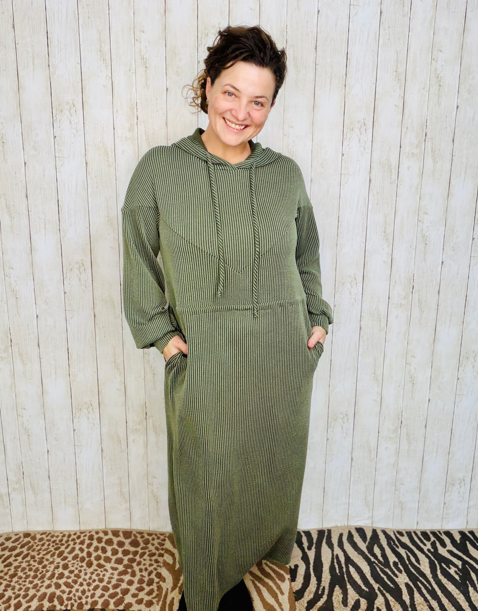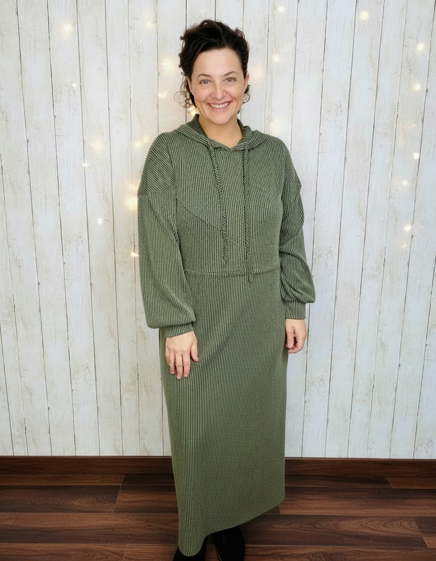 Sink into effortless comfort with this ribbed lounge dress, crafted from a luxurious blend of polyester, rayon, and spandex that feels as good as it looks. The adjustable drawstring waist lets you customize your fit, while the hood and long sleeves provide cozy coverage. Practical front pockets keep your essentials within reach. Perfect for lounging at home or running errands in style—this olive-hued piece is the ultimate go-to for relaxed, all-day wear.