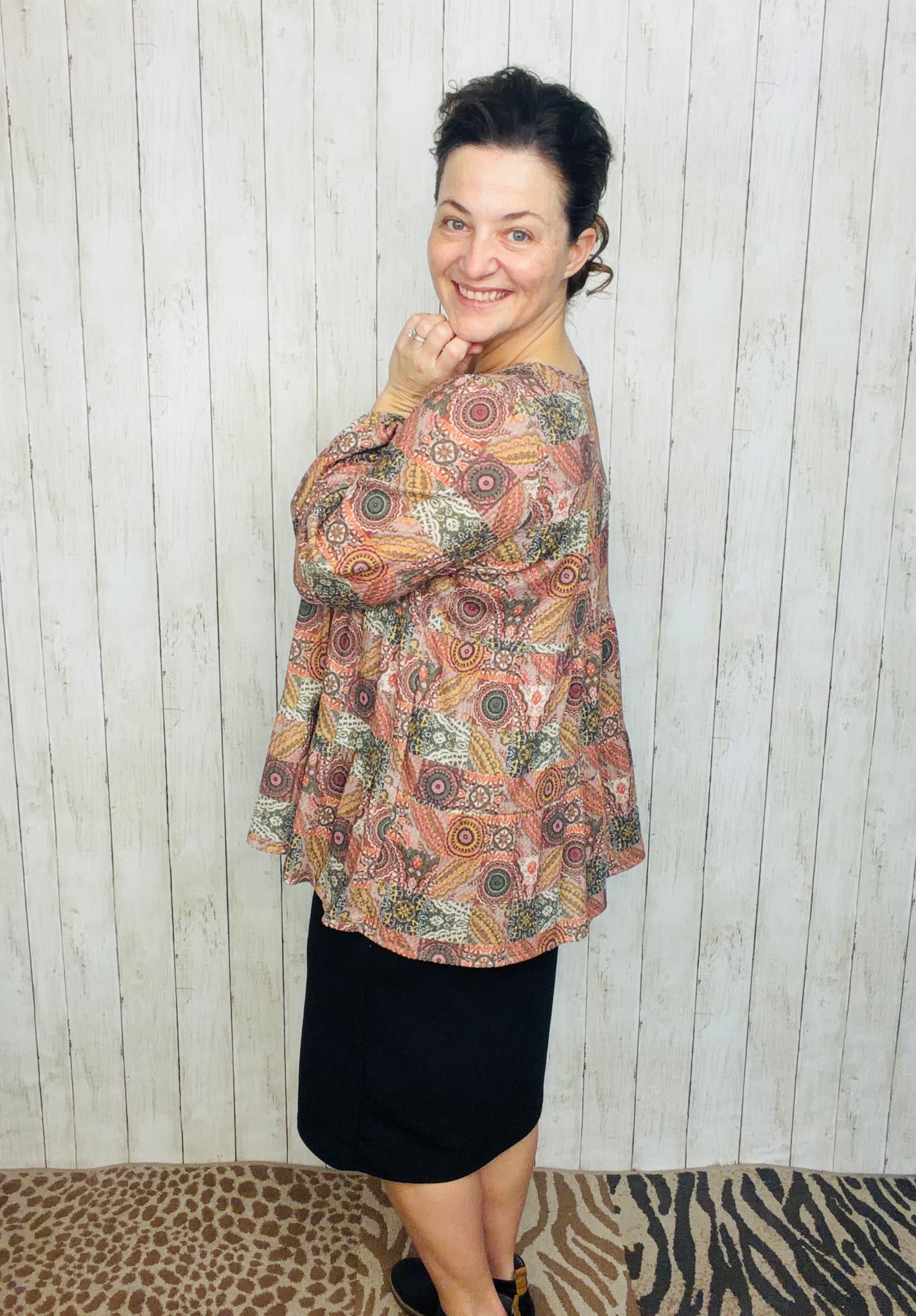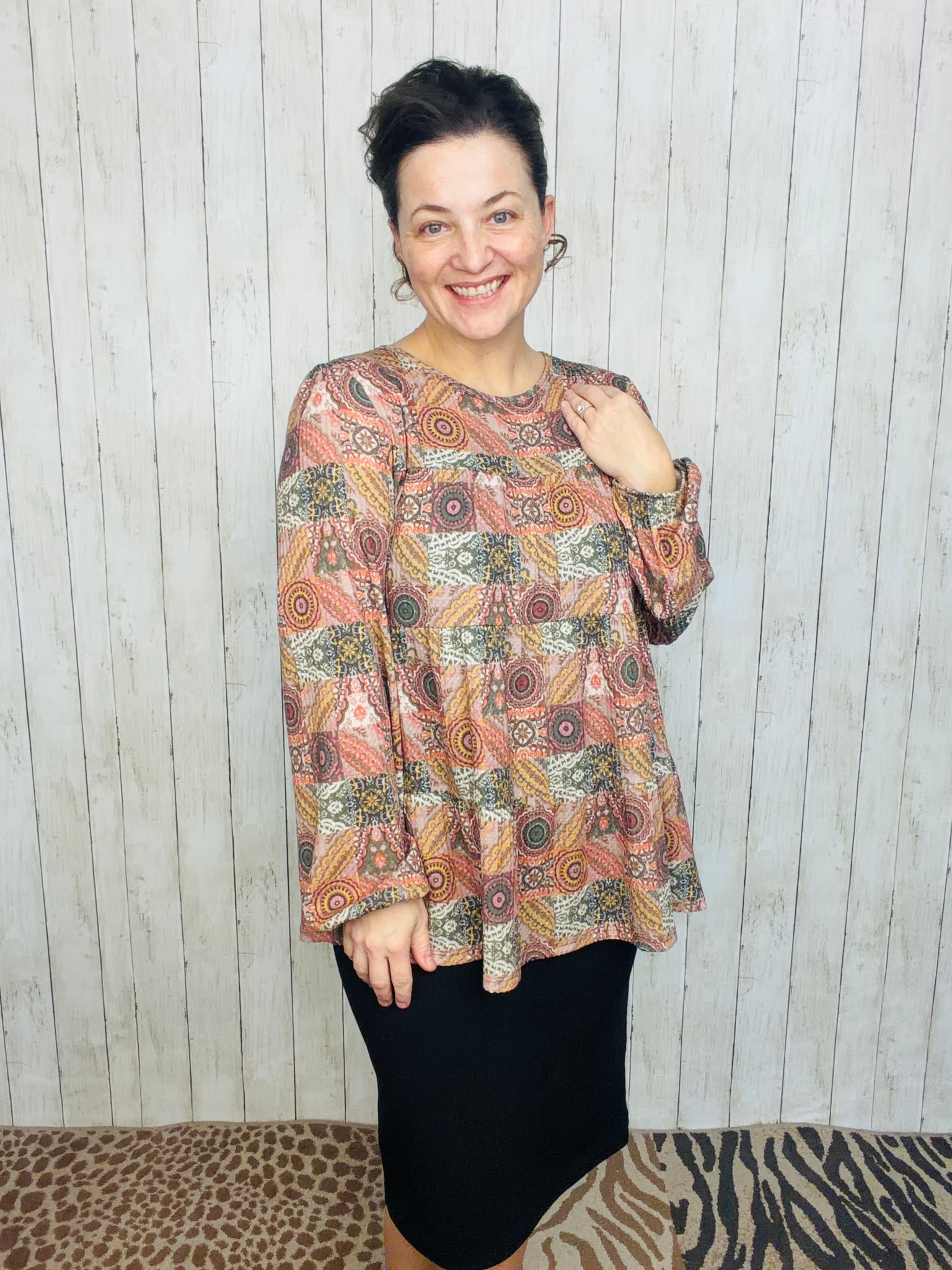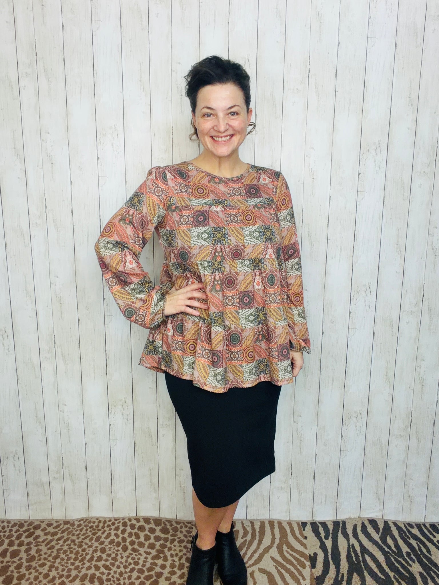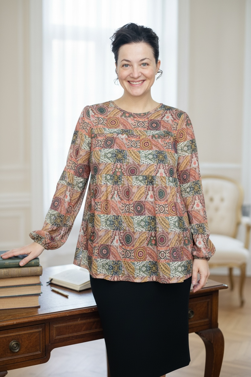 Elevate your wardrobe with the Dani Puff Sleeve Geometric Knit Top, designed for confident style and all-day comfort. Crafted from a premium blend of 95% polyester and 5% spandex, this plus-size top offers gentle stretch and durability. The statement puff sleeves frame the shoulders beautifully, while the round neckline keeps the look approachable and versatile. A striking geometric print adds visual interest, and the tiered silhouette creates flattering dimension. Perfect for layering or wearing solo, this knit top transitions seamlessly from casual outings to weekend gatherings.