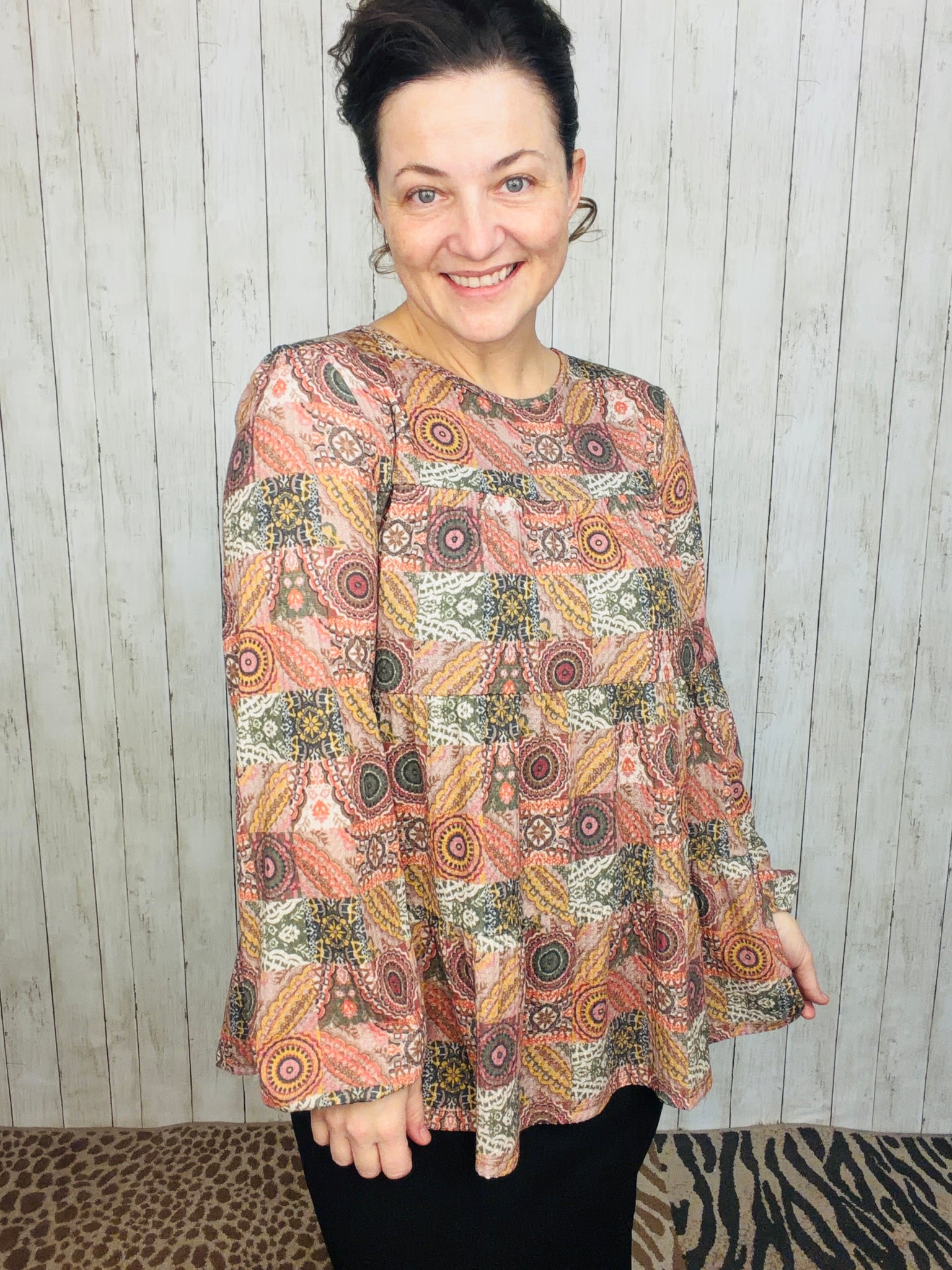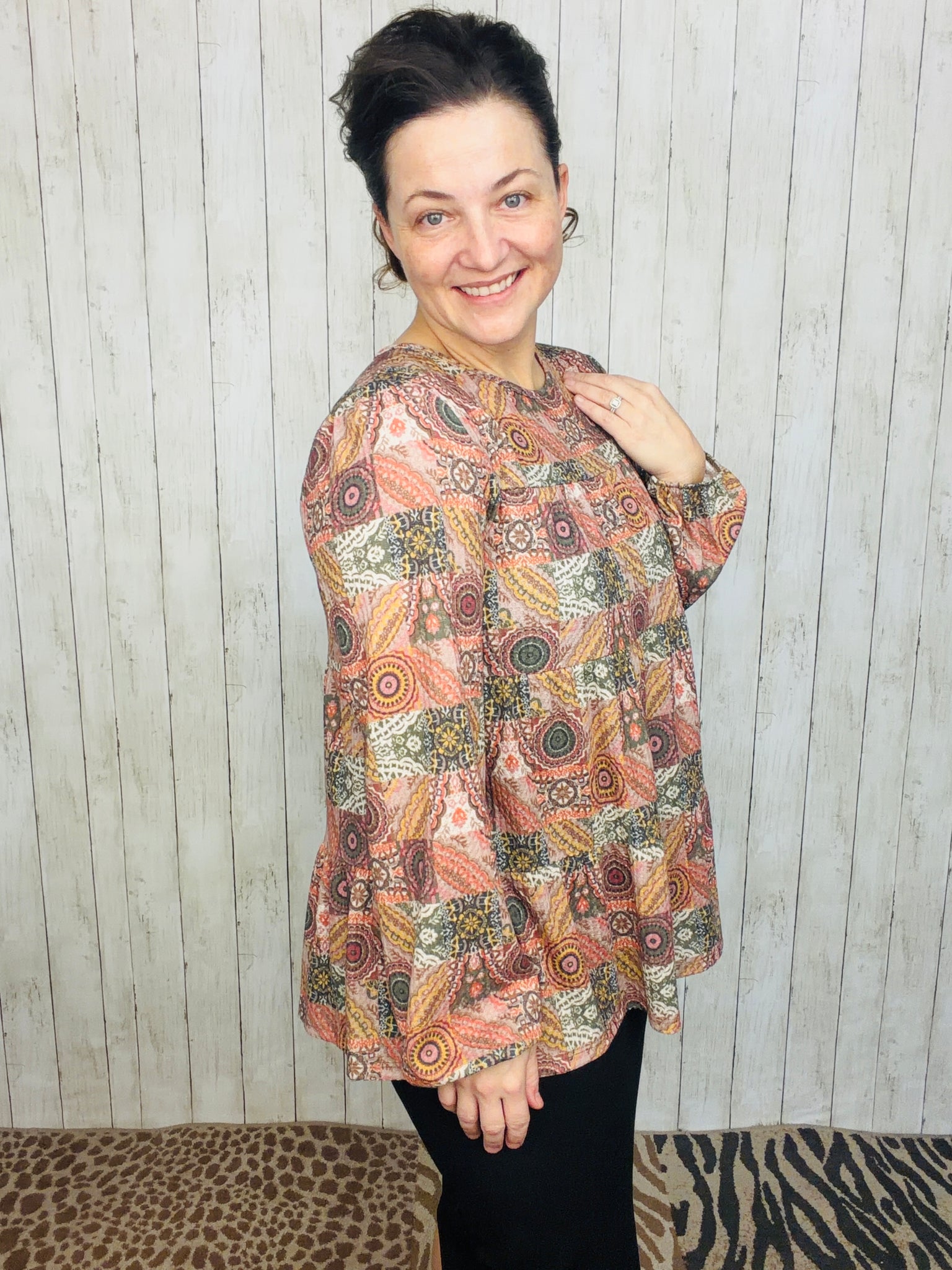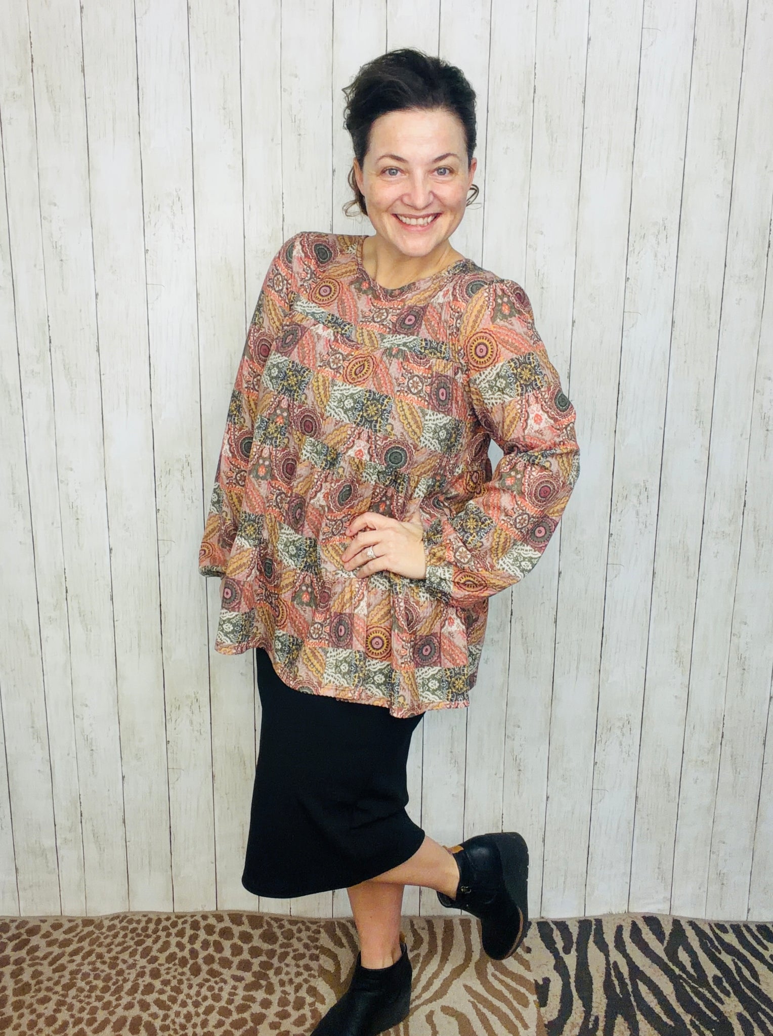 Elevate your wardrobe with the Dani Puff Sleeve Geometric Knit Top, designed for confident style and all-day comfort. Crafted from a premium blend of 95% polyester and 5% spandex, this plus-size top offers gentle stretch and durability. The statement puff sleeves frame the shoulders beautifully, while the round neckline keeps the look approachable and versatile. A striking geometric print adds visual interest, and the tiered silhouette creates flattering dimension. Perfect for layering or wearing solo, this knit top transitions seamlessly from casual outings to weekend gatherings.