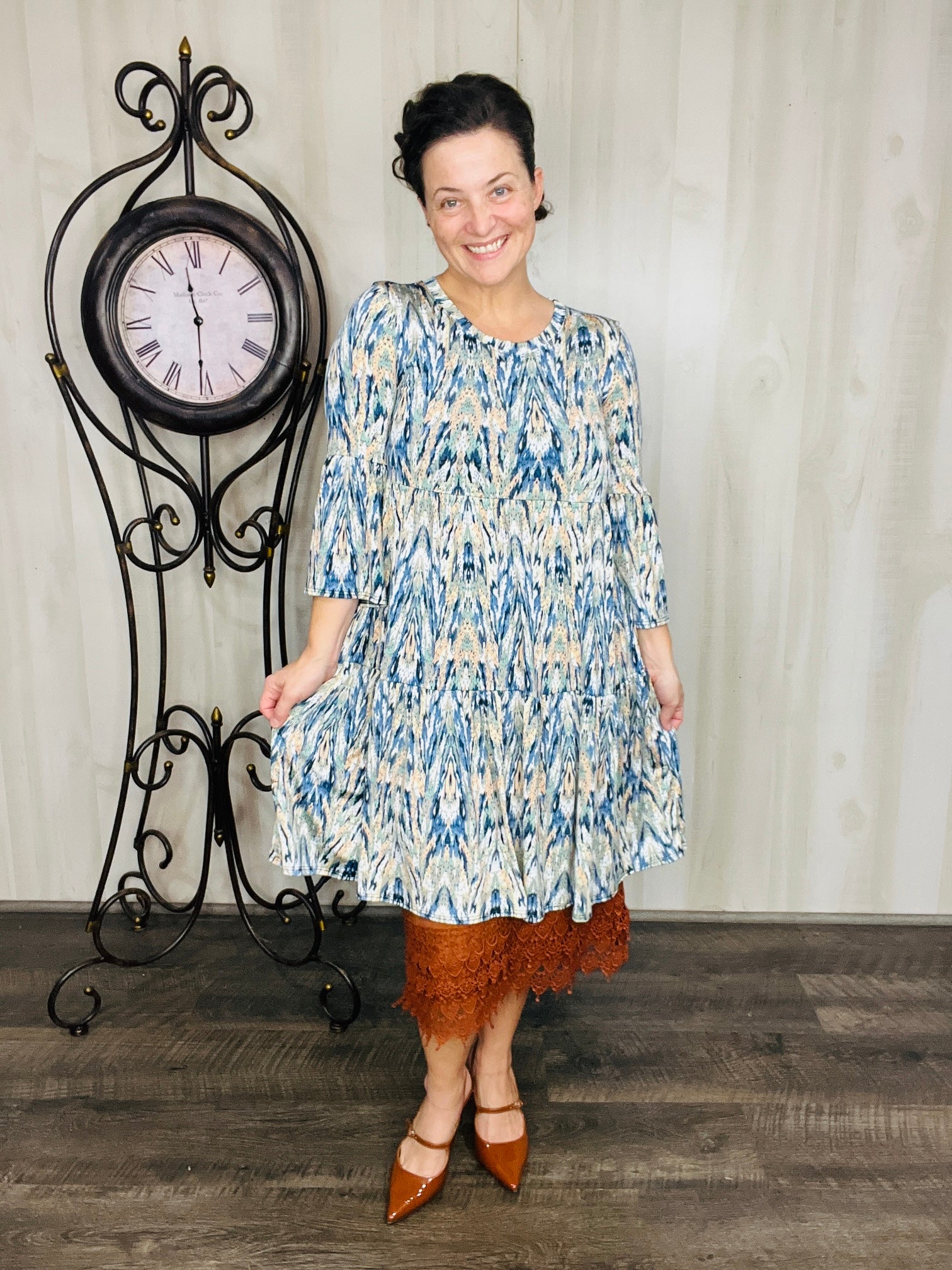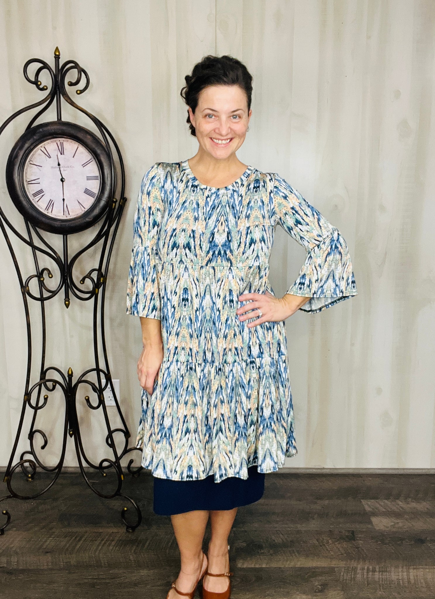 Step into effortless style with the Feminine & Fabulous Tunic. Its playful bell sleeves and round neckline add a whimsical touch, while the A-line flowy cut ensures comfortable movement. Crafted from a stretchy polyester and spandex blend, this tunic falls just right and features handy pockets for your essentials.