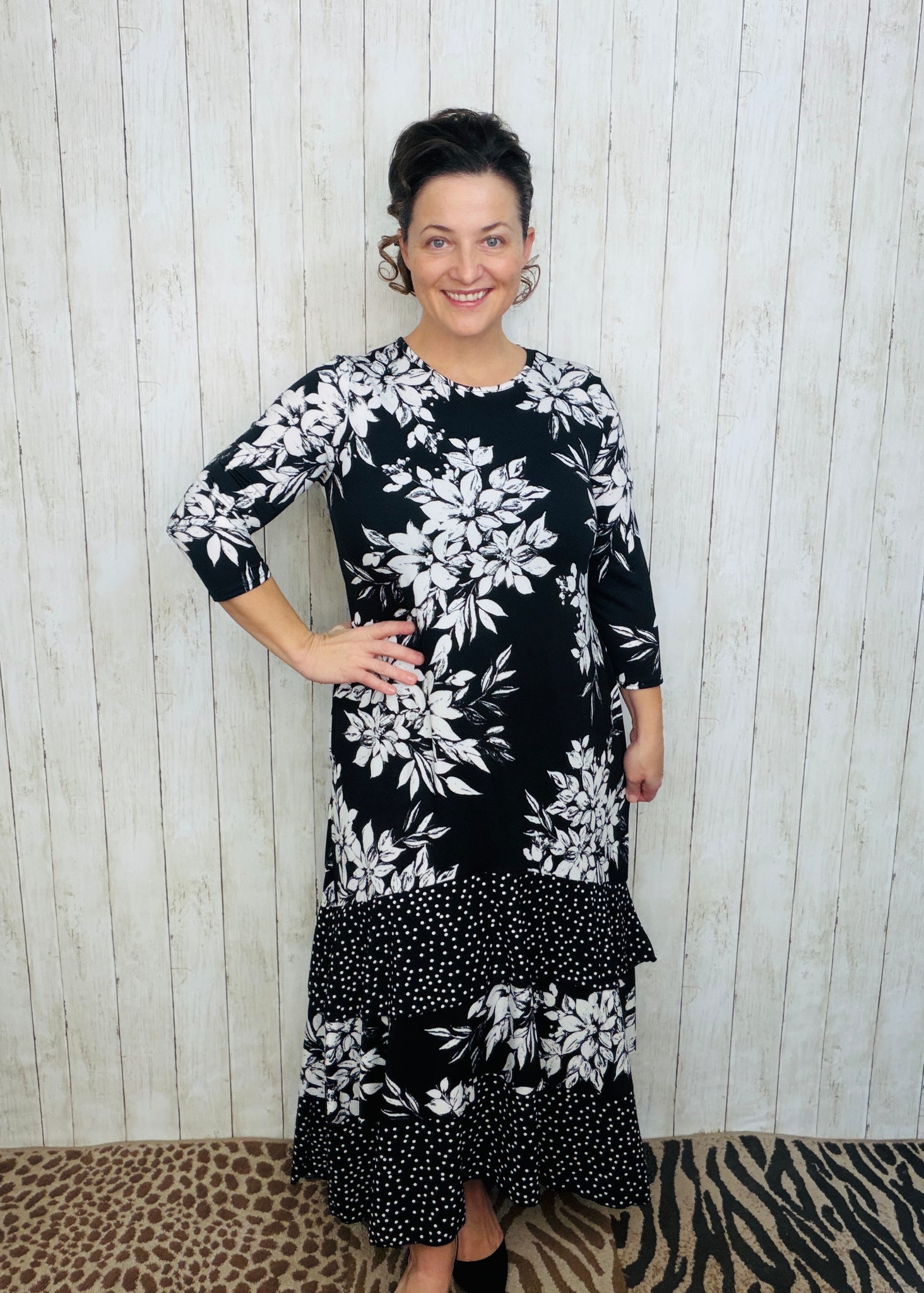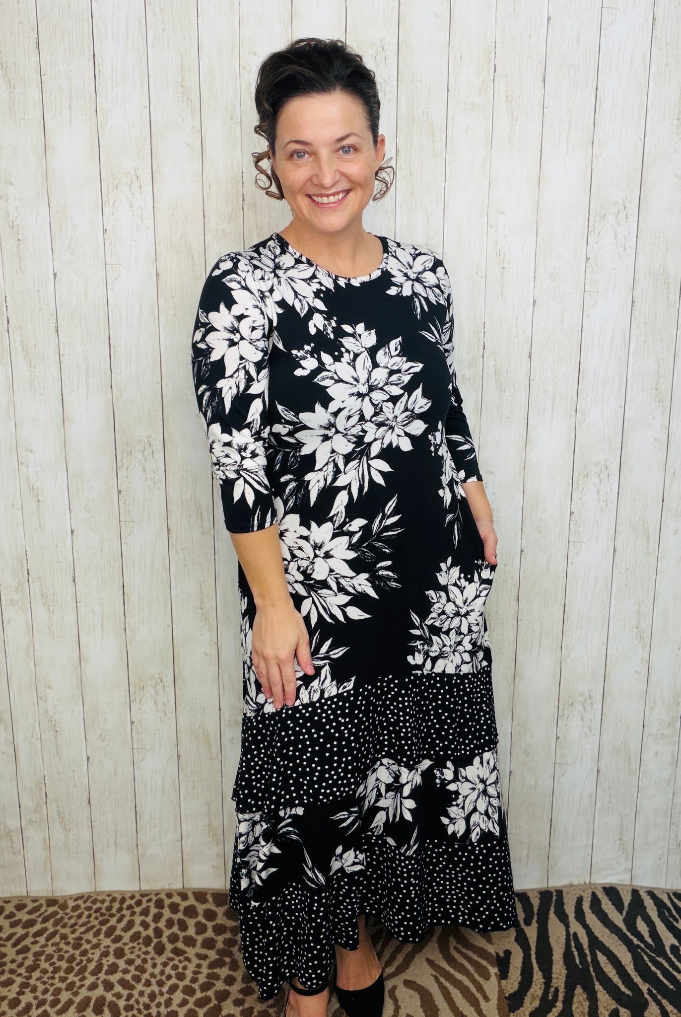 This dress is made with tiers of polkadots on a floral background making it a fun and playful addition to your wardrobe. The slight high-low style adds a unique touch, while the 3/4 length sleeves provide coverage and comfort. Fully lined and made with a stretchy and anti-wrinkle fabric, this dress is practical and stylish.