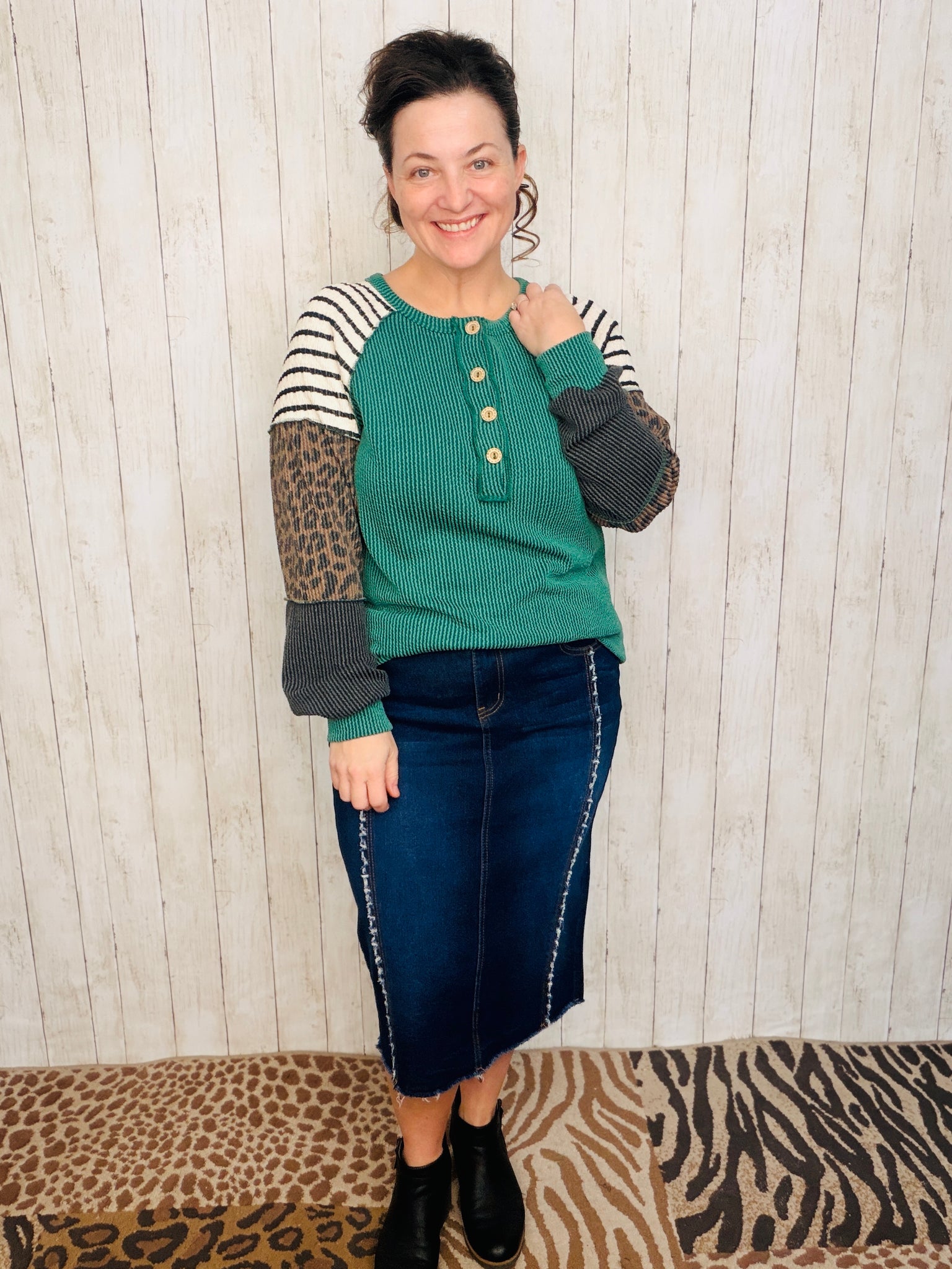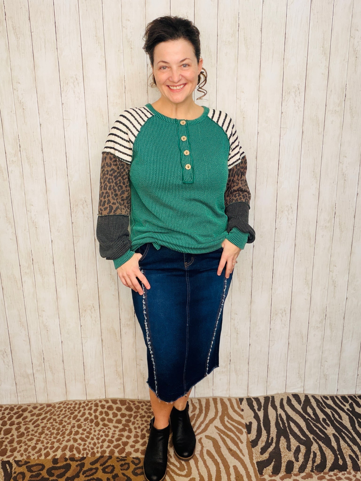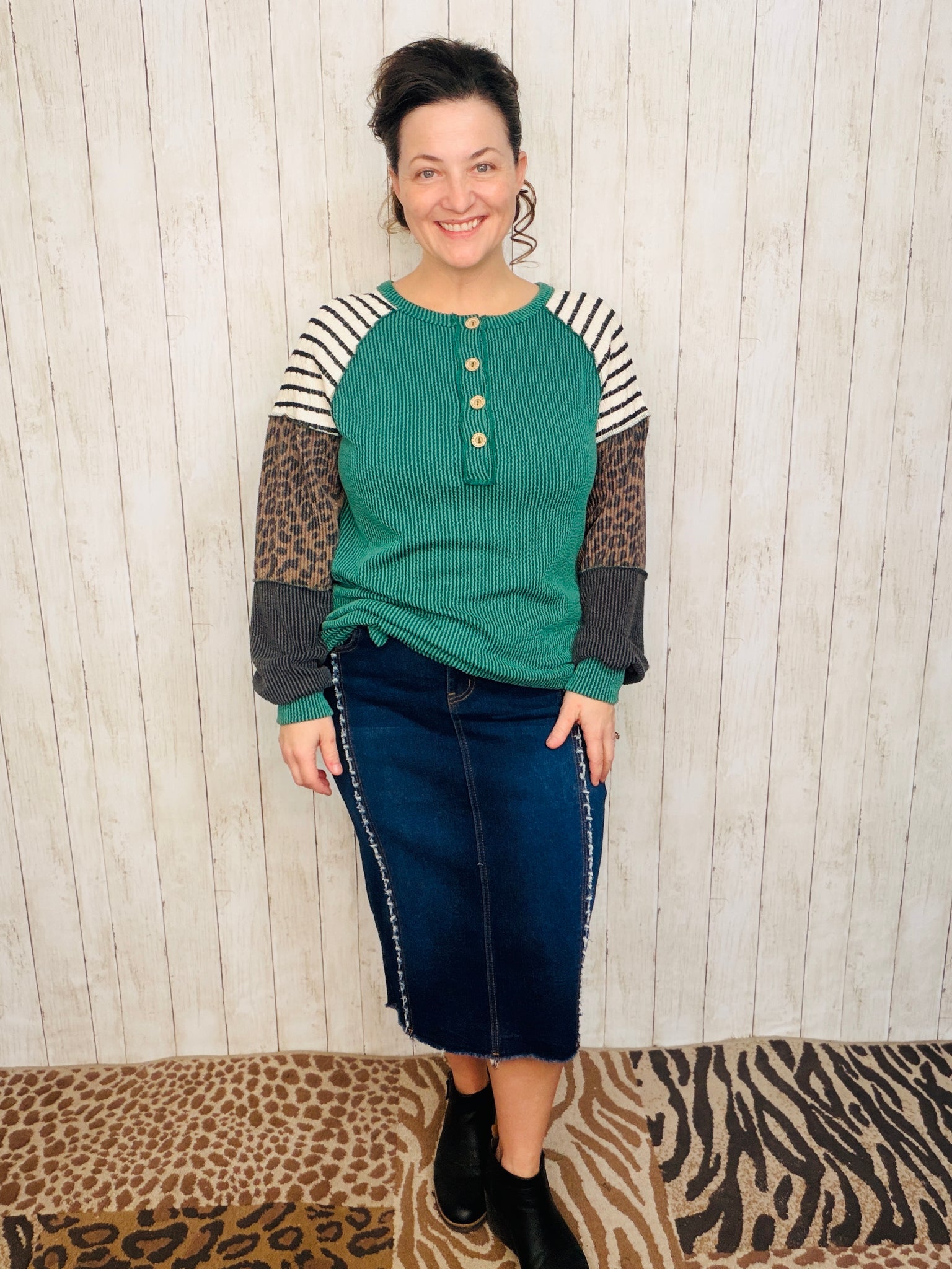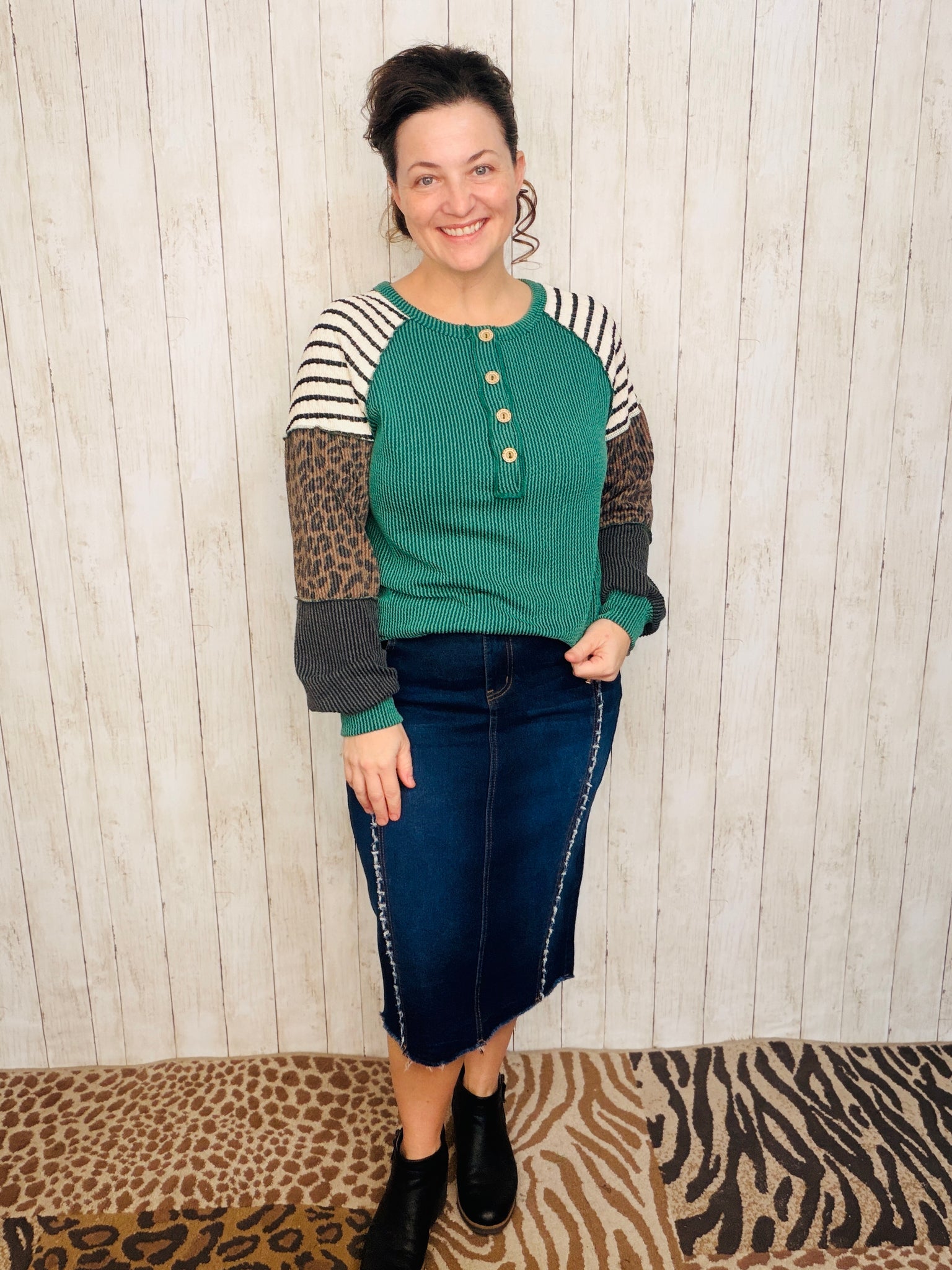 Gina Leopard & Stripes Ribbed Top Crafted from a premium blend of 95% polyester and 5% spandex, this long-sleeve v-neck top combines comfort with contemporary style. The urban rib fabric provides a structured yet flexible fit that moves with you throughout the day. Eye-catching leopard print and striped details on the sleeves add visual interest to the solid body, while the button-front closure offers easy layering versatility. Perfect for creating effortless, on-trend looks that transition seamlessly from casual to elevated occasions.
