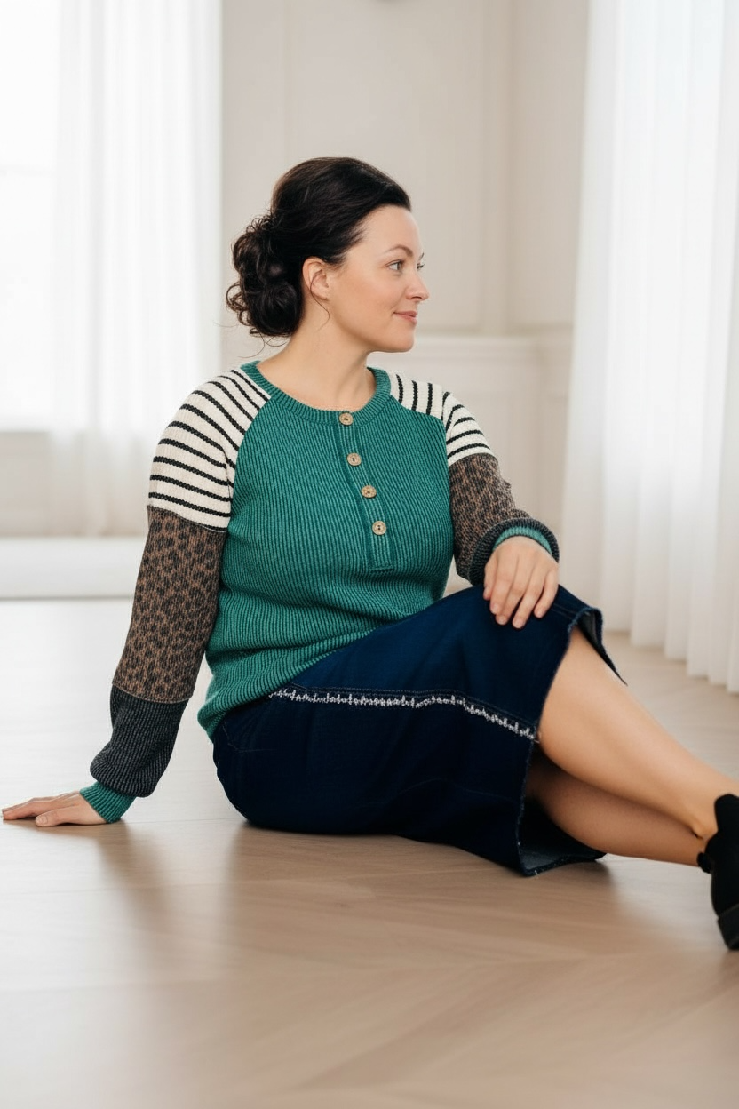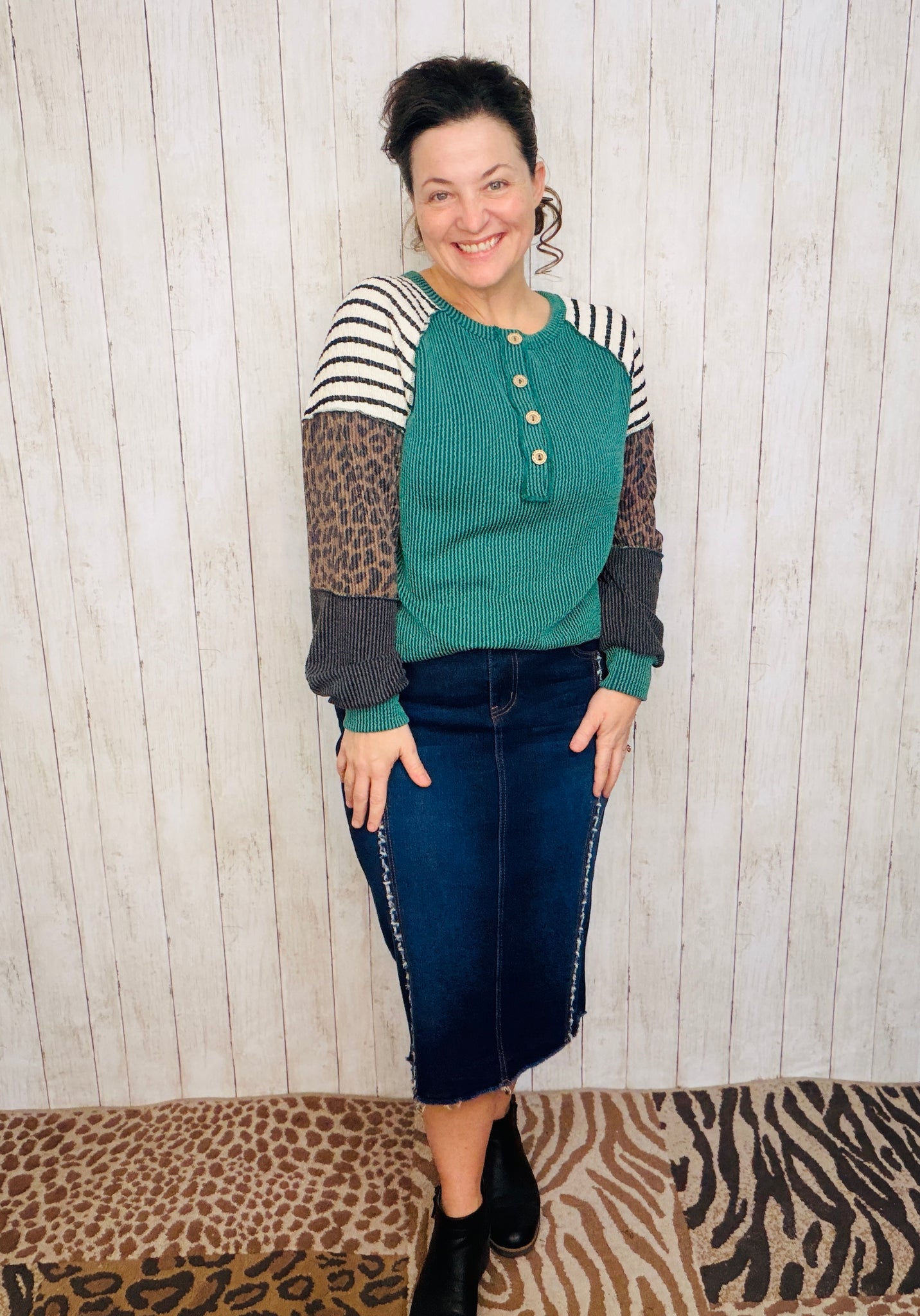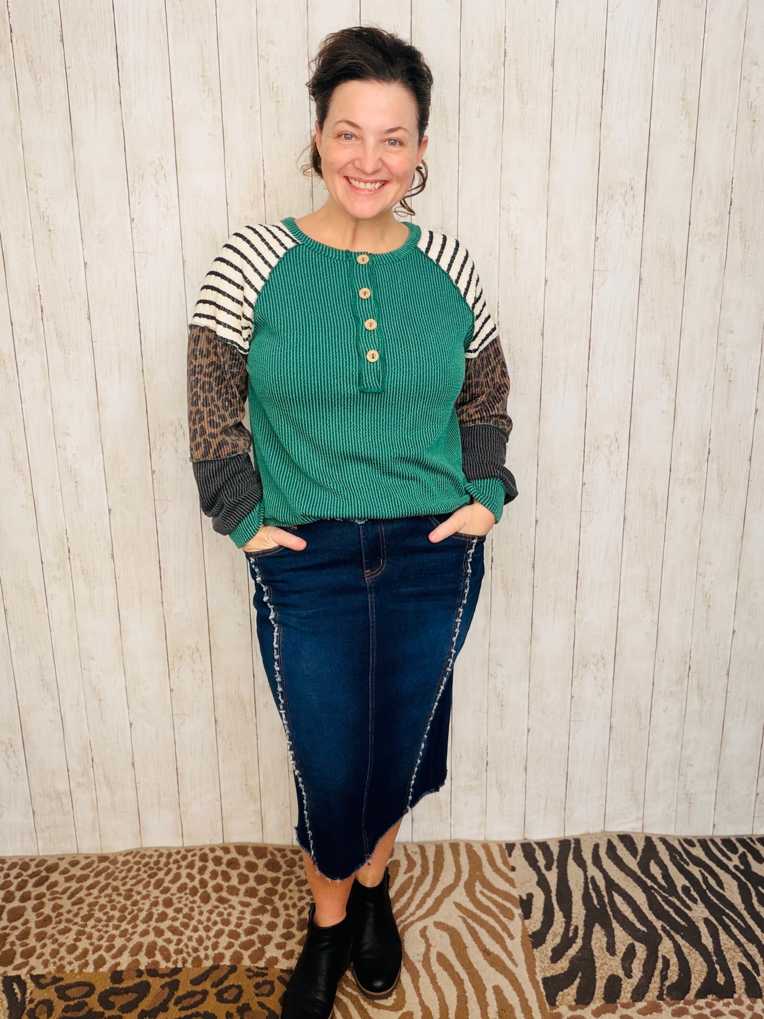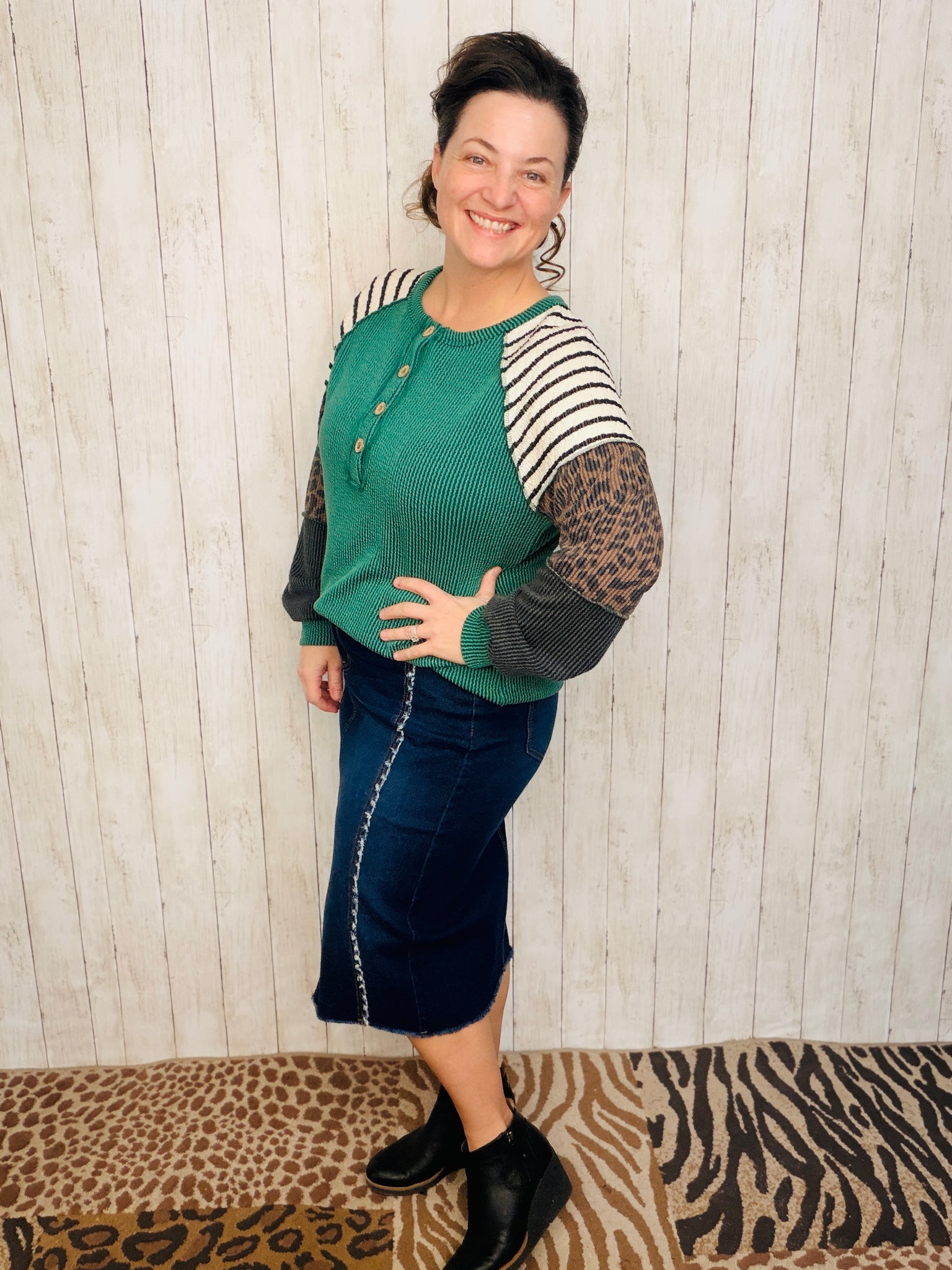 Gina Leopard & Stripes Ribbed Top Crafted from a premium blend of 95% polyester and 5% spandex, this long-sleeve v-neck top combines comfort with contemporary style. The urban rib fabric provides a structured yet flexible fit that moves with you throughout the day. Eye-catching leopard print and striped details on the sleeves add visual interest to the solid body, while the button-front closure offers easy layering versatility. Perfect for creating effortless, on-trend looks that transition seamlessly from casual to elevated occasions.