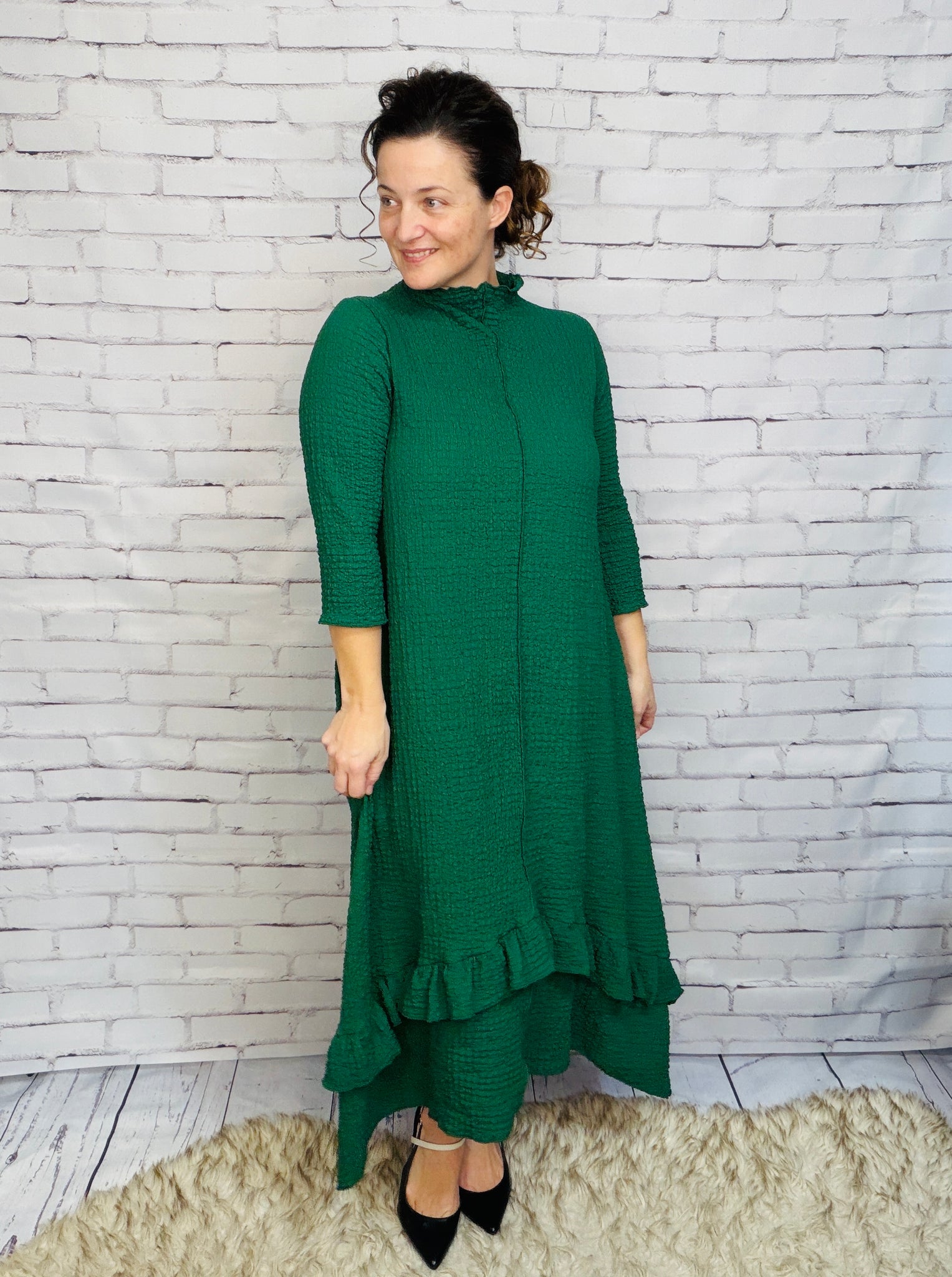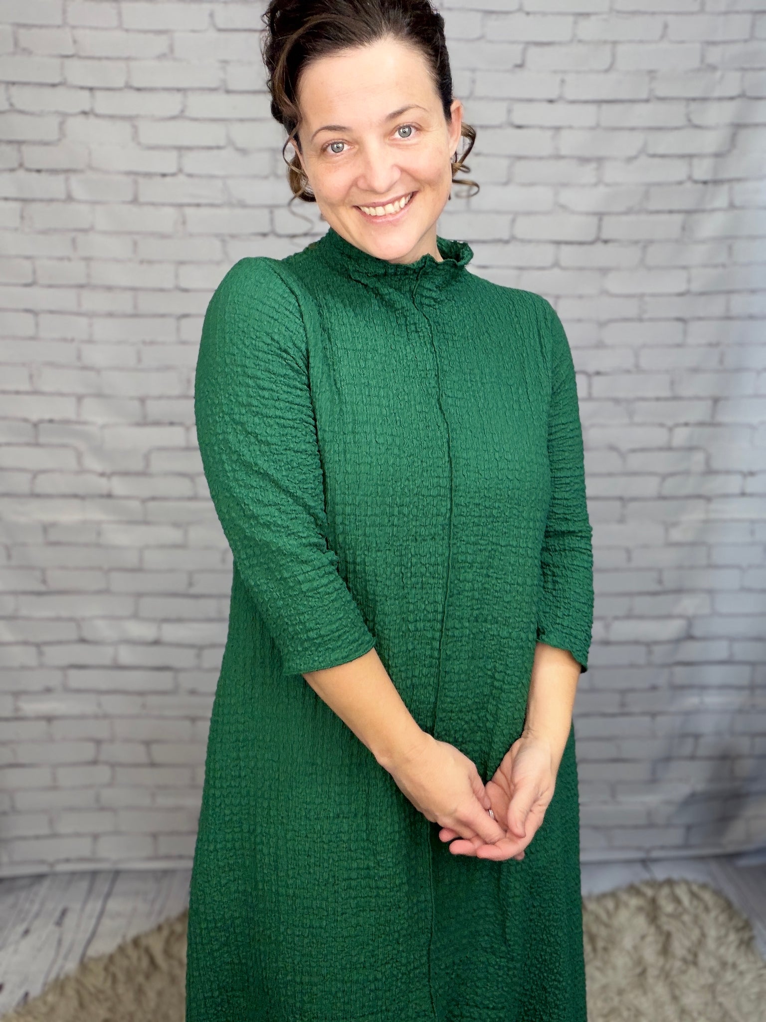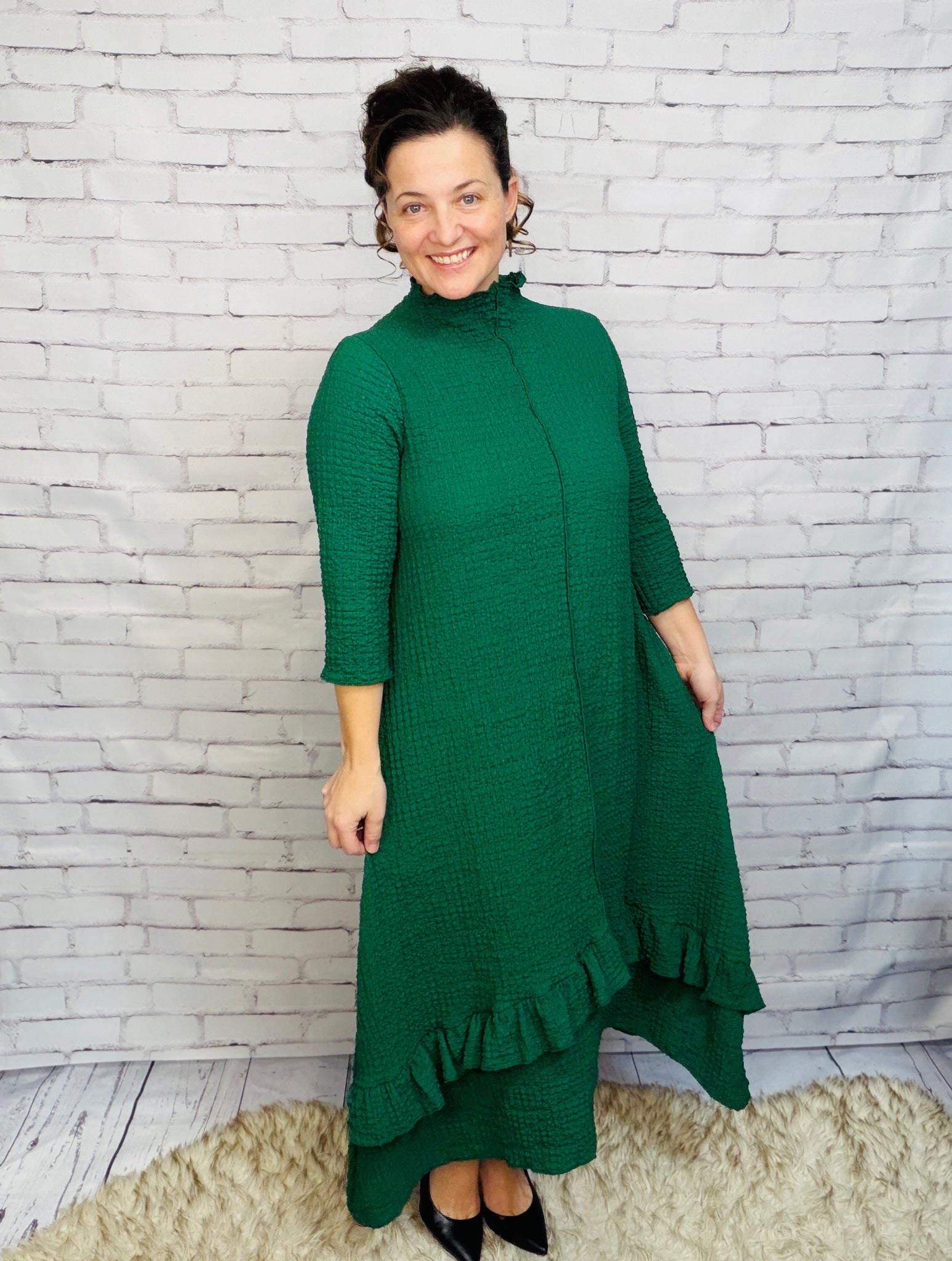 This dress is a MUST HAVE! Classy vintage style, with a lightweight textured material. This dress features 3/4 length sleeves, an outside front seam, and a crew neckline. Its asymmetrical hemline adds a playful touch. Perfect for all seasons, its anti-wrinkle fabric ensures you'll look effortlessly stylish.