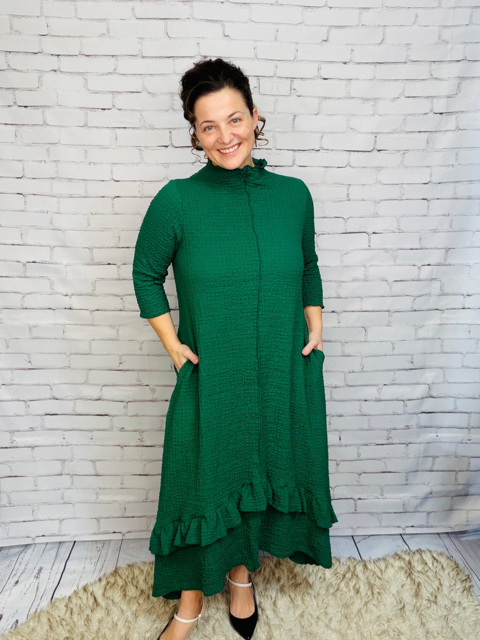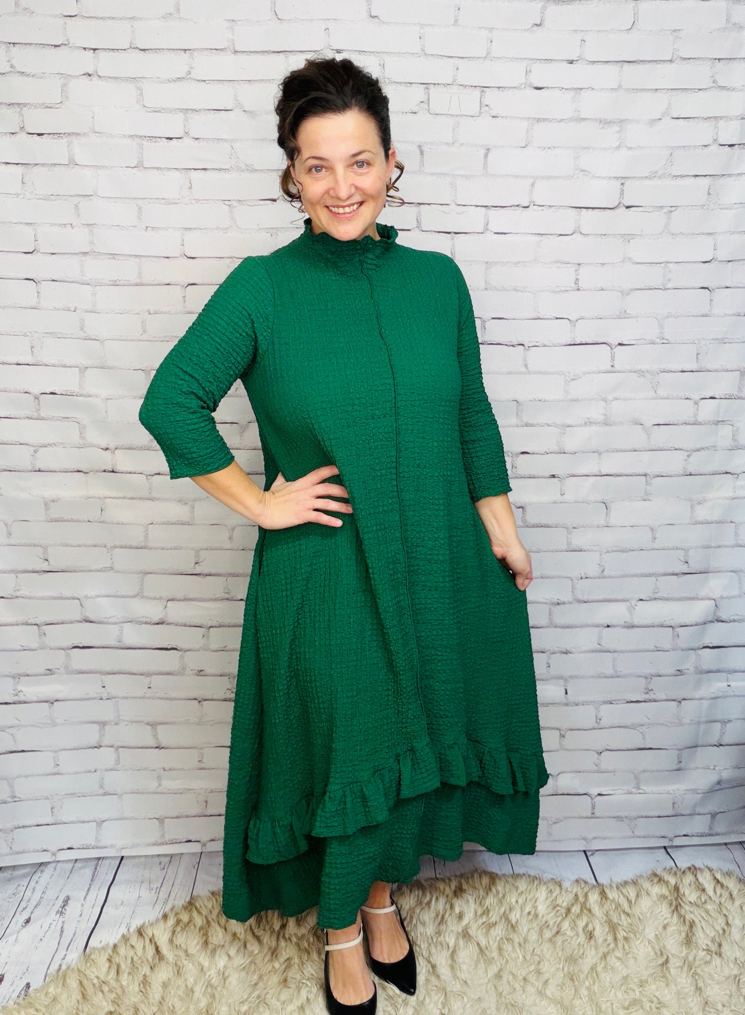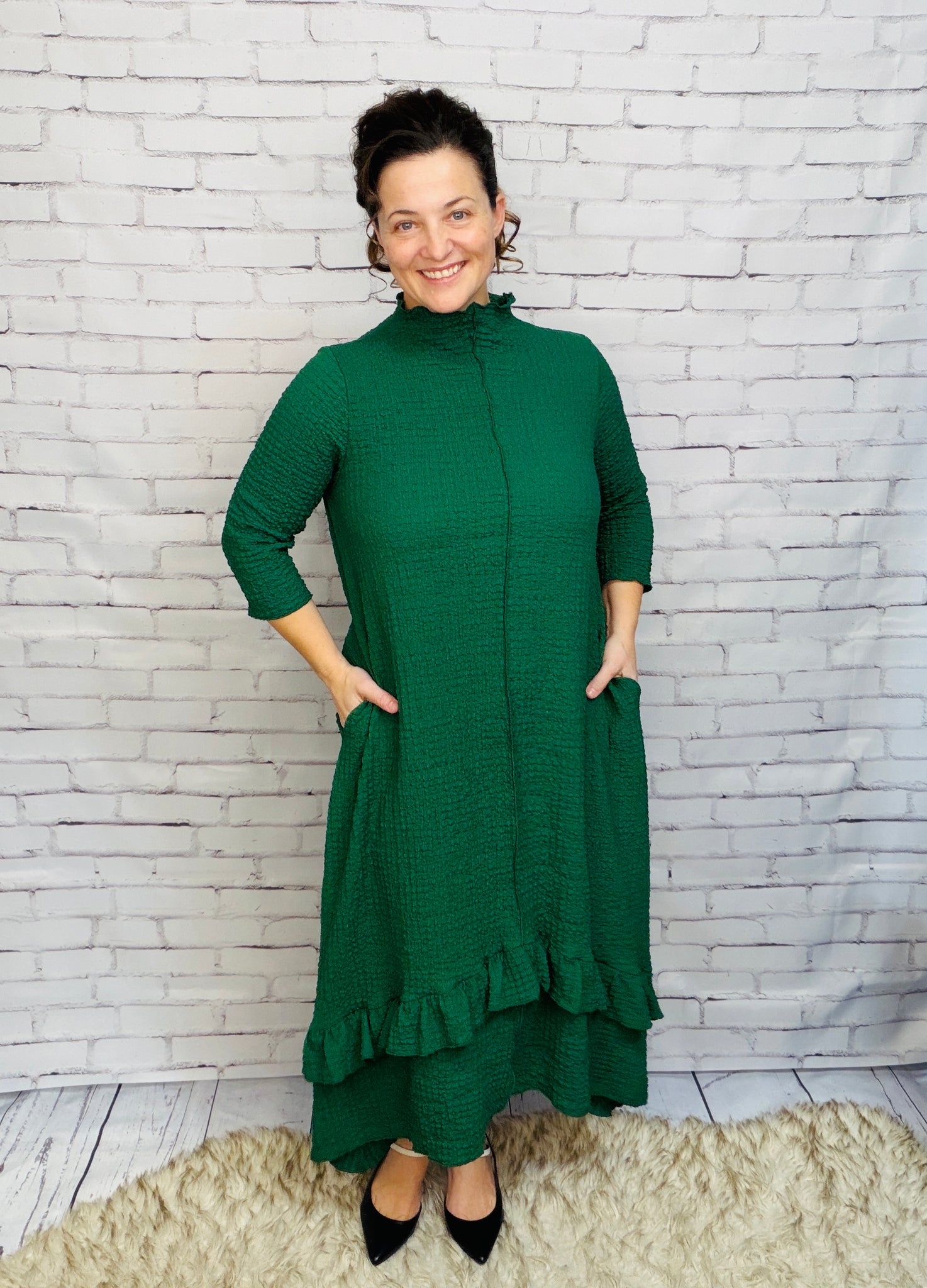 This dress is a MUST HAVE! Classy vintage style, with a lightweight textured material. This dress features 3/4 length sleeves, an outside front seam, and a crew neckline. Its asymmetrical hemline adds a playful touch. Perfect for all seasons, its anti-wrinkle fabric ensures you'll look effortlessly stylish.