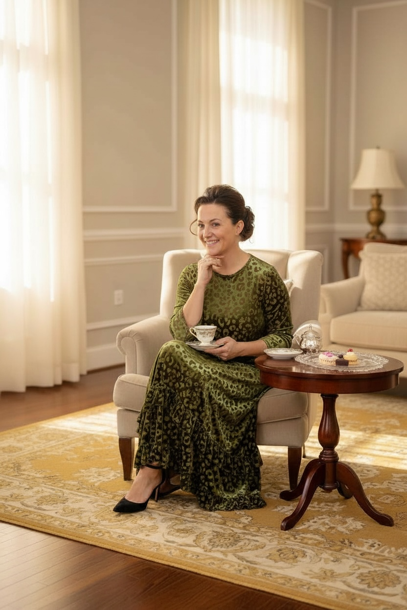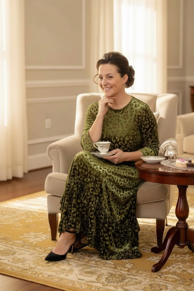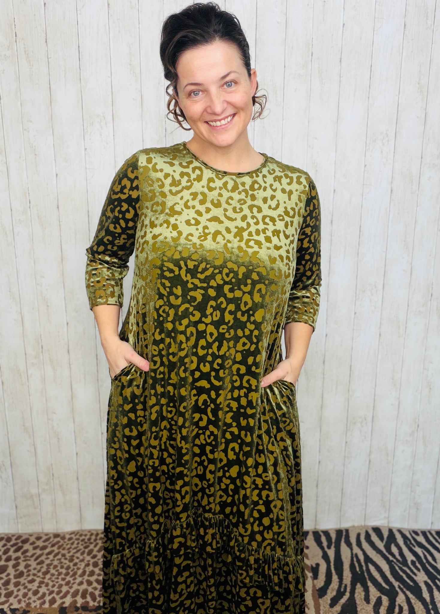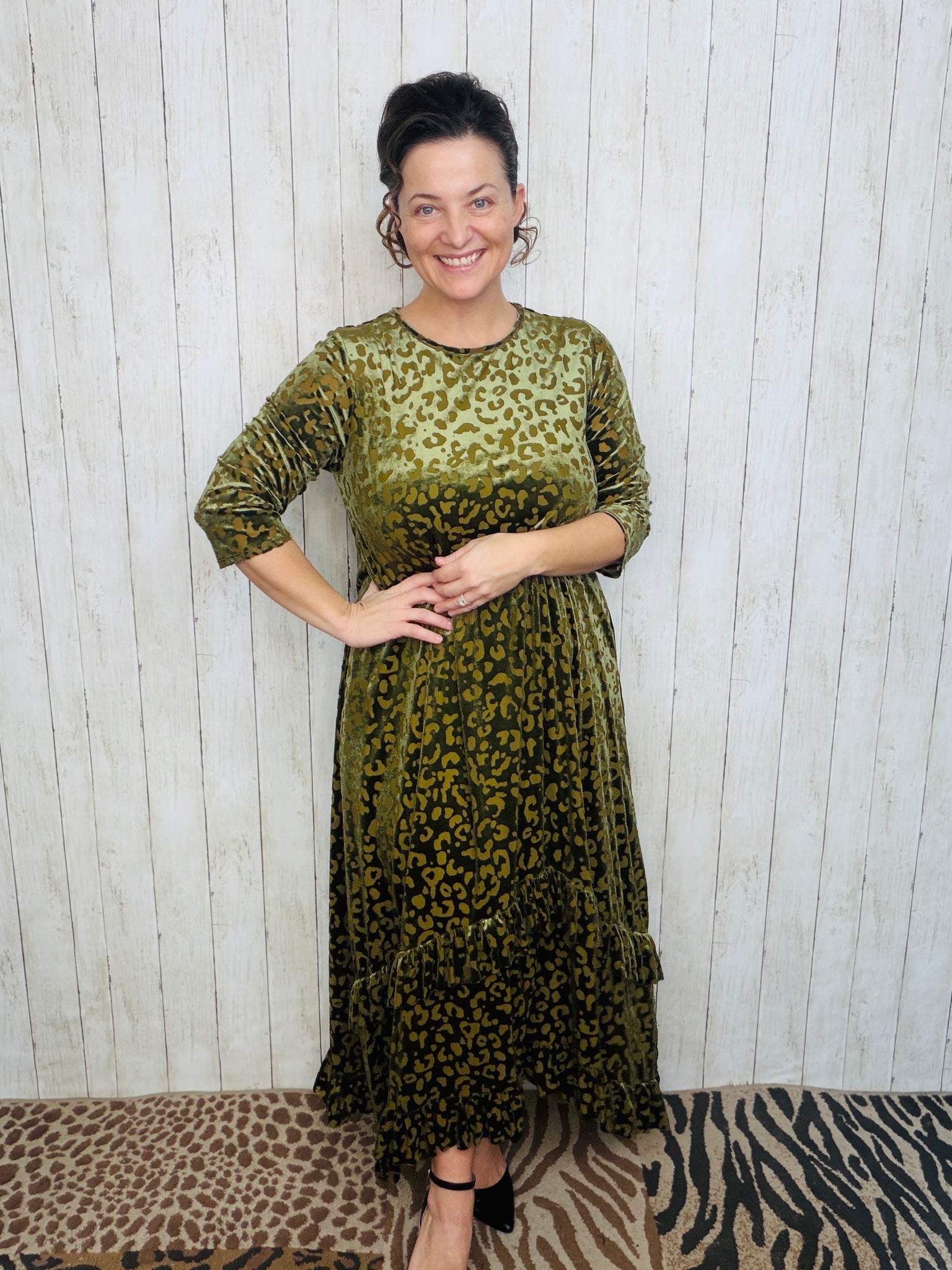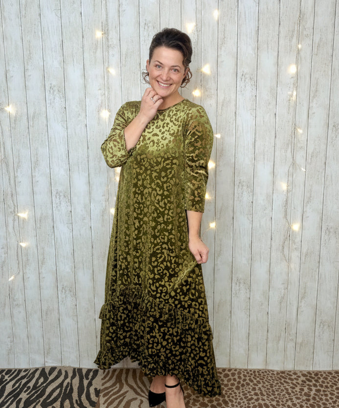 Kayla Ruffled Burnout Velvet Dress-Olive Leopard