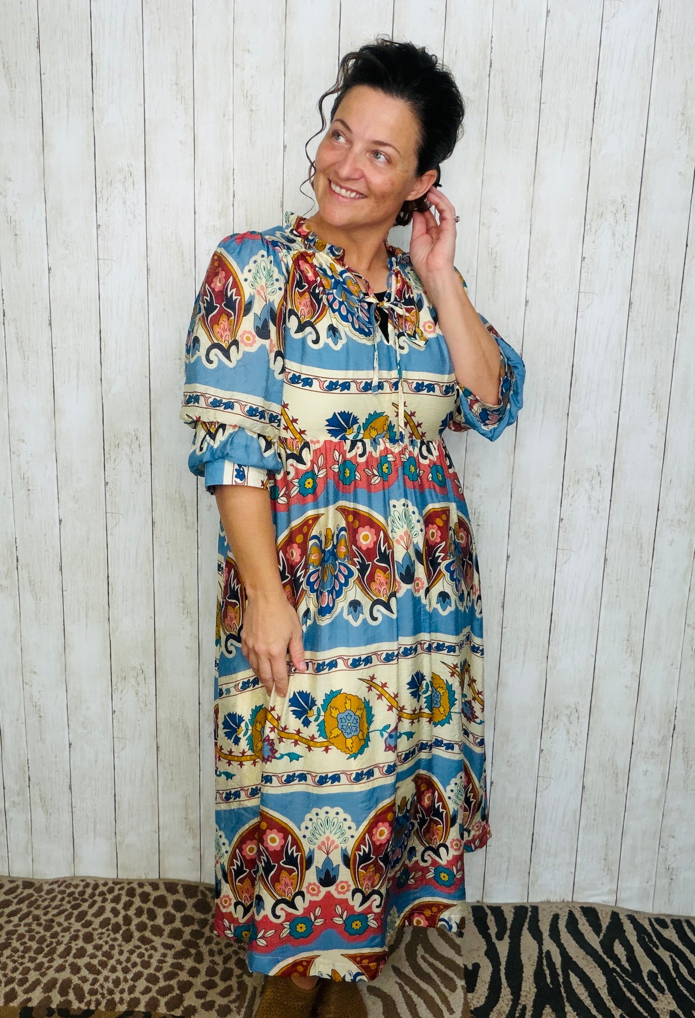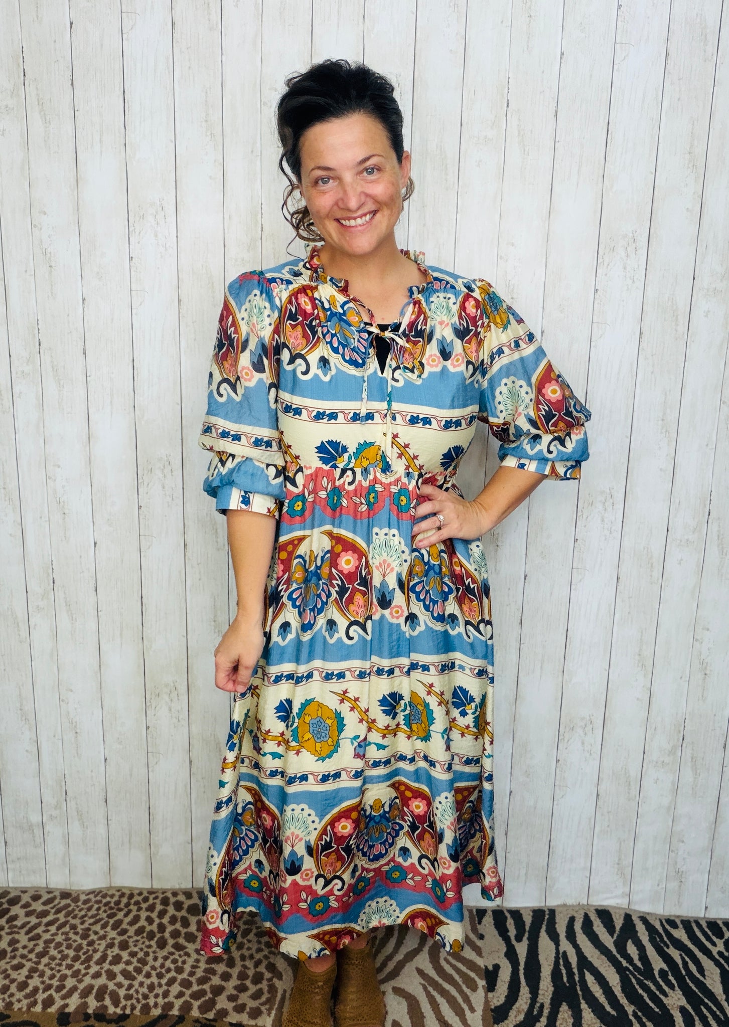 Adorable Border Print Midi Dress that is perfect for anyone wanting to look trendy yet classy, regardless of age!
