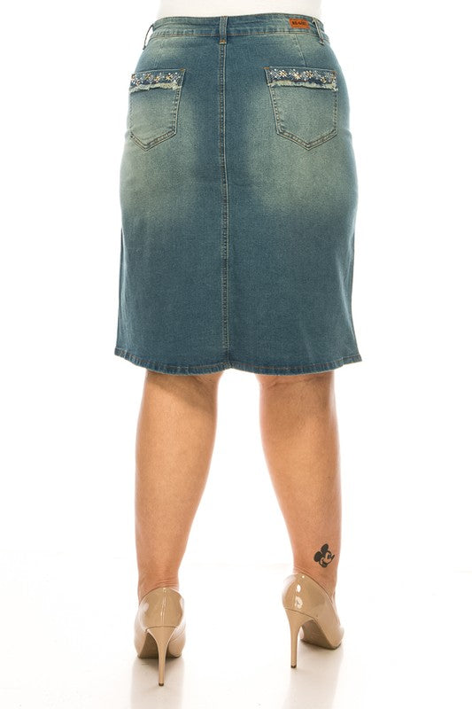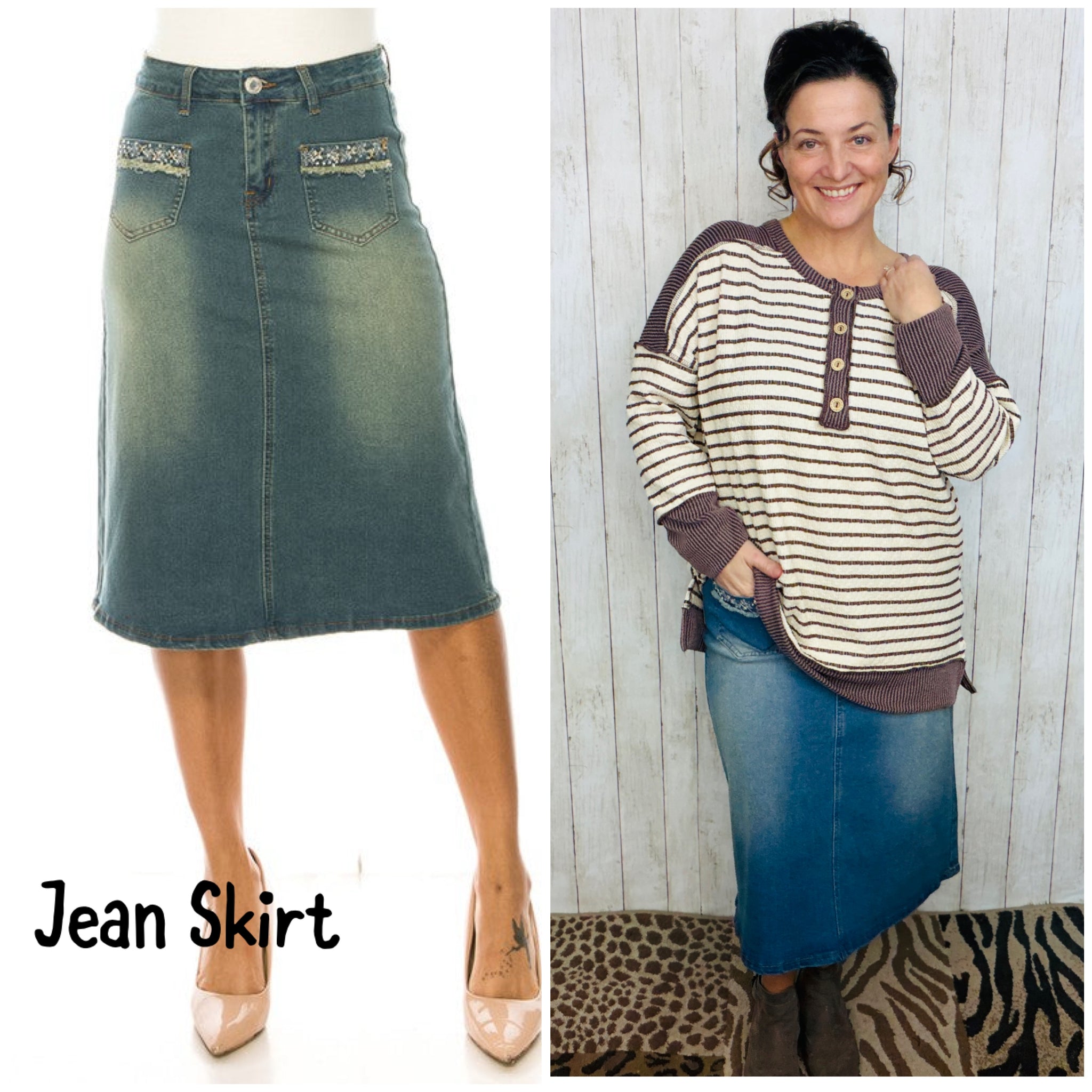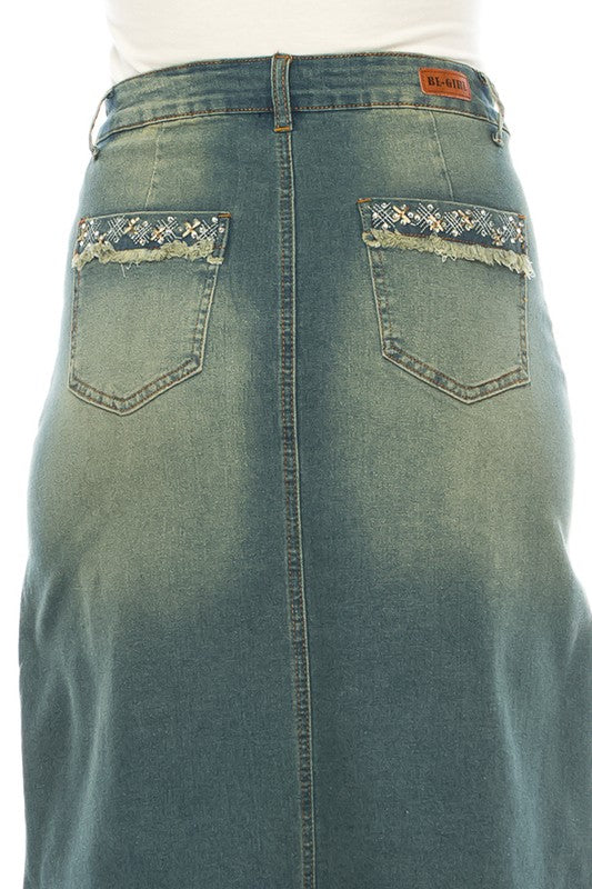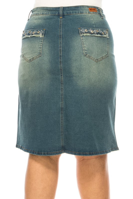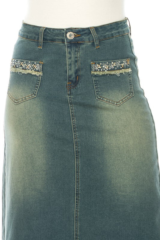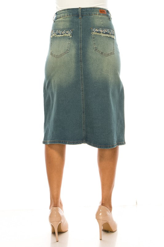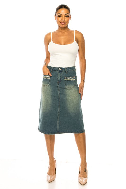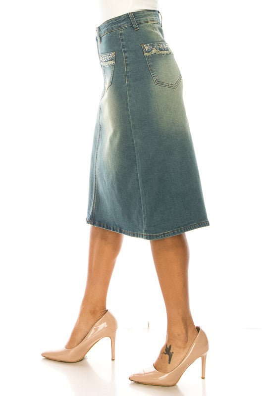 The Lenora Jean Skirt from Be-Girl combines timeless denim style with eye-catching details. This A-line silhouette flatters various body types while the mid-length cut offers versatile styling options for different occasions. Crafted with stretch fabric, it moves with you for all-day comfort without sacrificing structure. Rhinestone and embroidery accents on the pockets elevate the classic jean skirt, adding personality and visual interest. Perfect for layering with your favorite tops, this piece bridges casual and dressy aesthetics effortlessly.