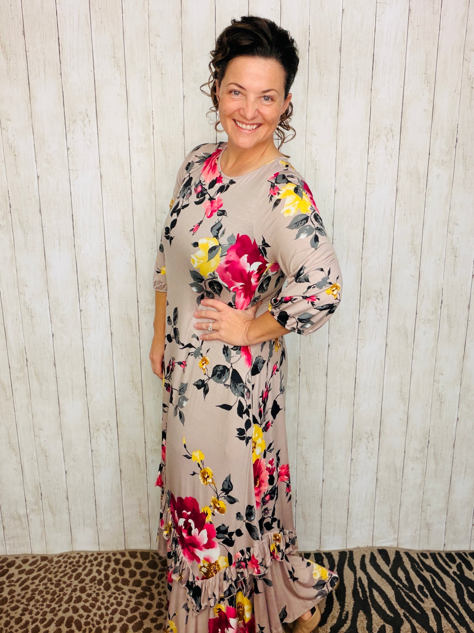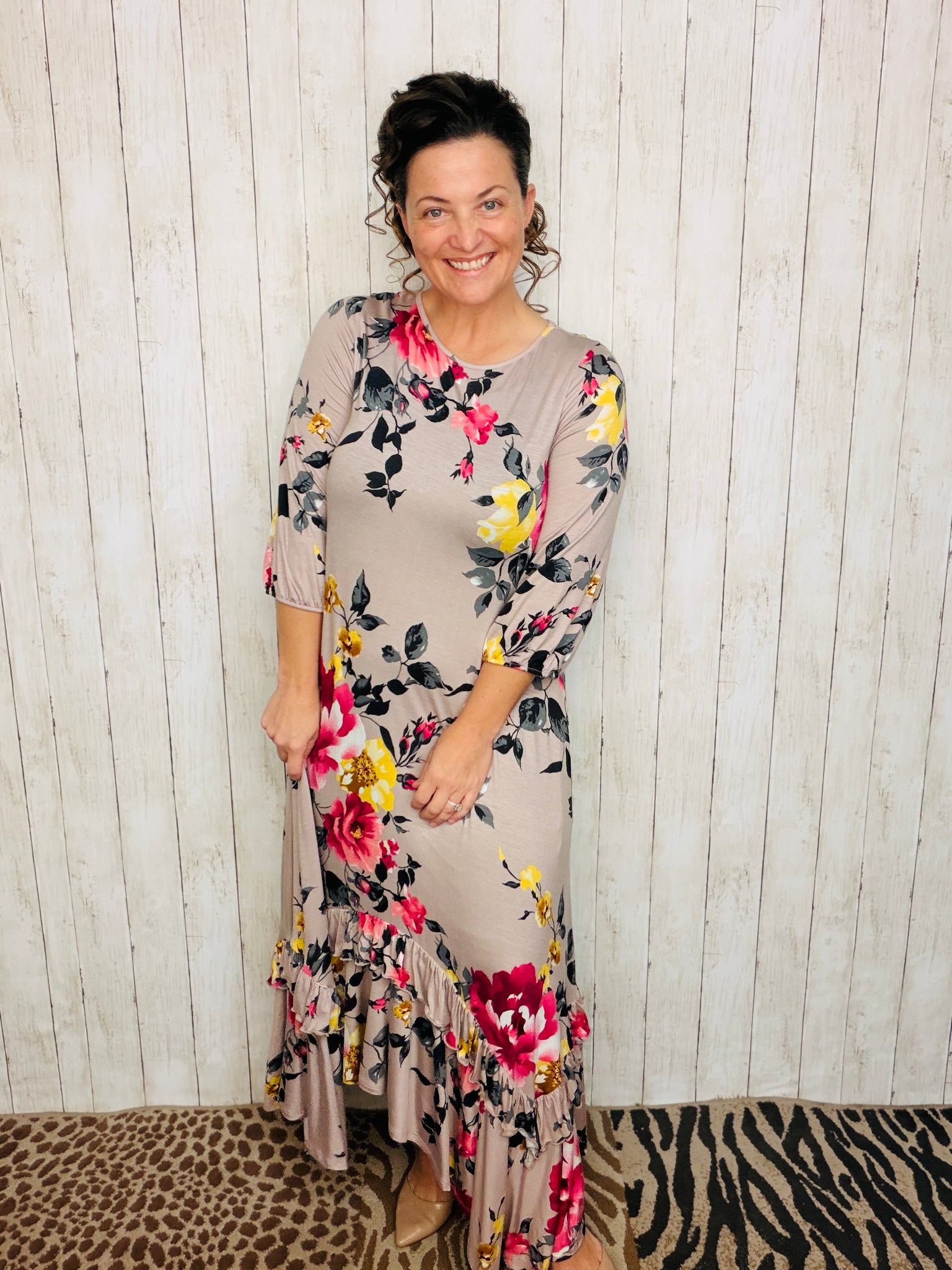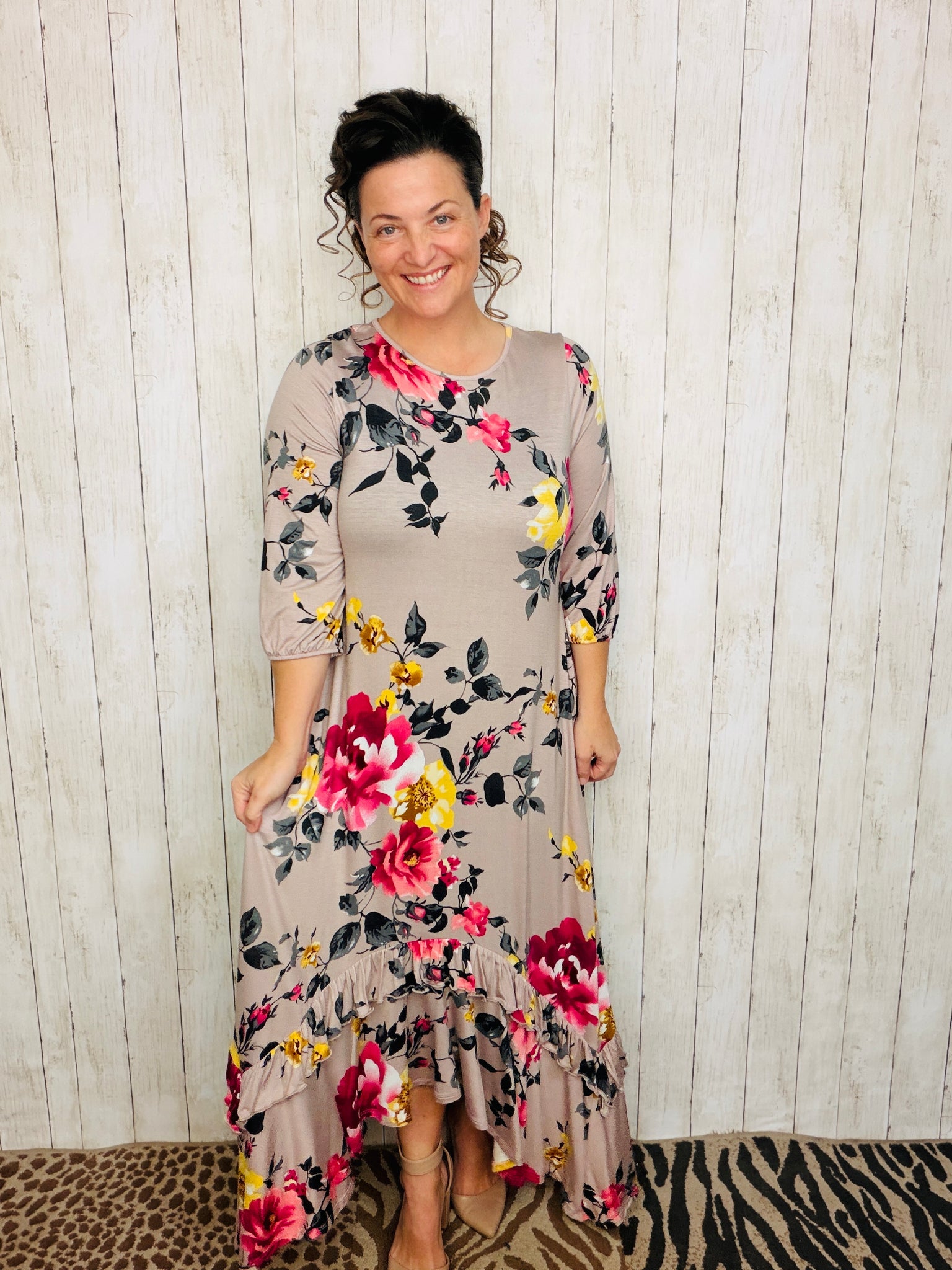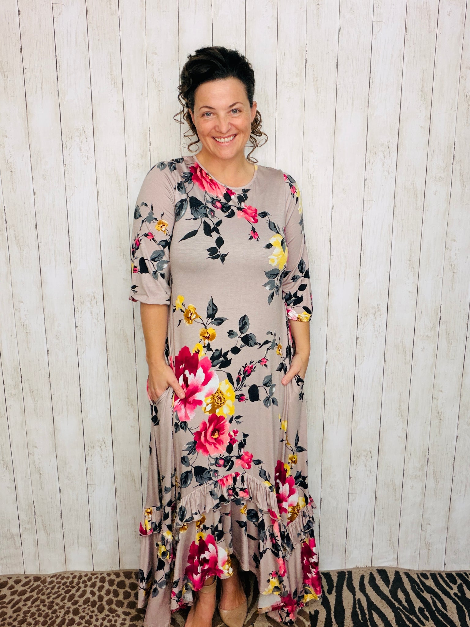 You will love the gorgeous styling of this dress. Round Neckline. Elbow-length sleeves. Side pockets.  It is gorgeous in style and made of medium weight, high quality material  Ruffles along the hemline. Higher in the front. Longer on the sides. Has pockets.