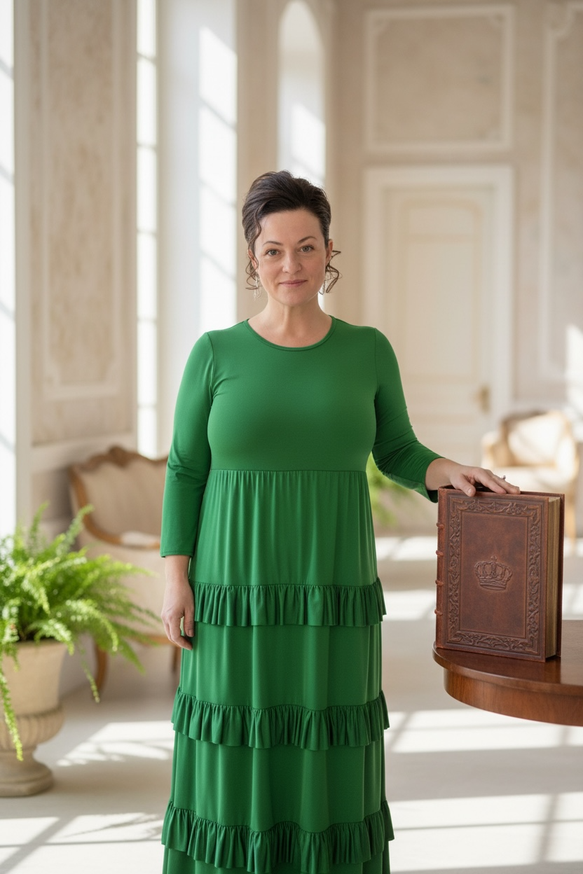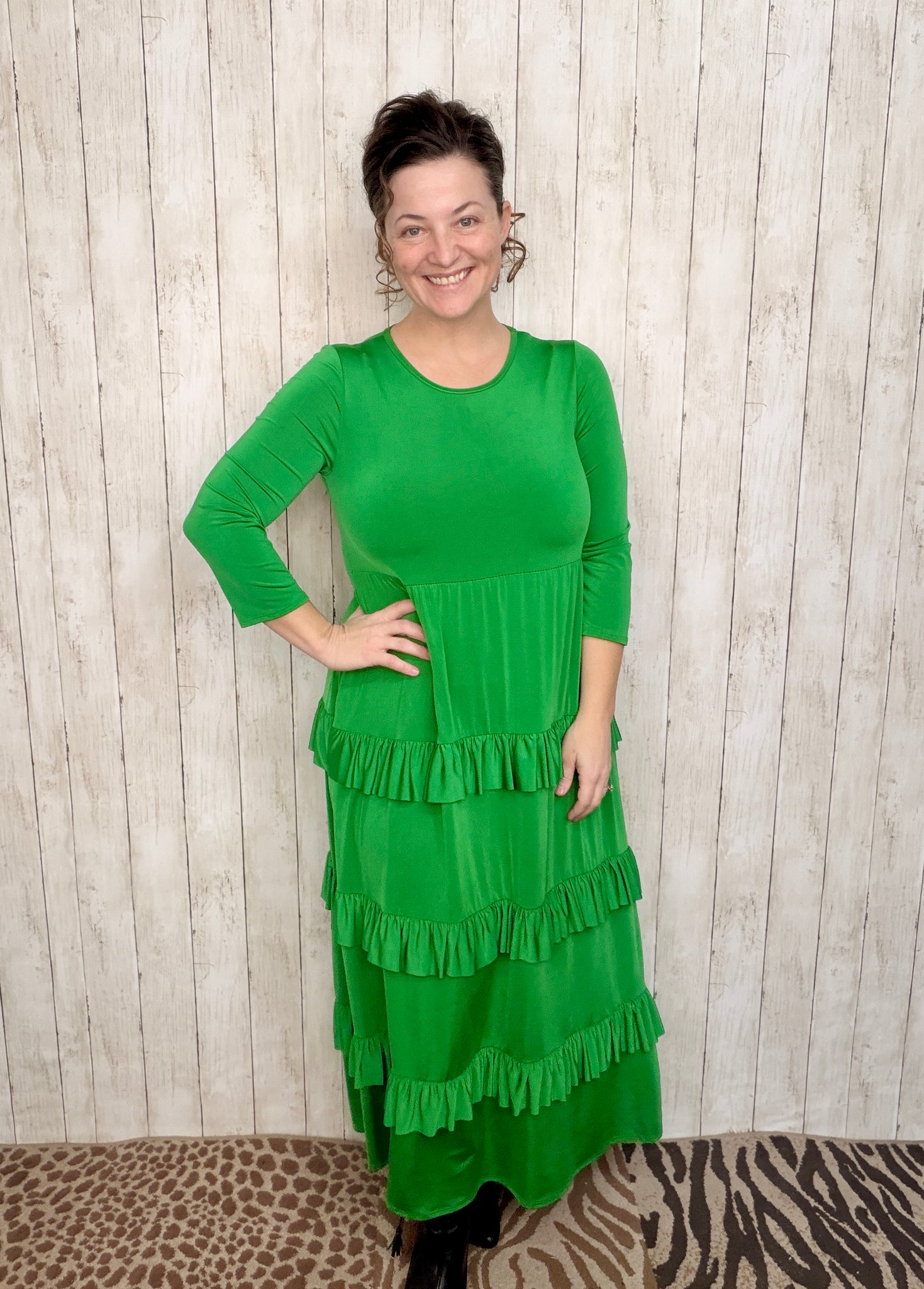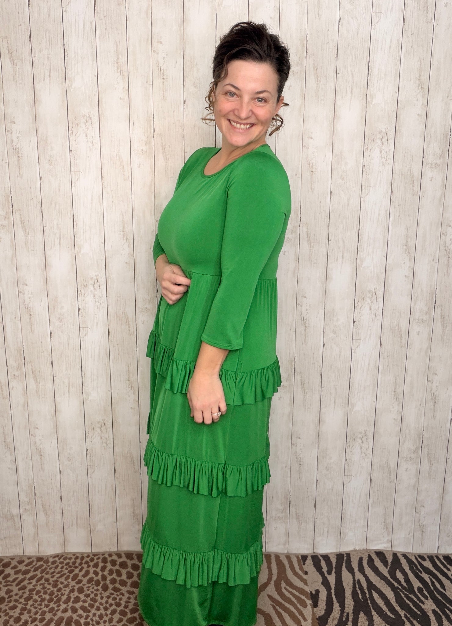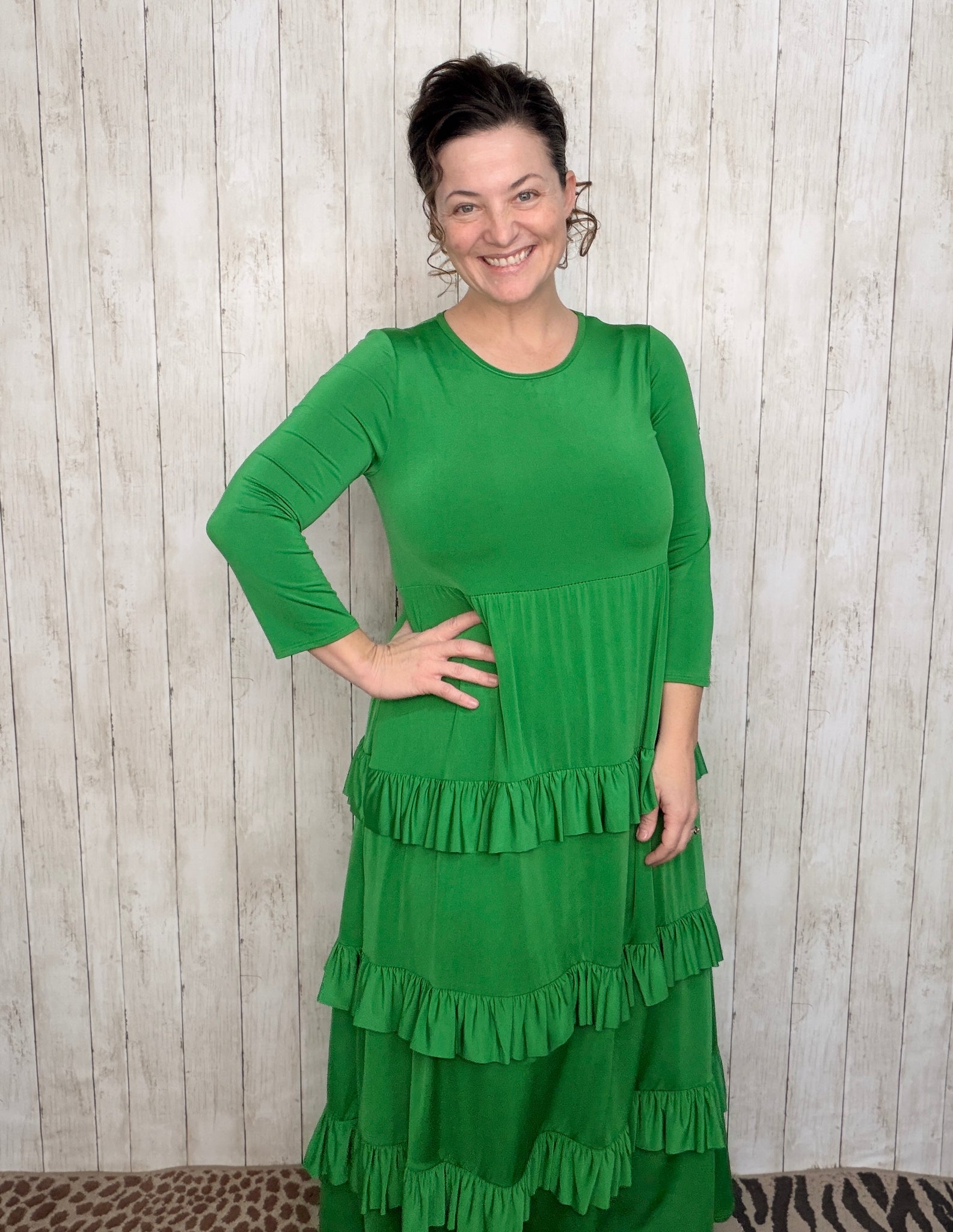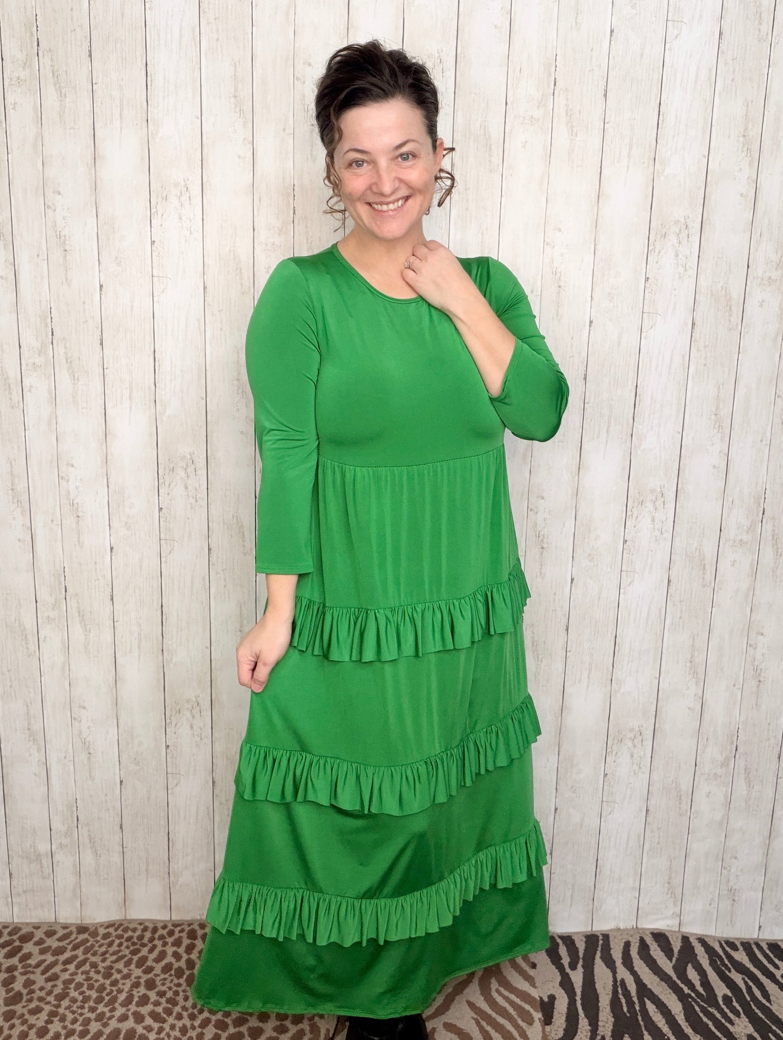 Elevate your everyday wardrobe with the Nora Ruffle Skirt Dress. This midi dress features cascading ruffle tiers along the skirt for graceful movement and visual interest, paired with comfortable 3/4 length sleeves perfect for layering or wearing solo. Practical side pockets add functionality without compromising style. Crafted from a breathable 95% polyester and 5% spandex blend, the fabric offers gentle stretch and easy care. A versatile piece that transitions seamlessly from casual outings to polished occasions.