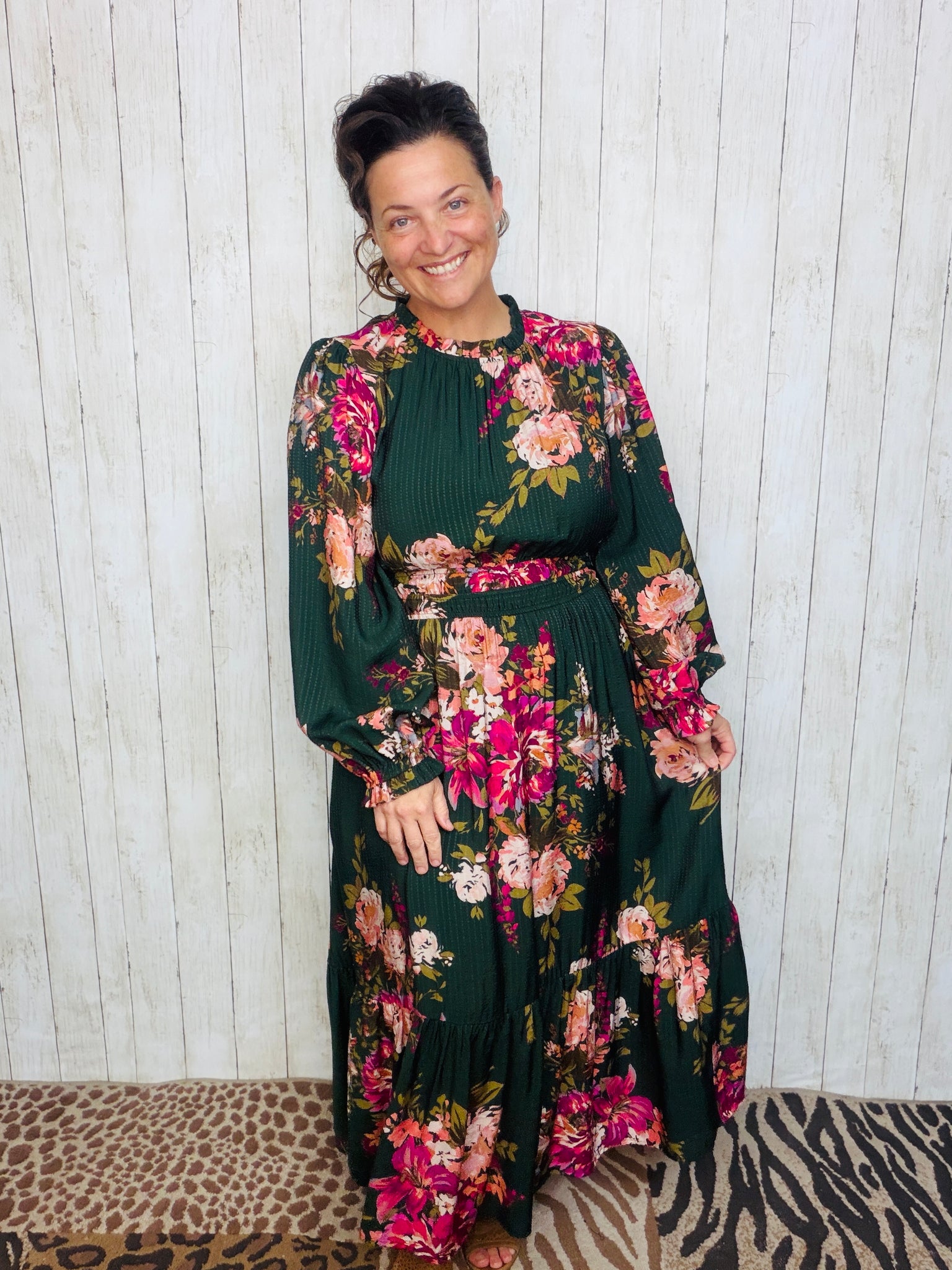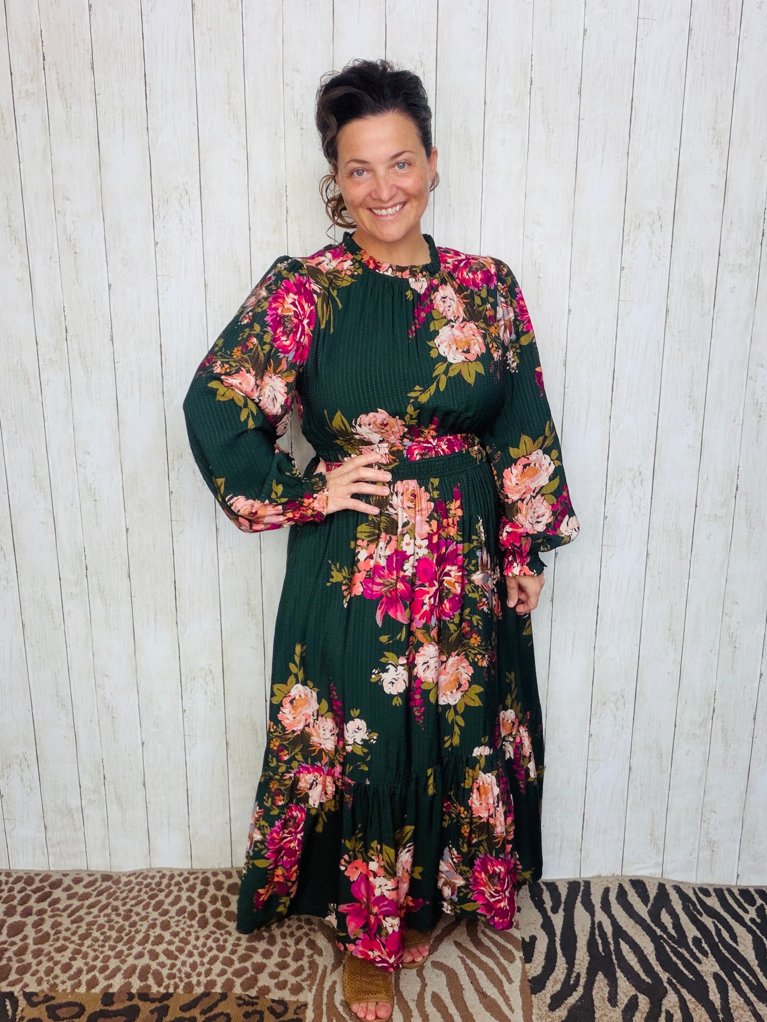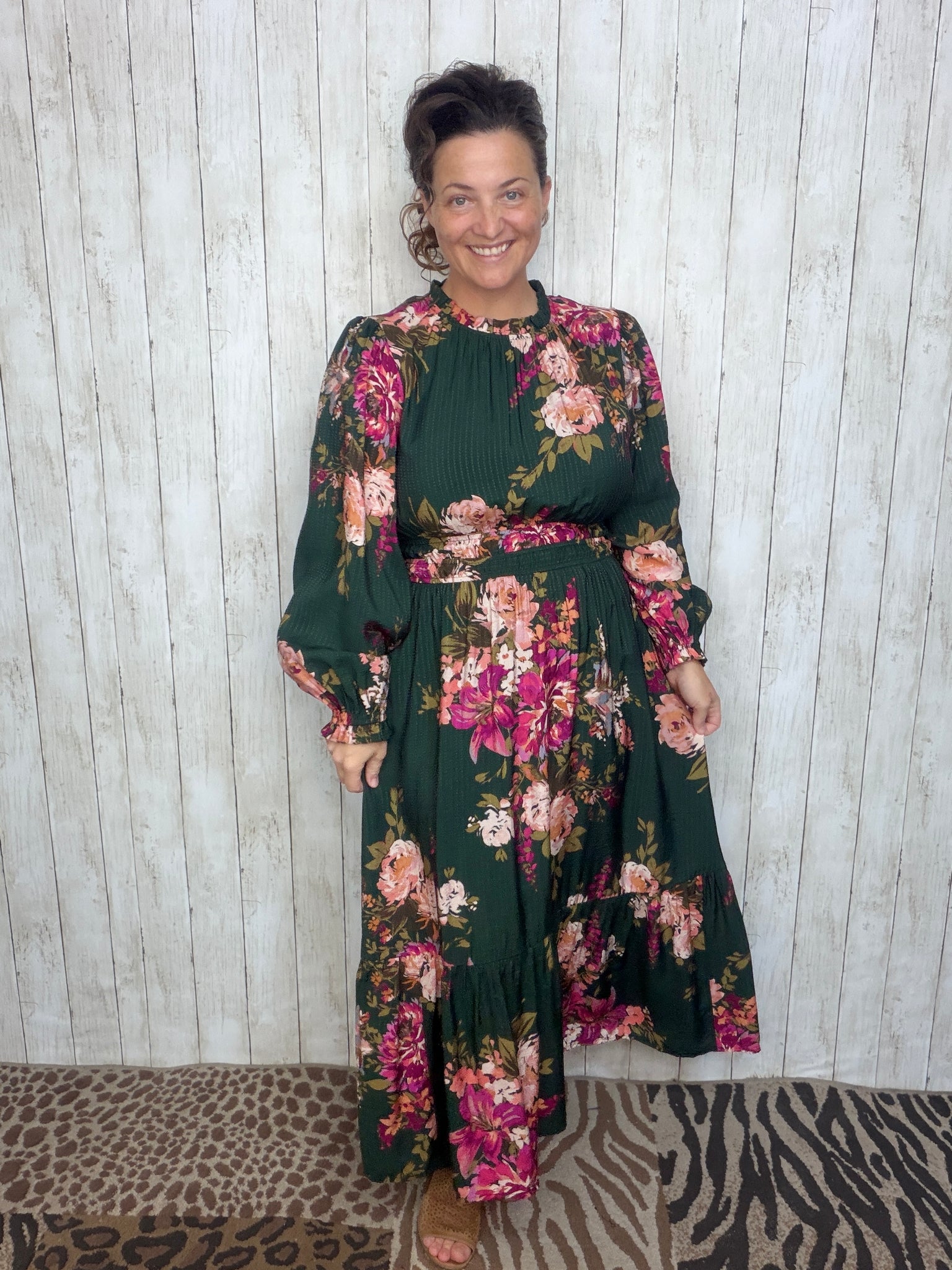This dress is STUNNING! Refined silhouette with its delicate notch neckline and long bubble sleeves. Crafted from 100% rayon, the dress features a tiered midi-length design that moves gracefully with every step. The smocked waist adds a flattering fit, combining comfort with elegance for a timeless, sophisticated look.