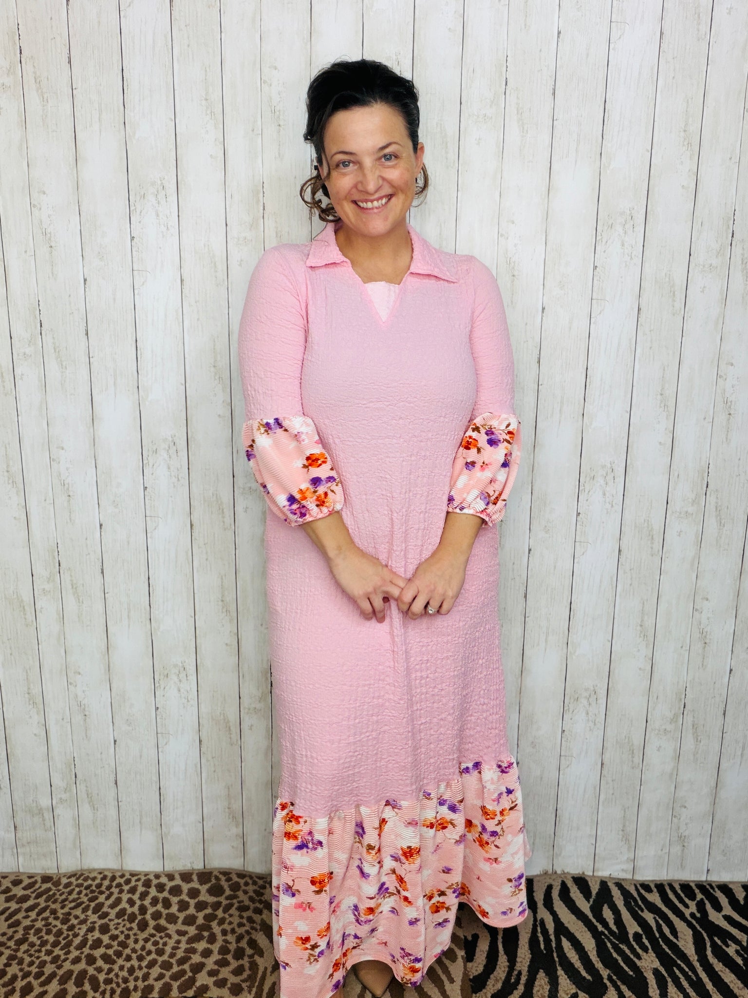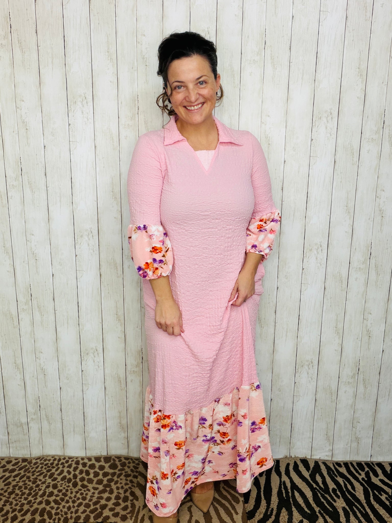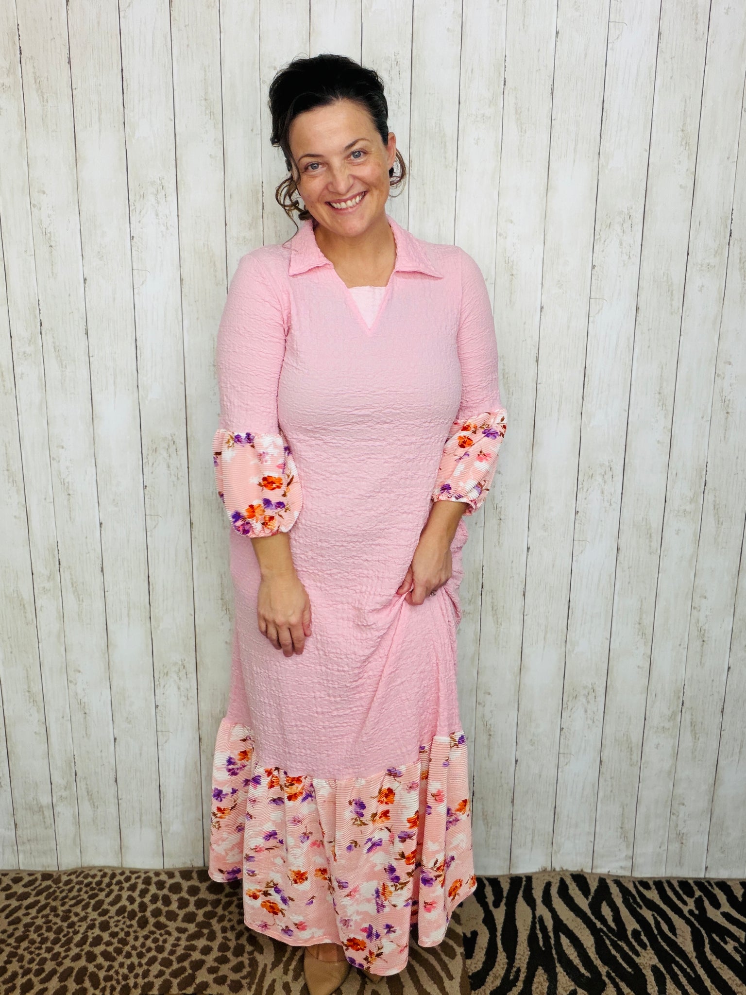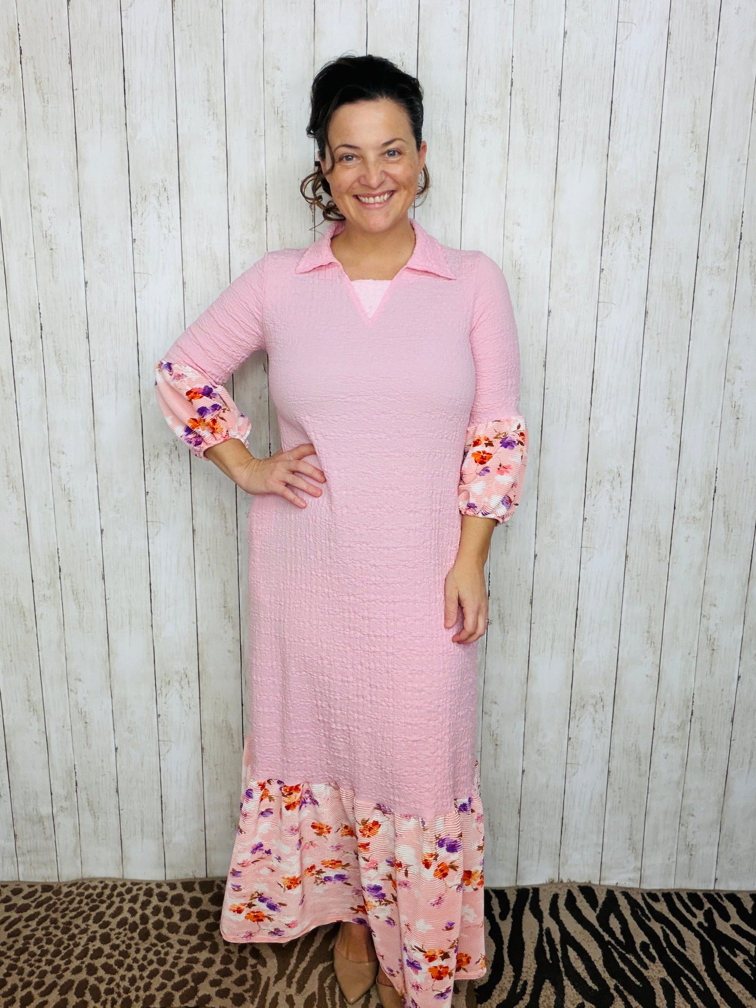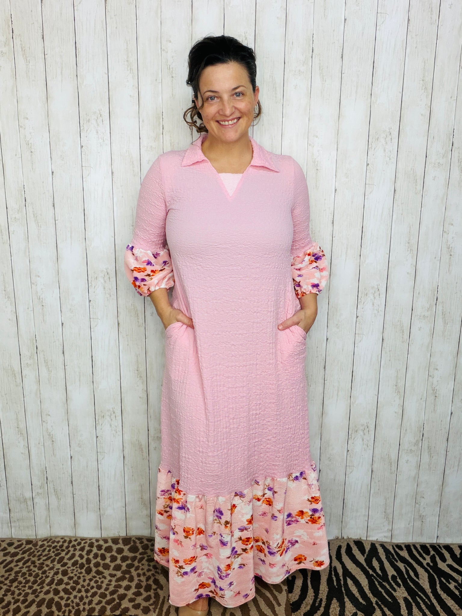 Absolutely adorable dress! Textured pink material with accenting pink puff sleeves and hem. Soft & stretchy and comfortable polyester and spandex material is anti-wrinkle and has excellent coverage. Has pockets. 3/4 length sleeves.