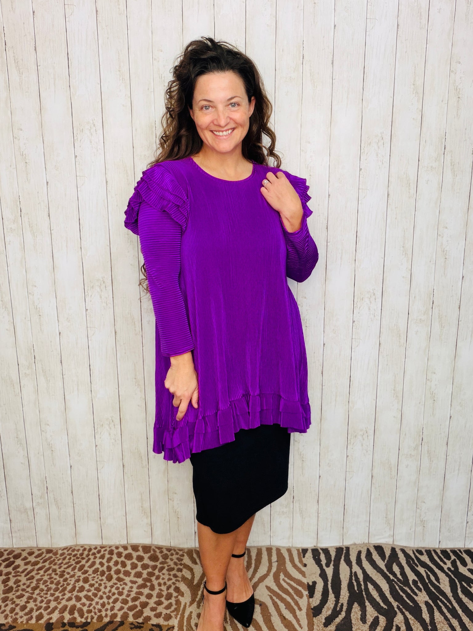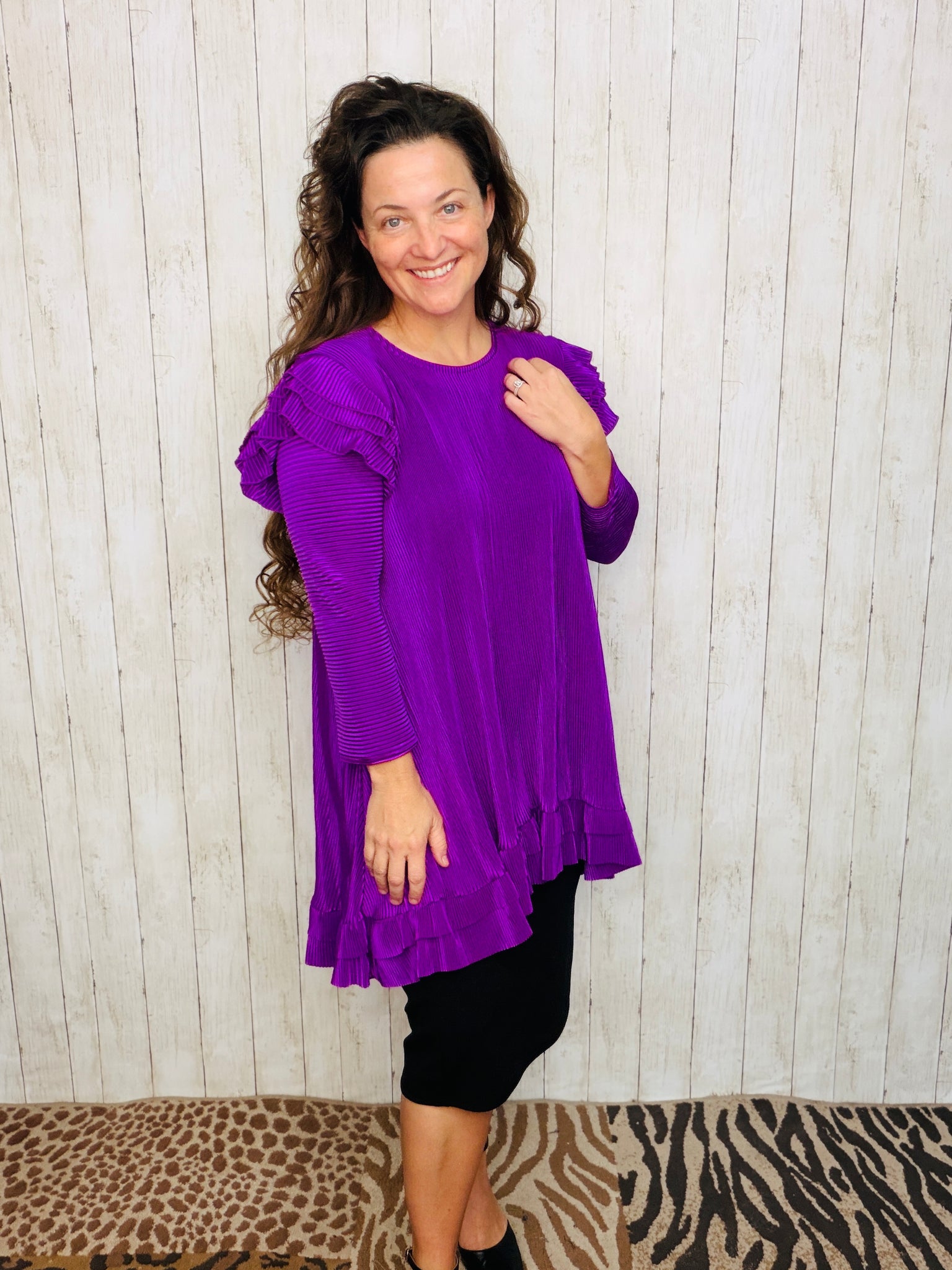 Gorgeous purple colored bodre tunic. Ruffles along the shoulders. 3/4 length sleeves. Stretchy and gorgeous sheen anti-wrinkle finish and stretchy polyester fabric for a comfortable fit. Double ruffles along the hemline.This unique tunic is wash and wear and looks fantastic when paired with pencil skirts, making it a great choice for any wardrobe.