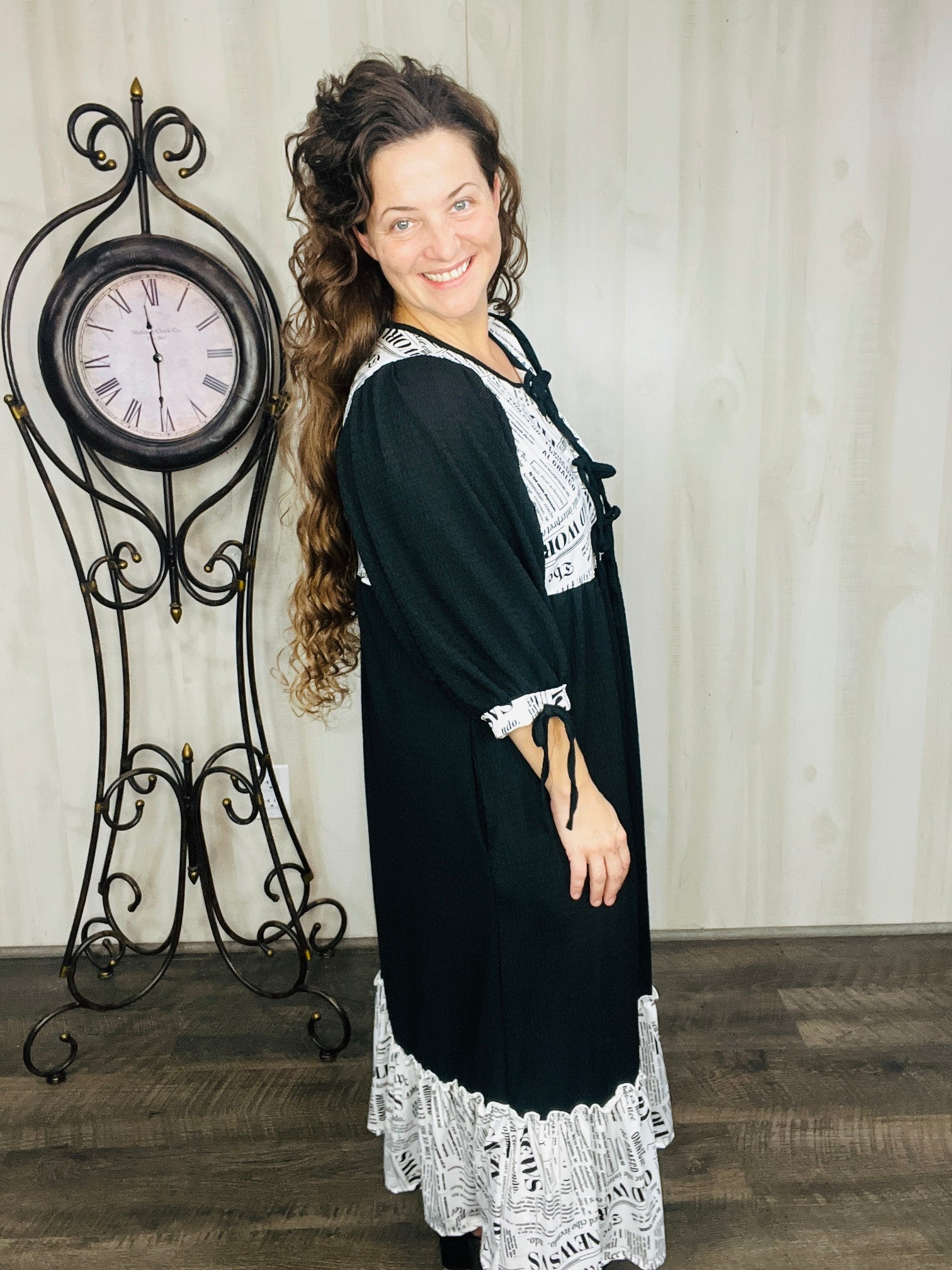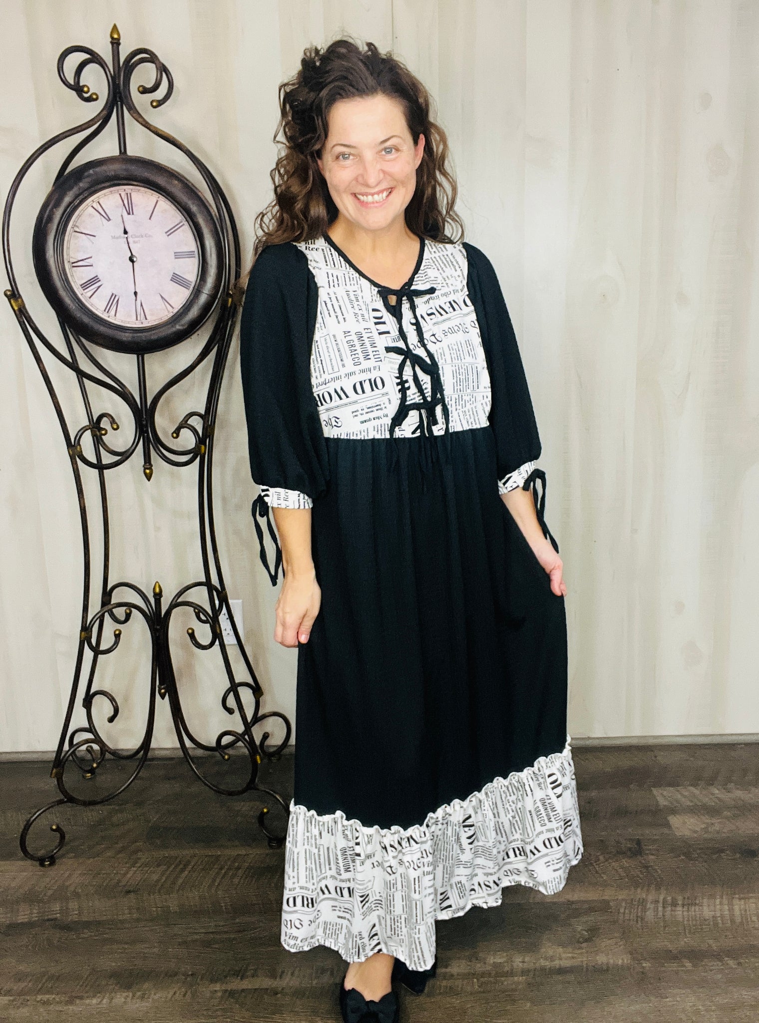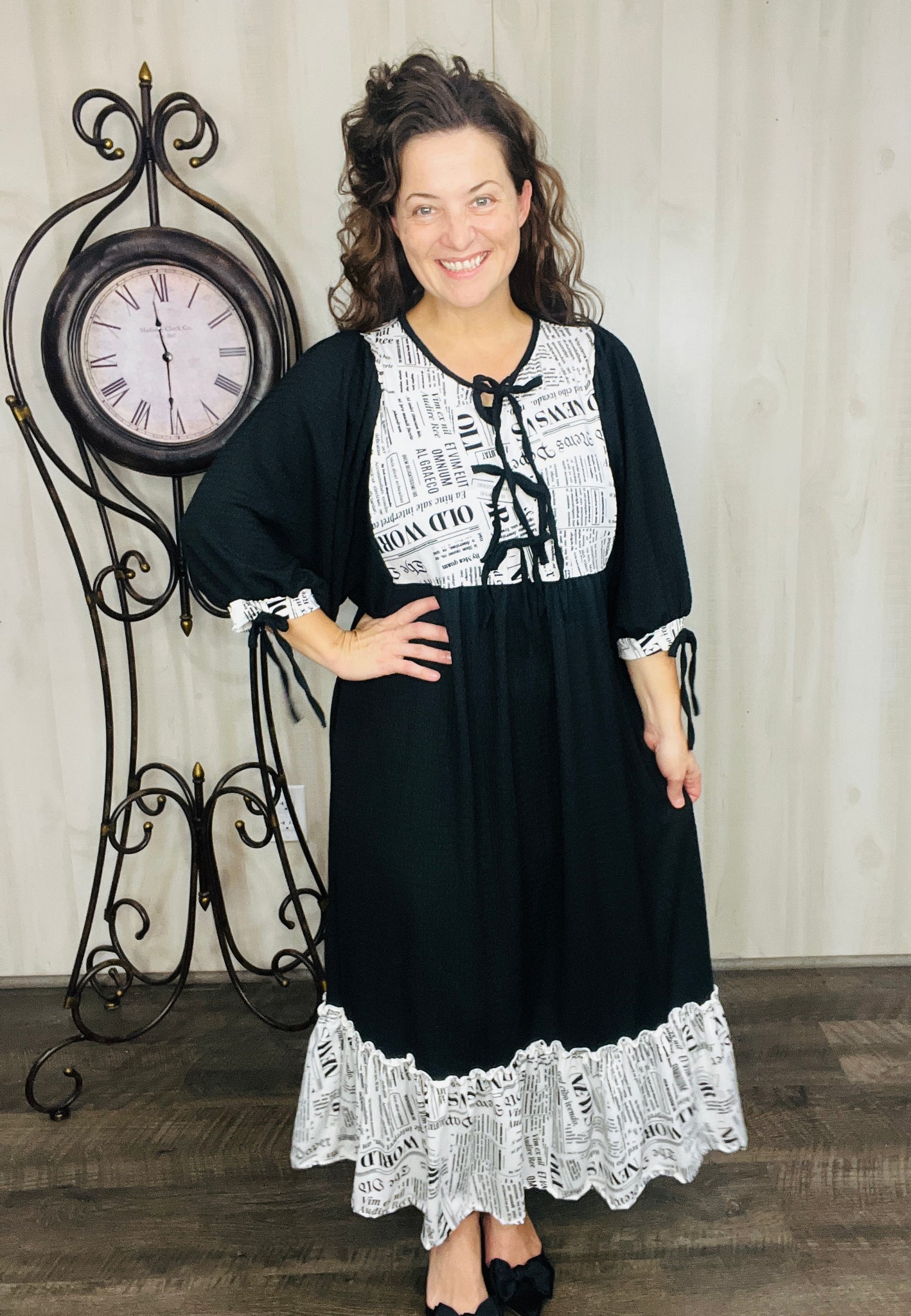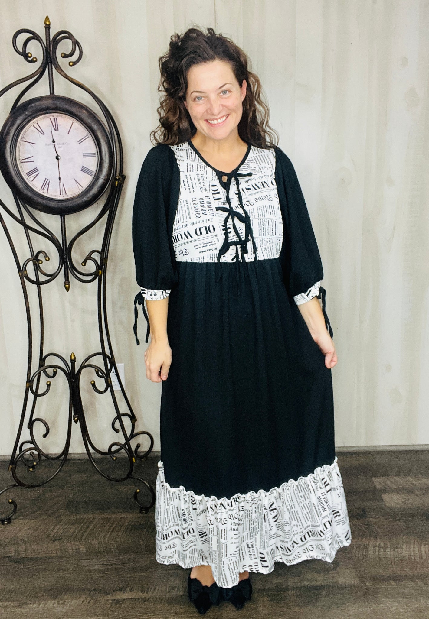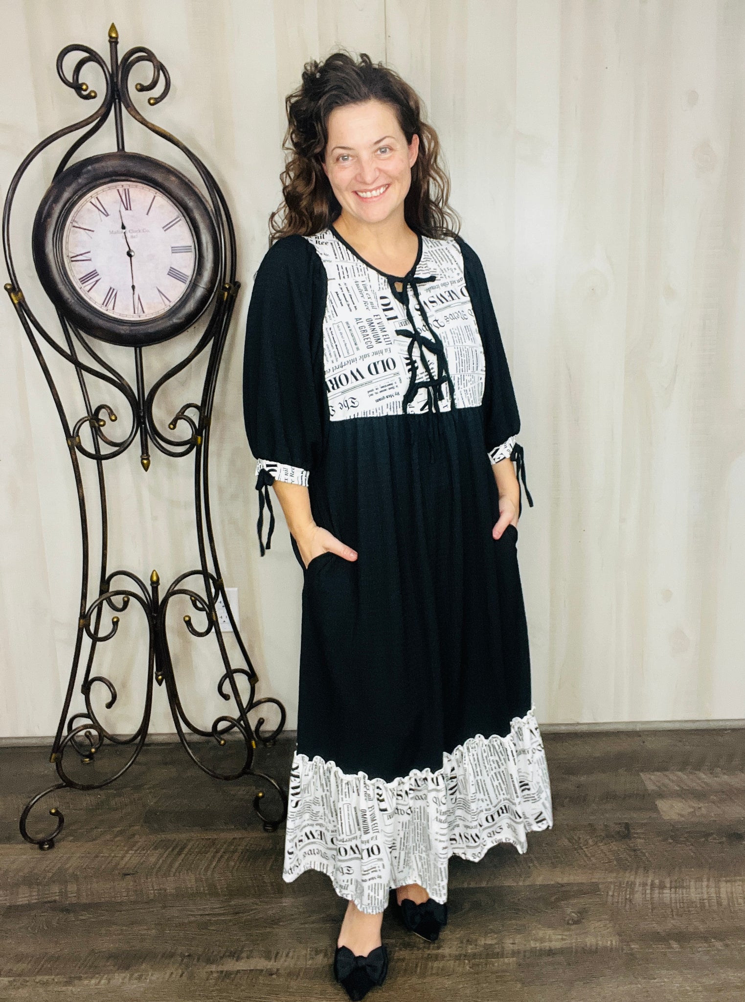 The Sabrina Happy News Dress combines elegance with practicality through its 3/4 puff sleeves, with small bows on sleeves, functional side pockets, and a soft neckline tie detail. Crafted from a stretchy & soft polyester and spandex blend, its lightweight, flowing fabric ensures comfort and ease. Ideal for brunches, vacations, or everyday modest wear, this dress offers a stylish yet versatile option for any occasion.