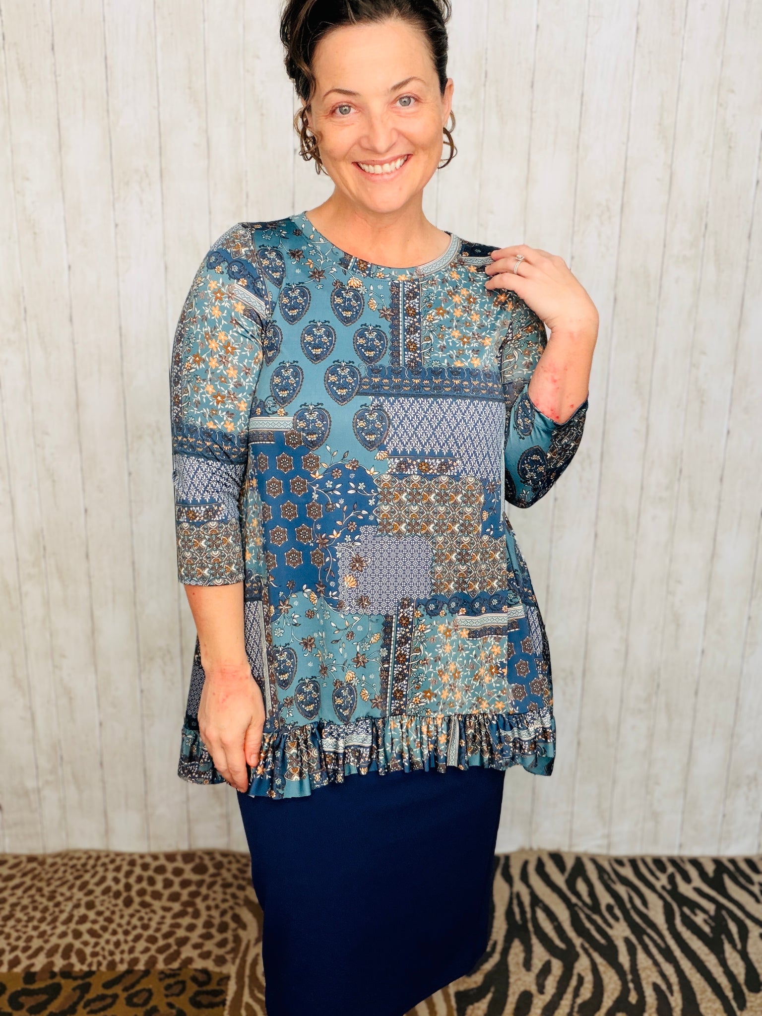 Samantha Ruffle High-Low Tunic offers style and practicality, with a beautiful floral anti-wrinkle finish and stretchy polyester and spandex blend fabric for a comfortable fit. This unique tunic is wash and wear and looks fantastic when paired with pencil skirts, making it a great choice for any wardrobe.