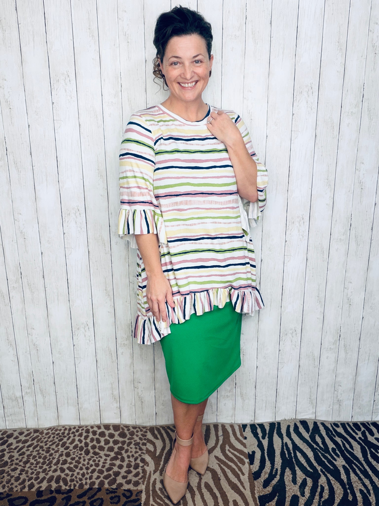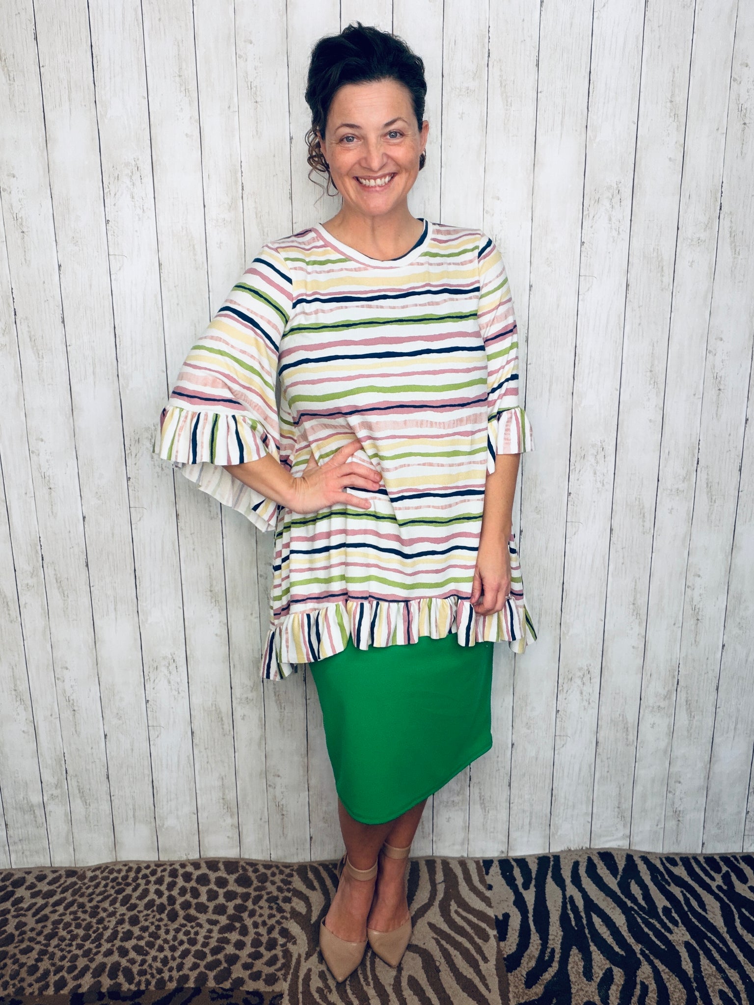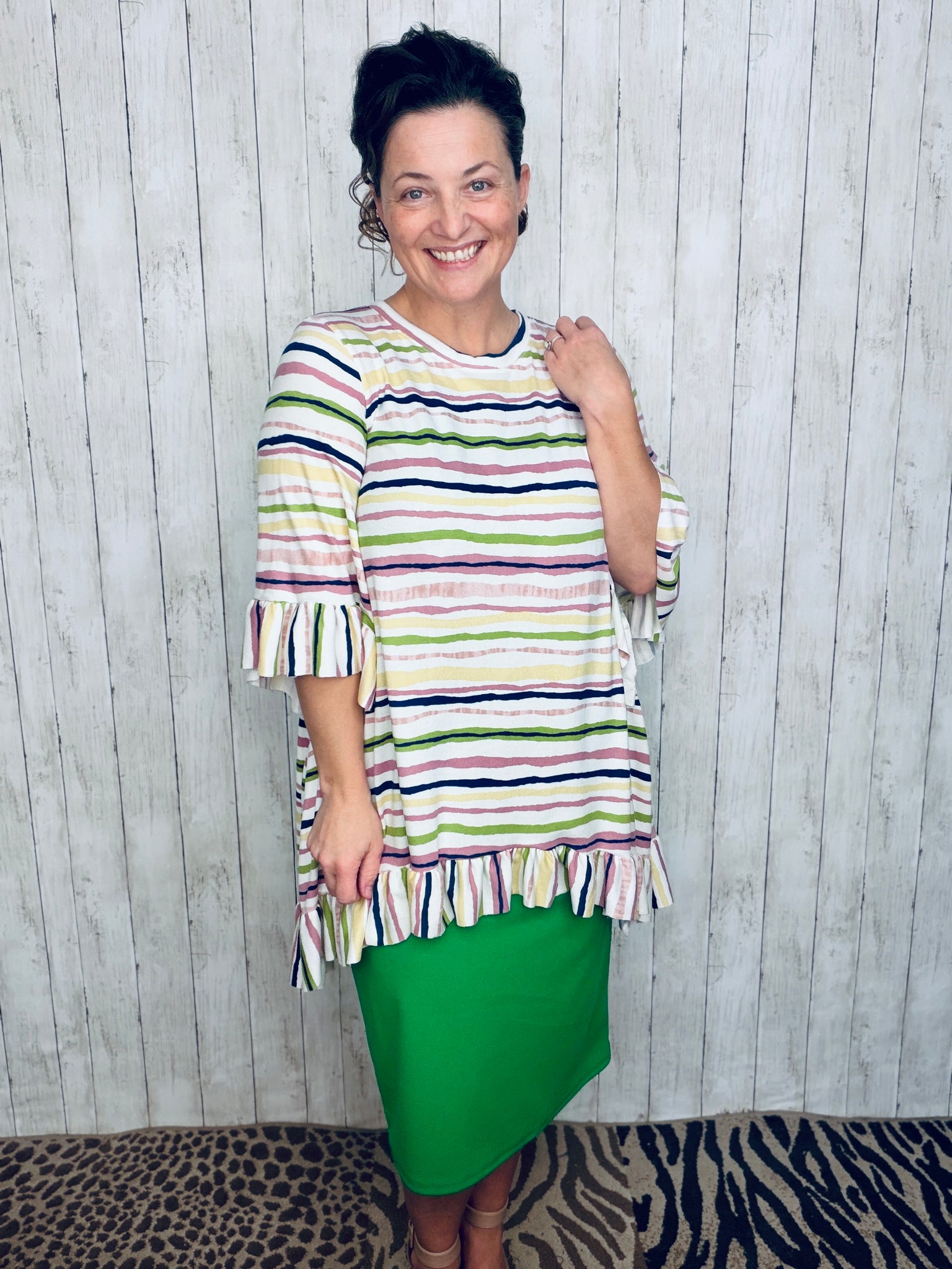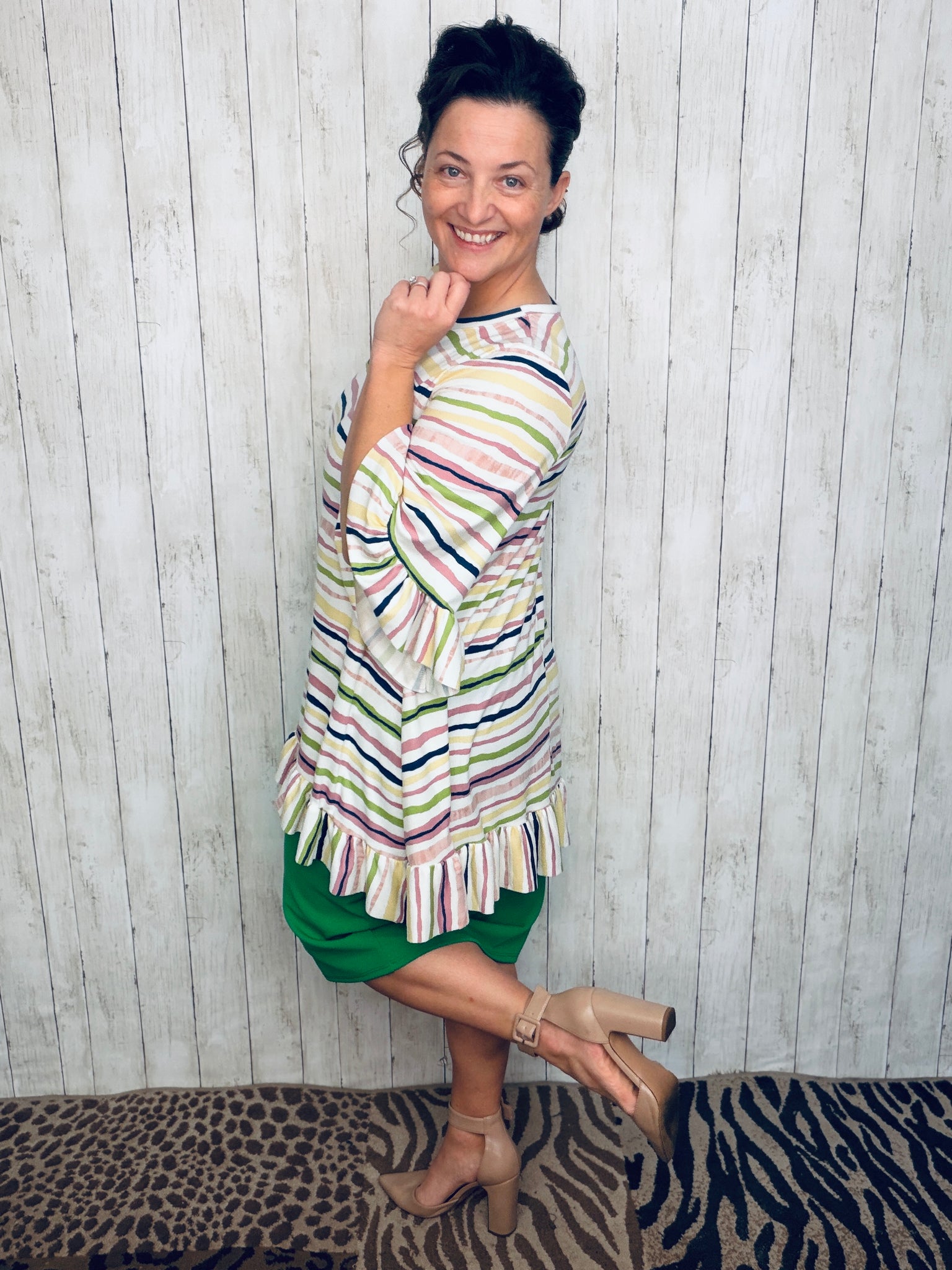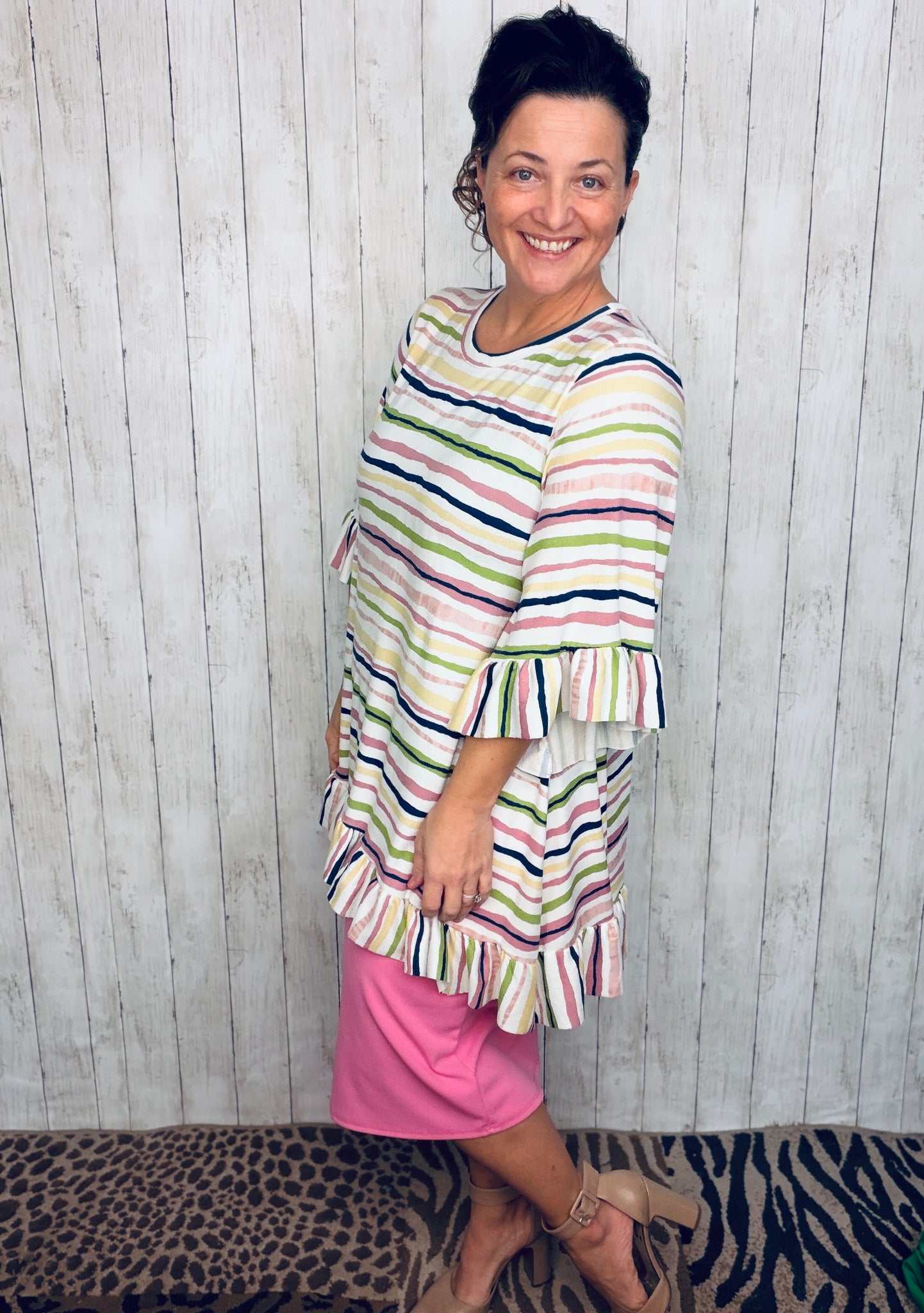 Samantha Ruffle Sleeve & High Low Tunic-Ivory Stripe