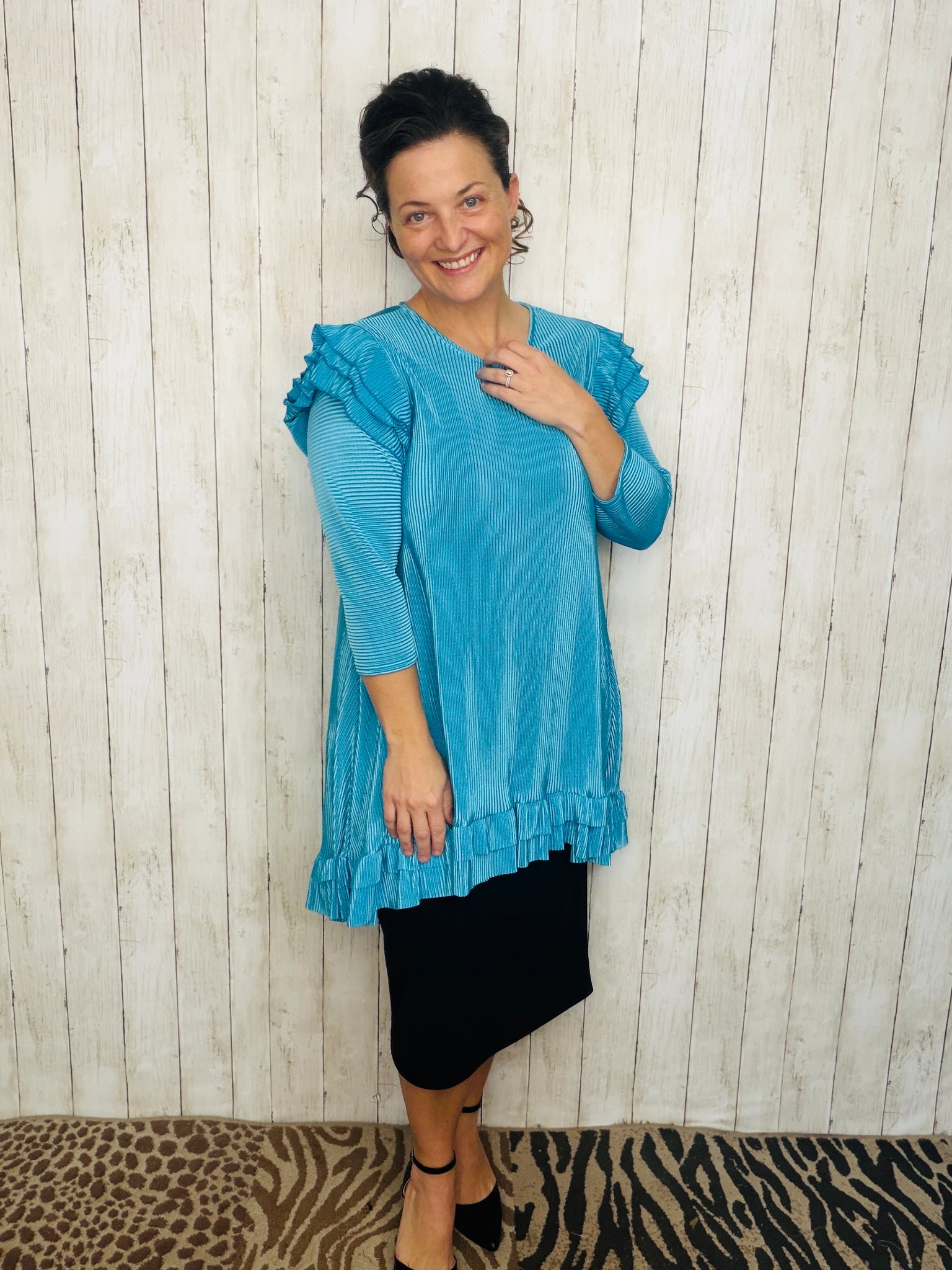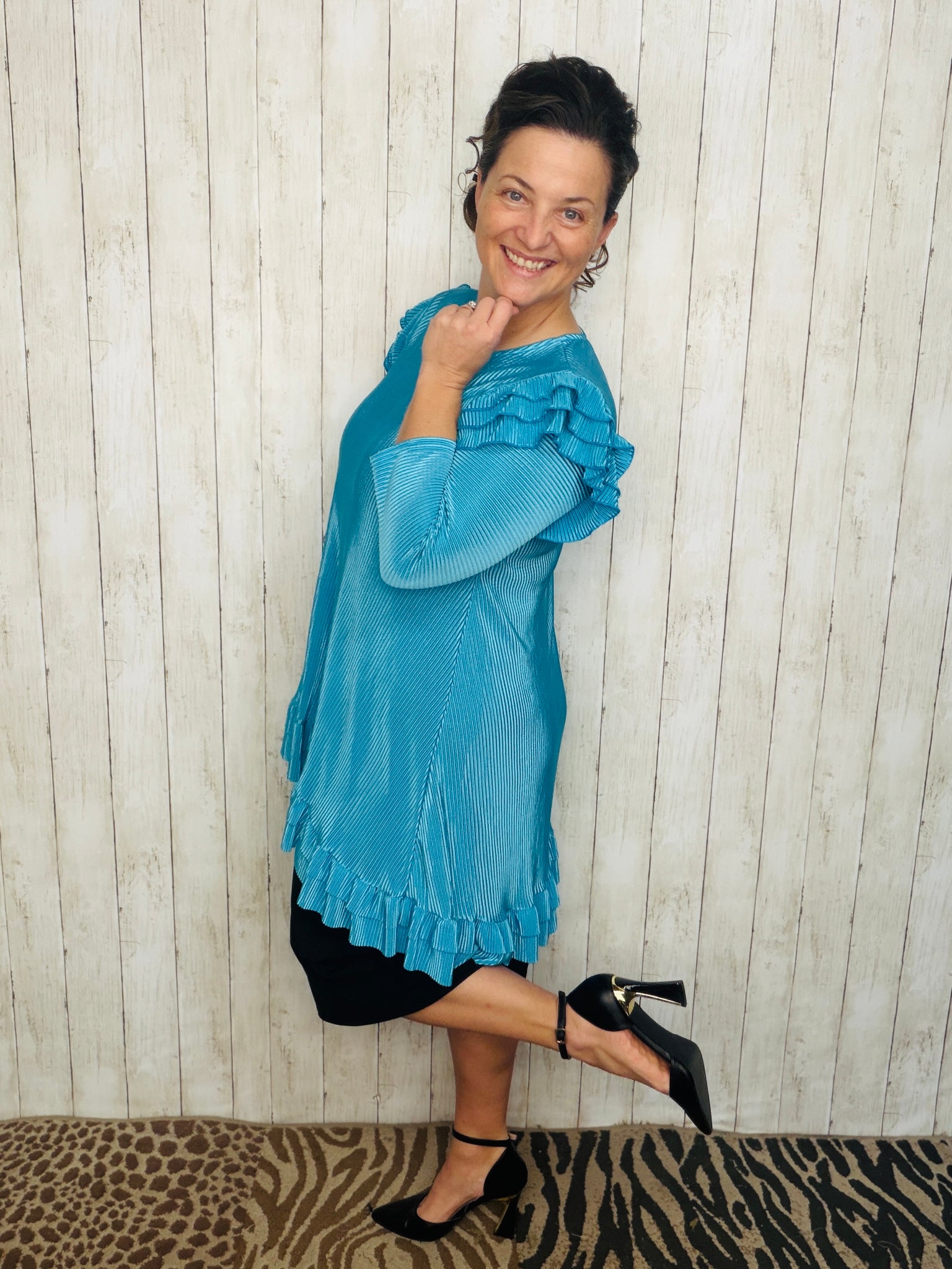 Gorgeous purple colored bodre tunic. Ruffles along the shoulders. 3/4 length sleeves. Stretchy and gorgeous sheen anti-wrinkle finish and stretchy polyester fabric for a comfortable fit. Double ruffles along the hemline.This unique tunic is wash and wear and looks fantastic when paired with pencil skirts, making it a great choice for any wardrobe.