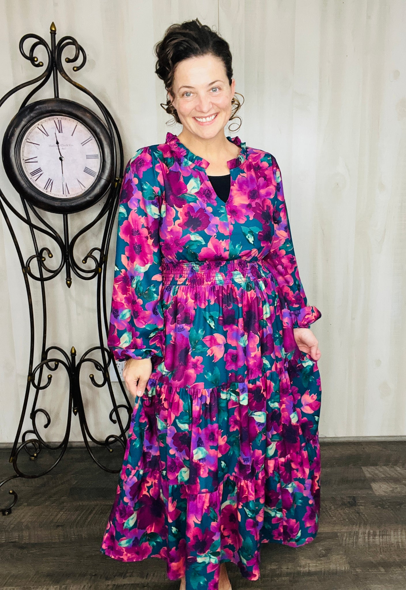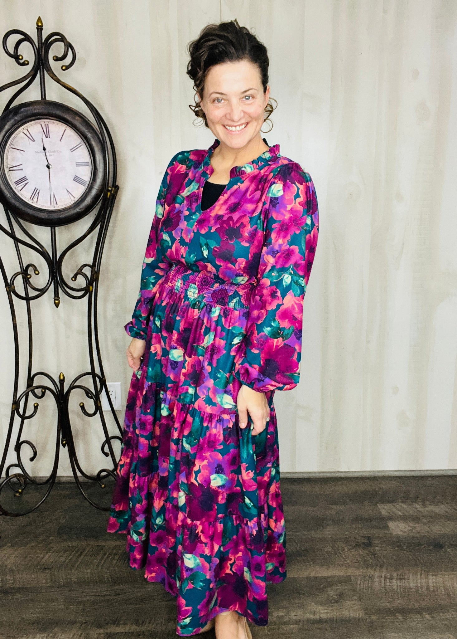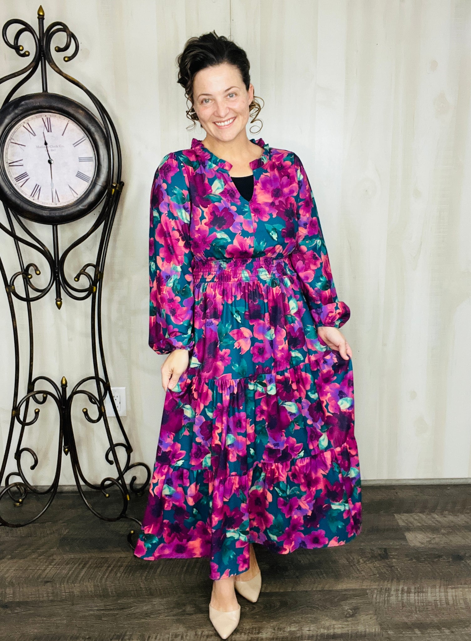This Smocked Waist Dress showcases a refined silhouette with its delicate frilled notch neckline and long bubble sleeves. Crafted from 100% polyester, the dress features a tiered midi-length design that moves gracefully with every step. The smocked waist adds a flattering fit, combining comfort with elegance for a timeless, sophisticated look.