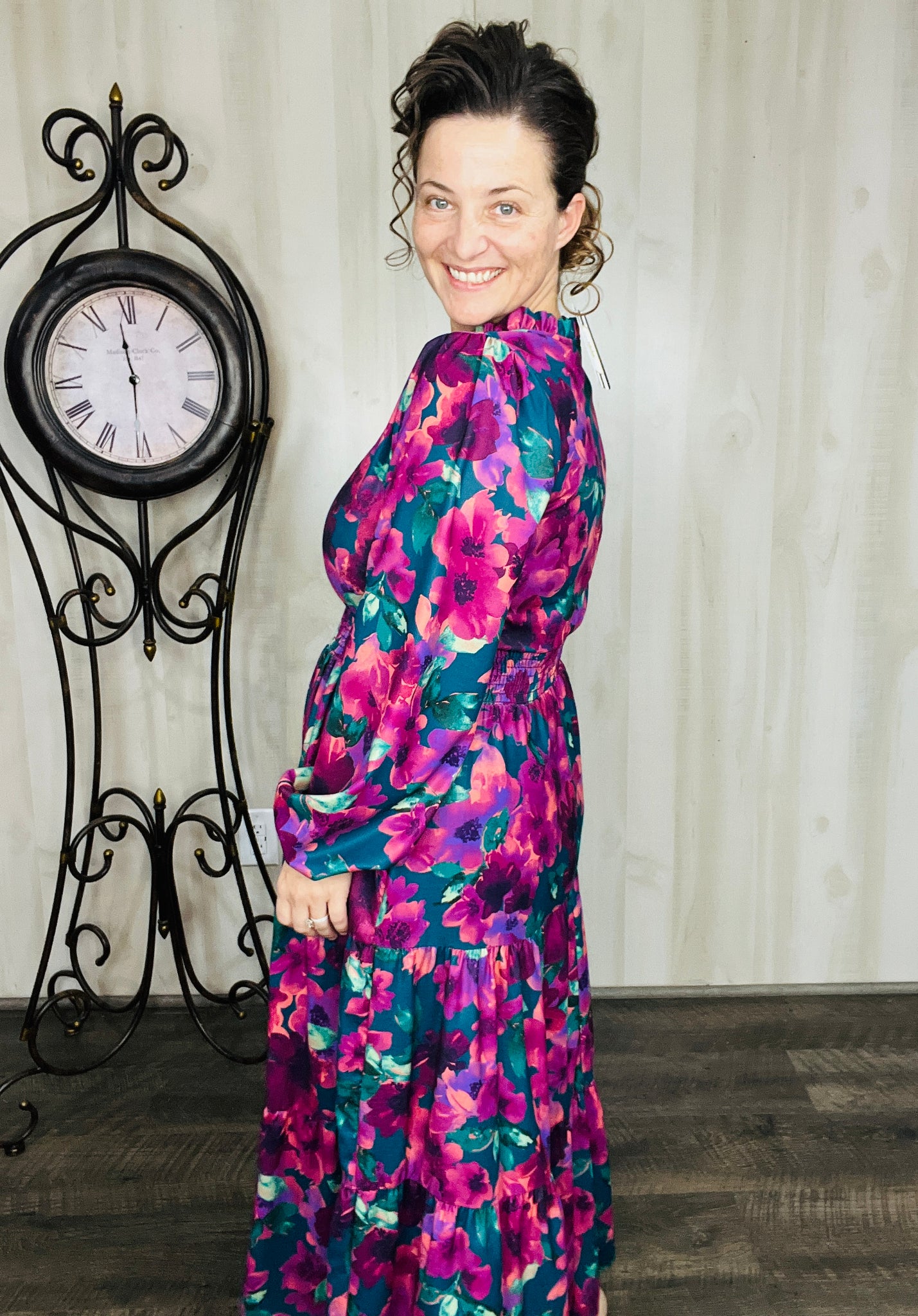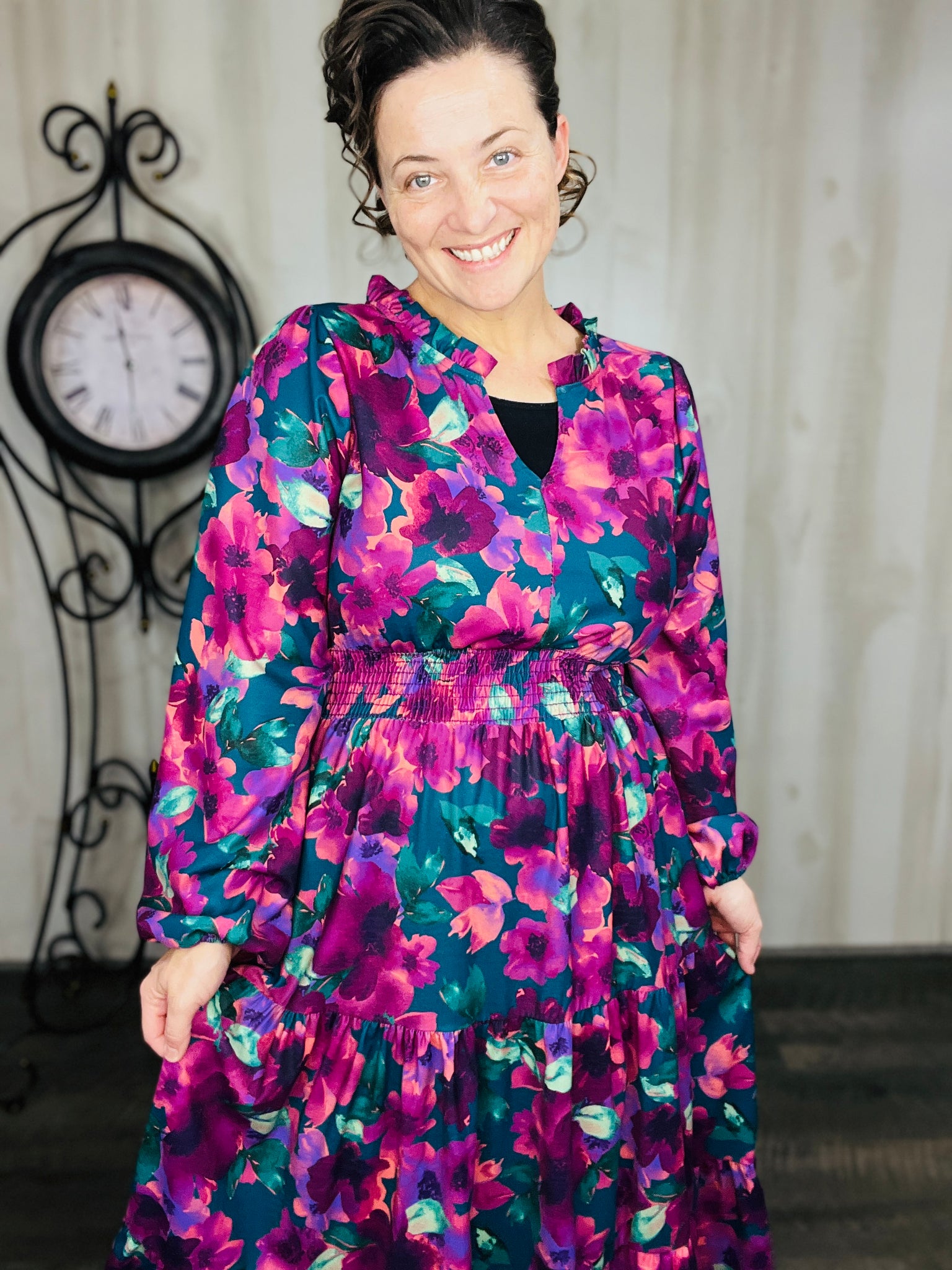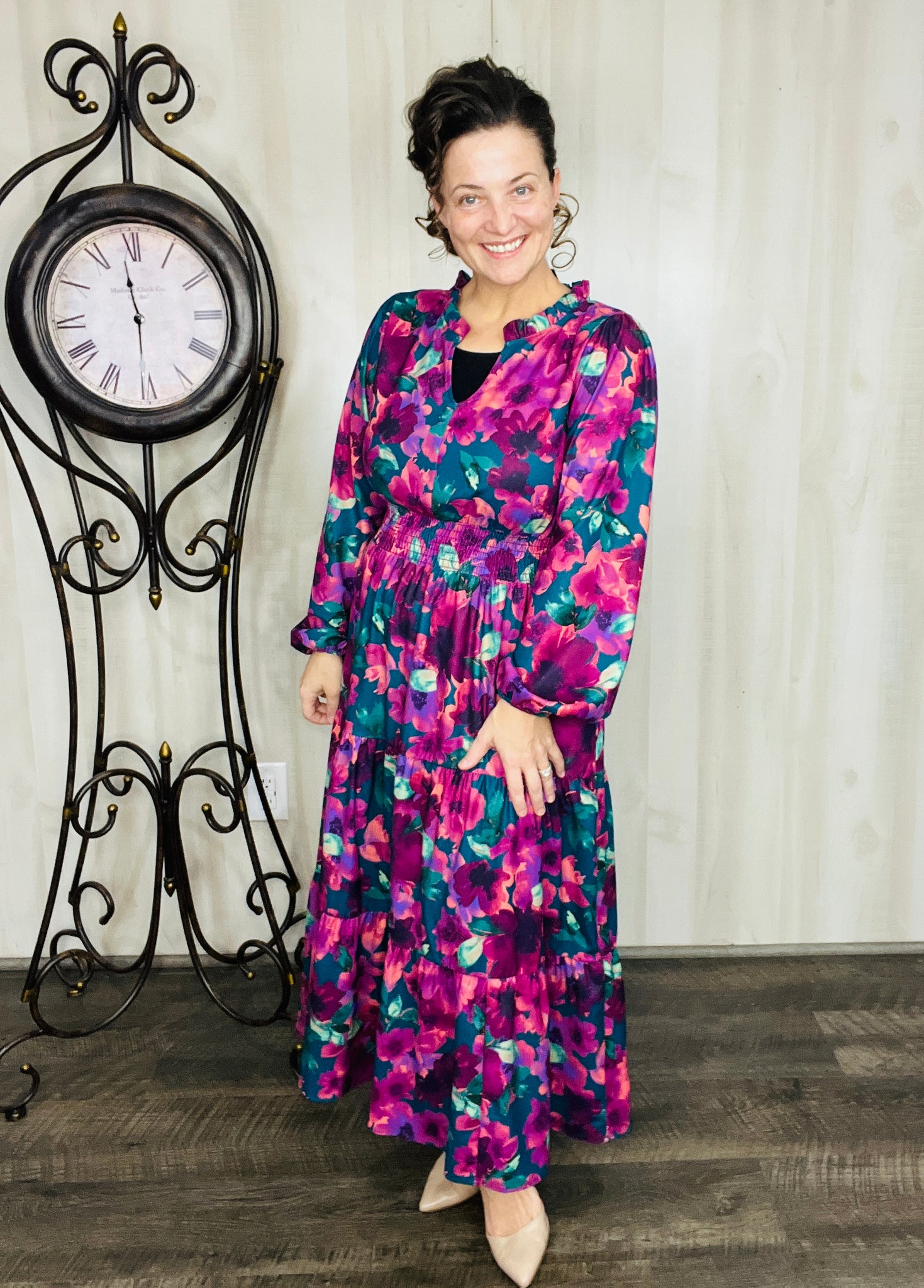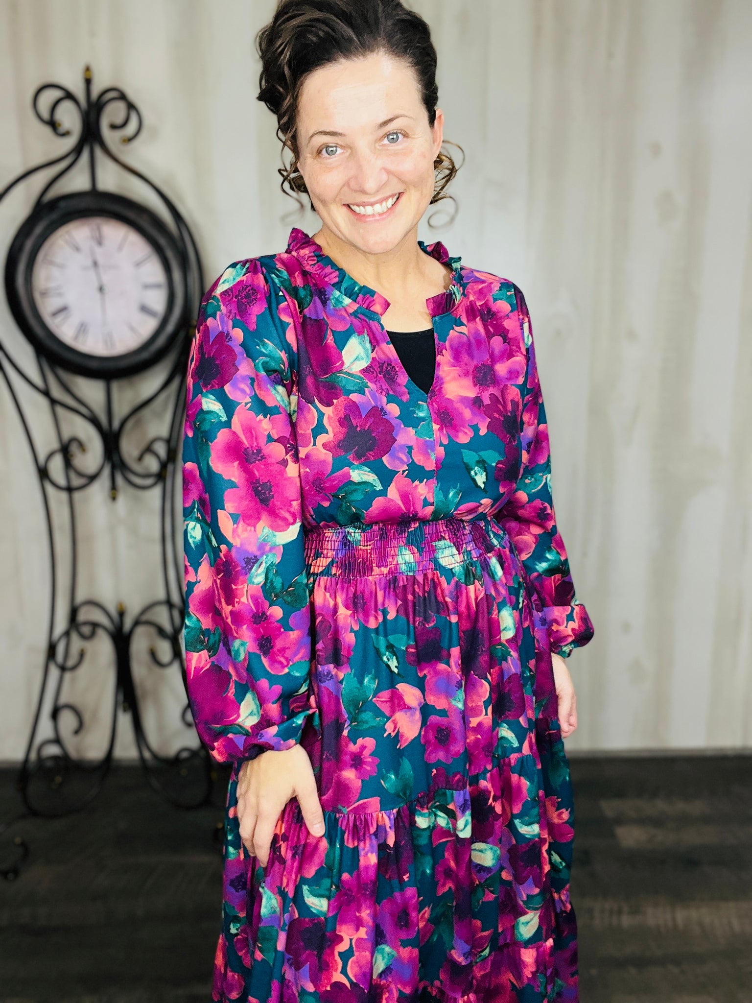 This Smocked Waist Dress showcases a refined silhouette with its delicate frilled notch neckline and long bubble sleeves. Crafted from 100% polyester, the dress features a tiered midi-length design that moves gracefully with every step. The smocked waist adds a flattering fit, combining comfort with elegance for a timeless, sophisticated look.