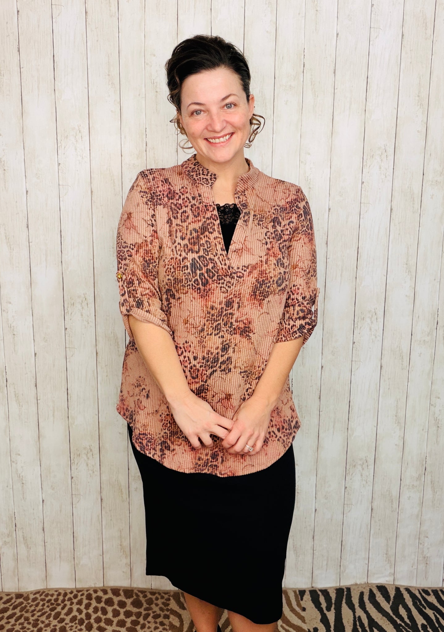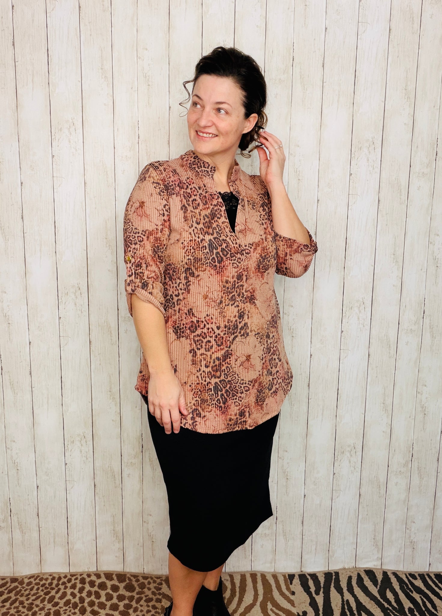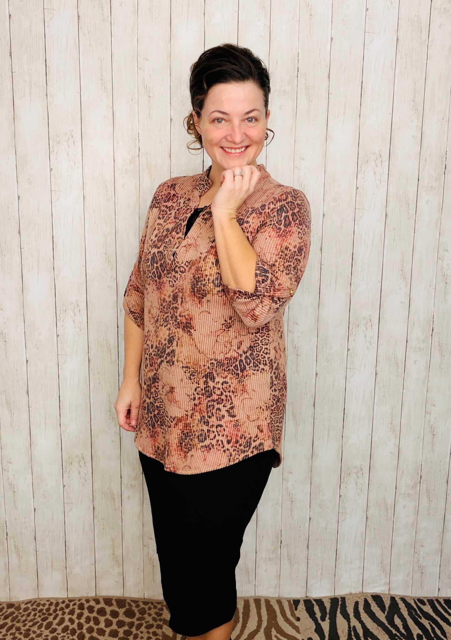 Crafted from a premium blend of 95% polyester and 5% spandex, this Jessica tunic combines comfort with contemporary style. The latte-toned base features an eye-catching animal print urban rib design that works seamlessly across seasons. Three-quarter length sleeves with functional roll-up buttons offer versatile styling options—wear them down for polished coverage or rolled up for a relaxed, layered look. The mandarin collar adds refined structure, making this piece equally at home in casual settings or dressed up for work. The spandex content ensures a gentle stretch for all-day wearability without sacrificing shape retention.