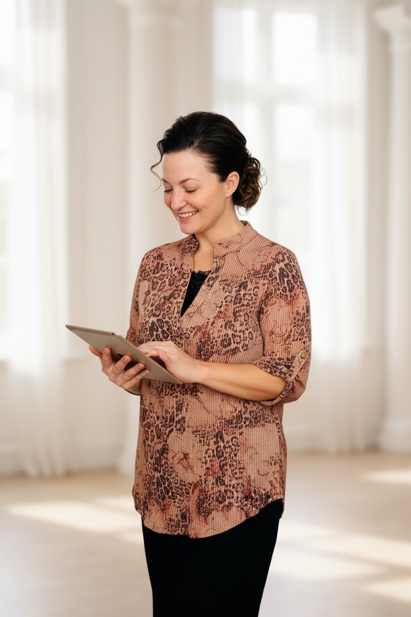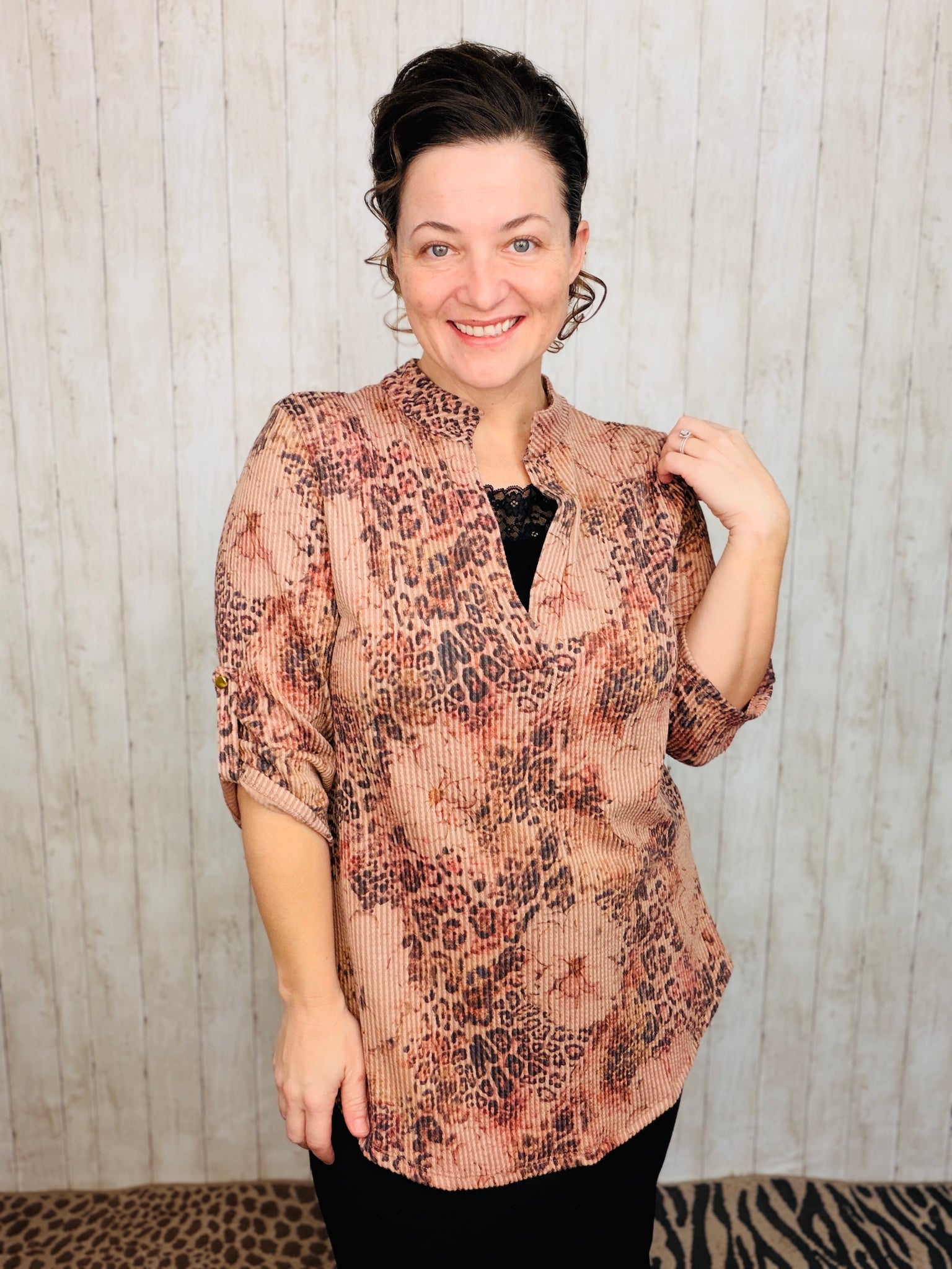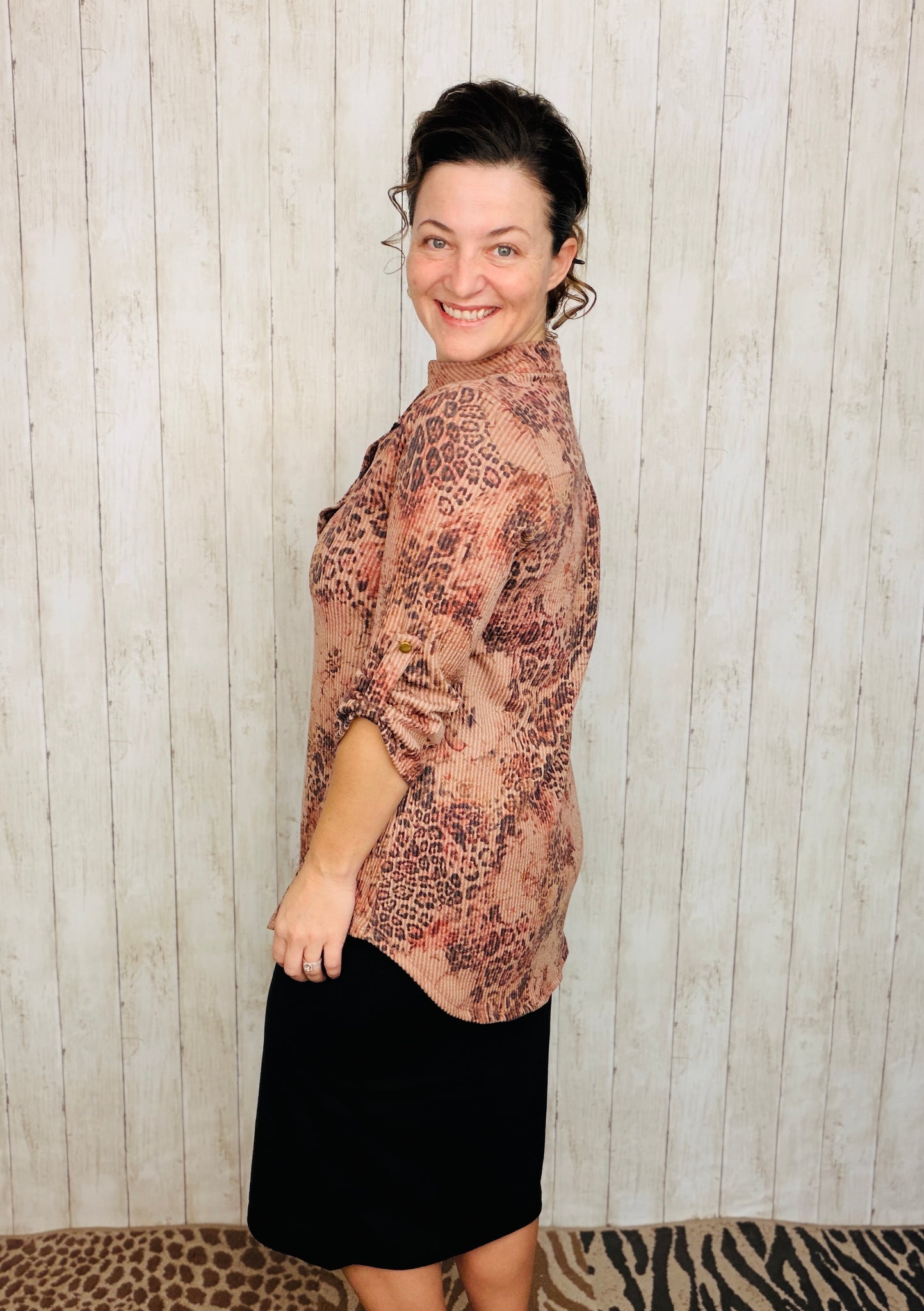 Crafted from a premium blend of 95% polyester and 5% spandex, this Jessica tunic combines comfort with contemporary style. The latte-toned base features an eye-catching animal print urban rib design that works seamlessly across seasons. Three-quarter length sleeves with functional roll-up buttons offer versatile styling options—wear them down for polished coverage or rolled up for a relaxed, layered look. The mandarin collar adds refined structure, making this piece equally at home in casual settings or dressed up for work. The spandex content ensures a gentle stretch for all-day wearability without sacrificing shape retention.