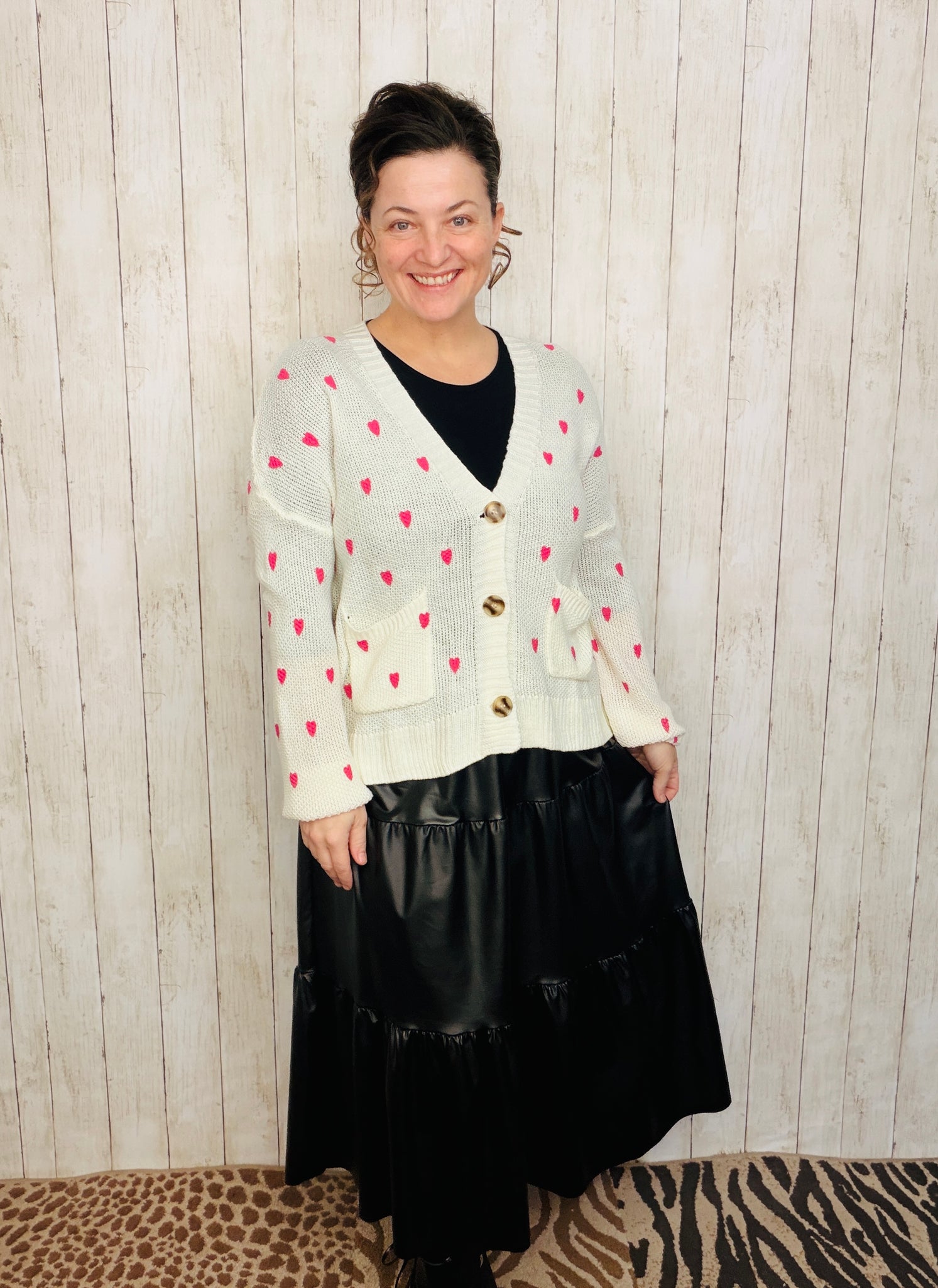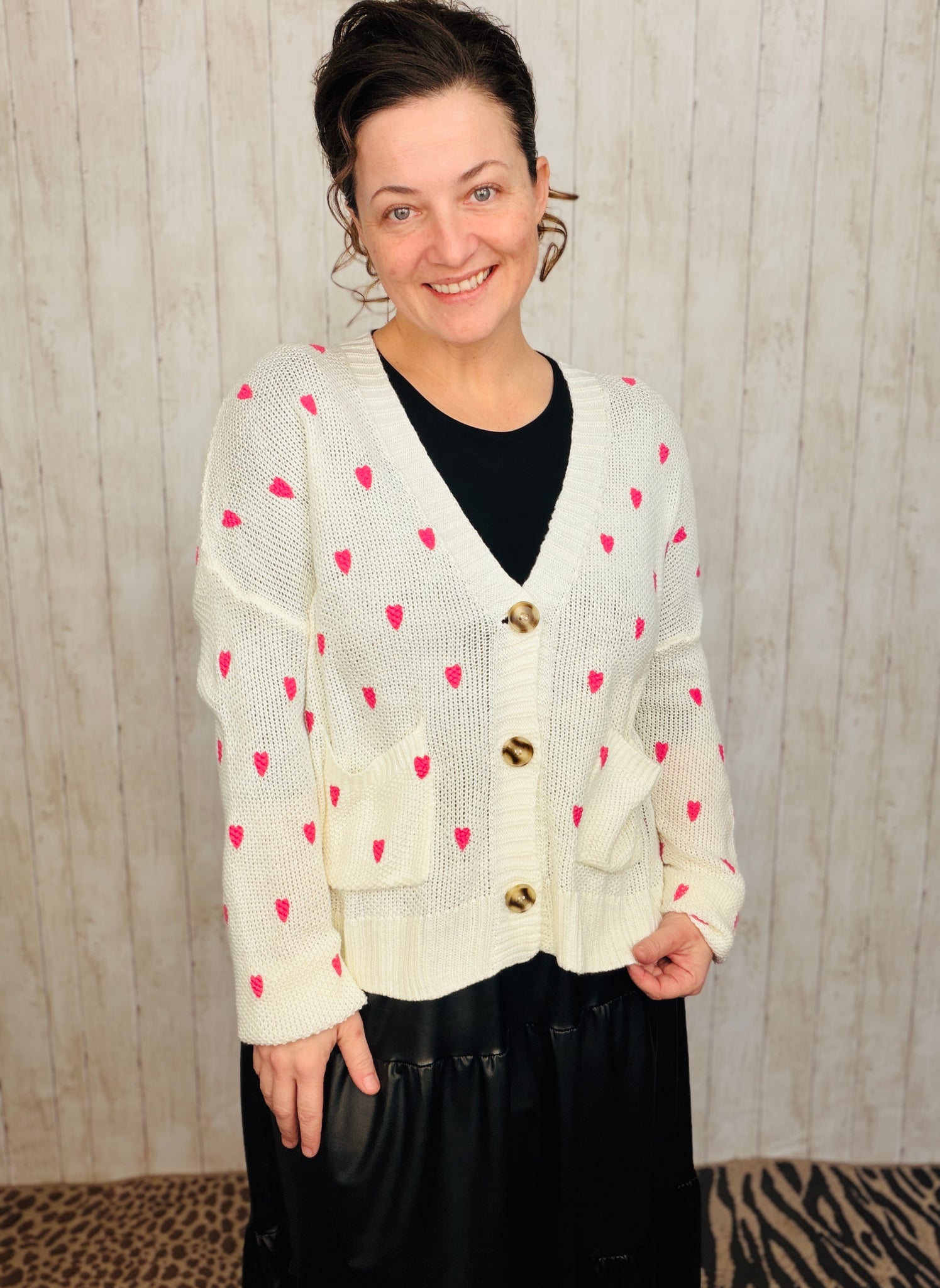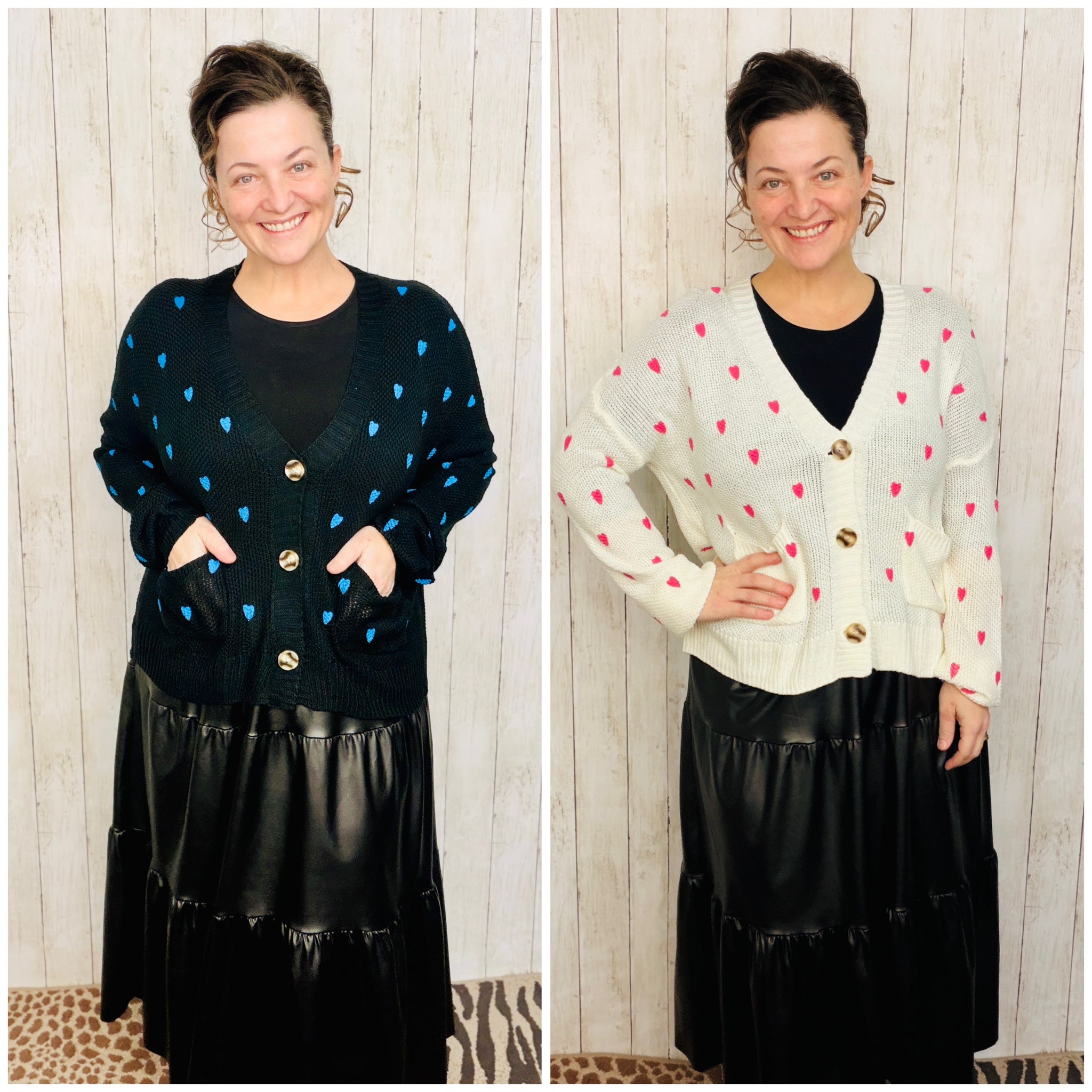 Elevate your everyday wardrobe with this charming cardigan, thoughtfully designed with delicate heart motifs woven throughout. Crafted from soft, comfortable fabric, it features long sleeves and a classic button-front closure for effortless layering. The refined silhouette works beautifully over dresses, tees, or worn as a standalone piece. Available in timeless black or cream to complement any palette.